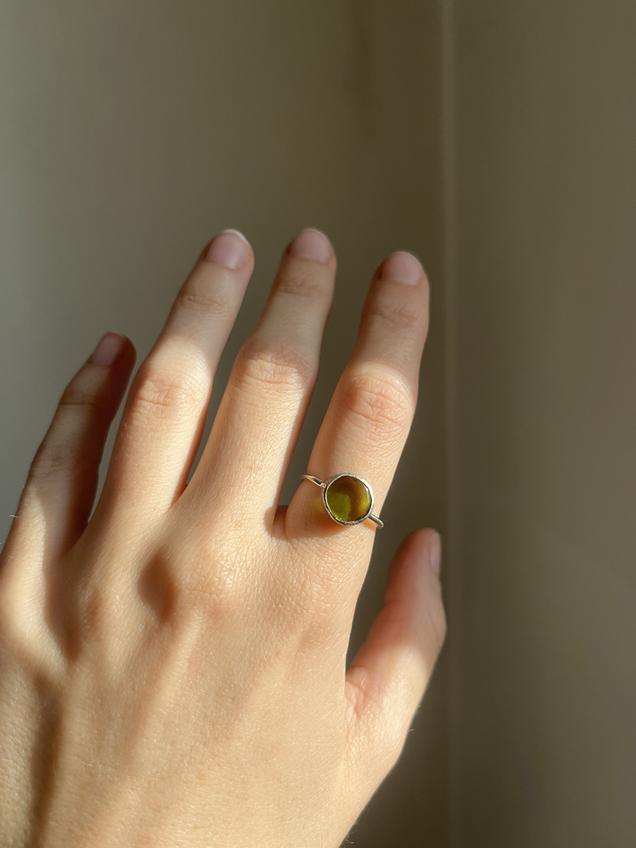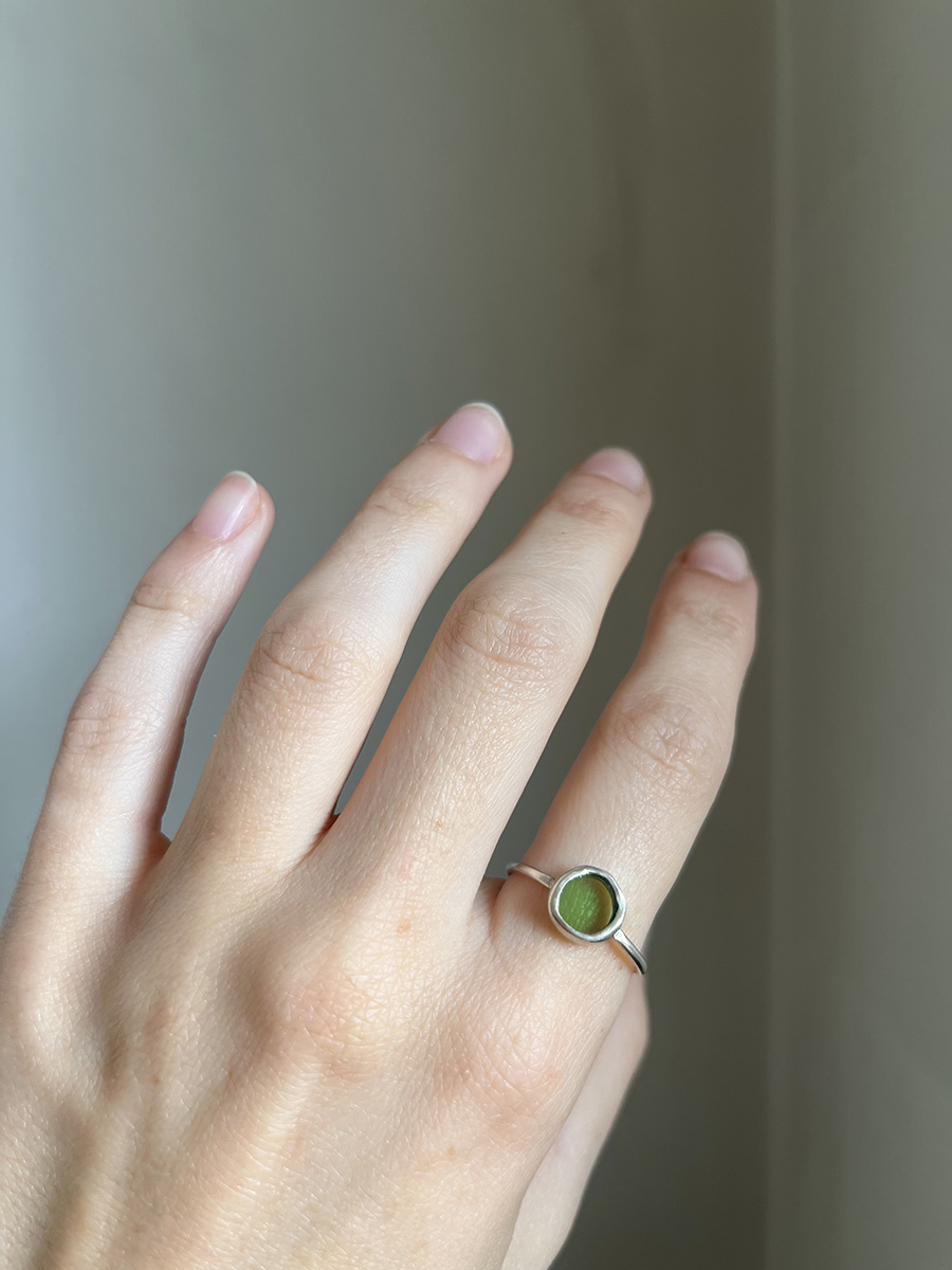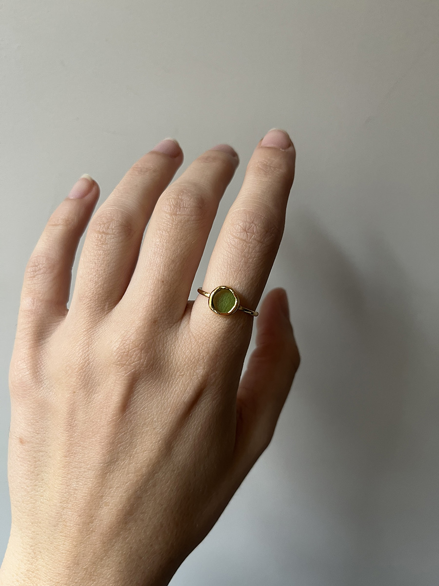 Anillo con vidrio reciclado, tallado y pulido artesanalmente.