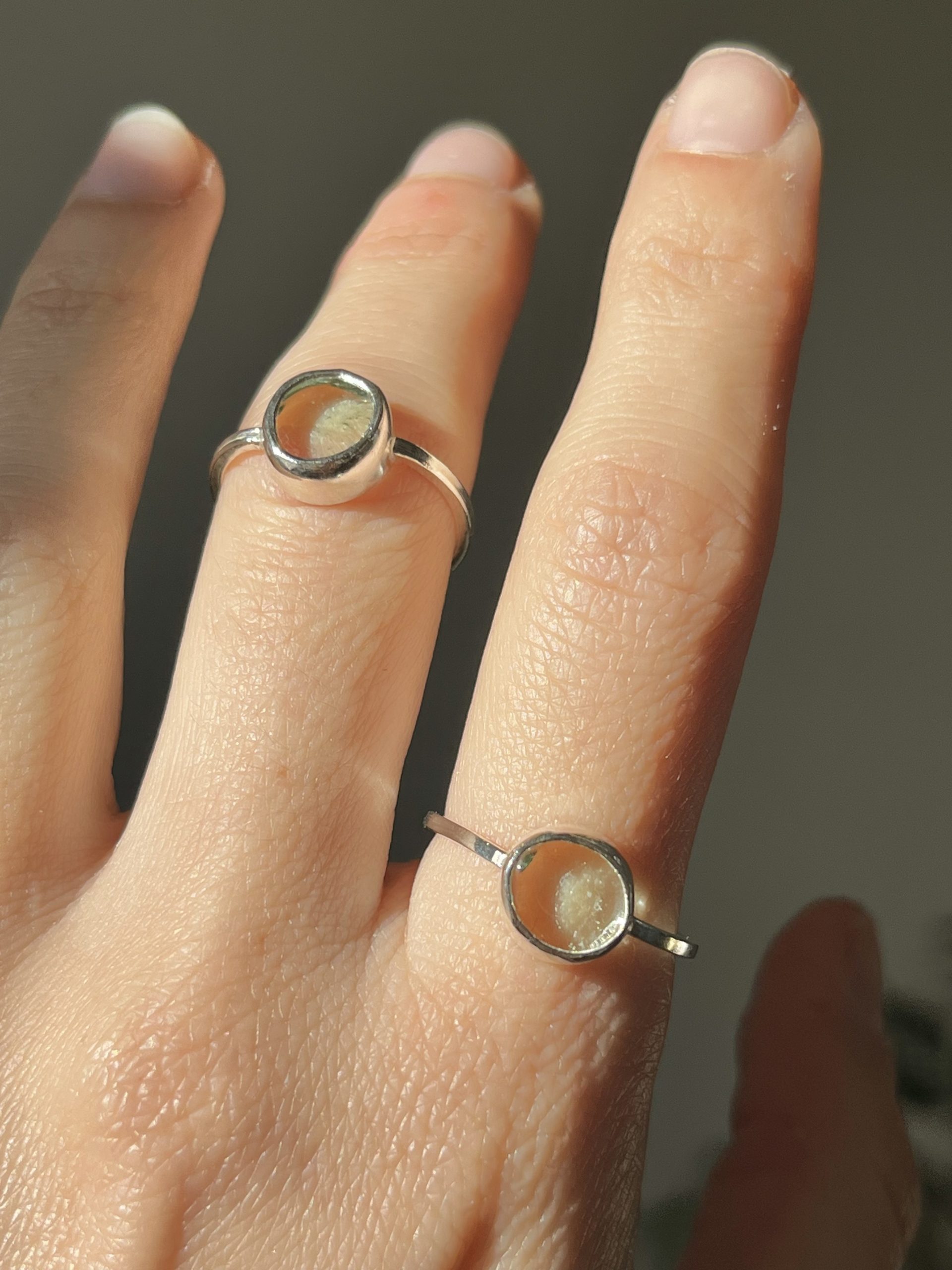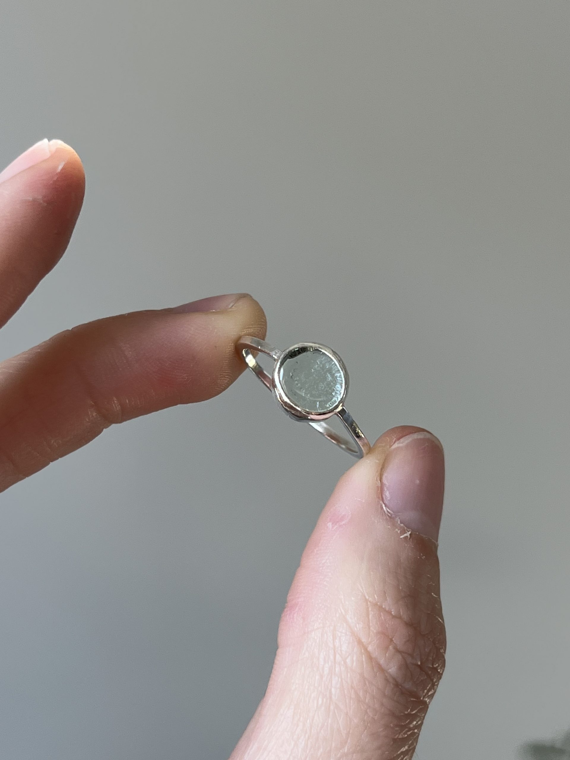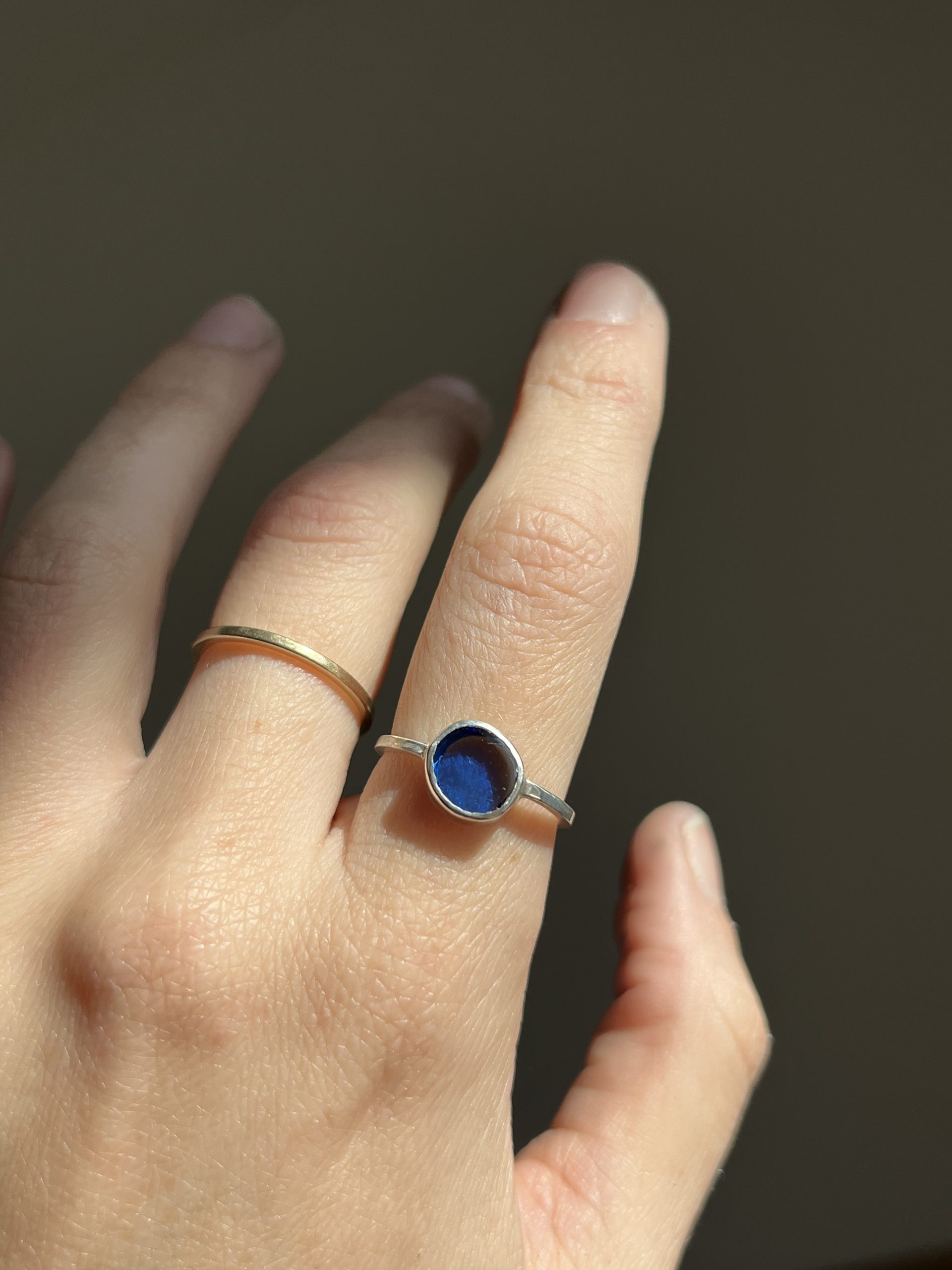 Anillo con vidrio reciclado, tallado y pulido artesanalmente.