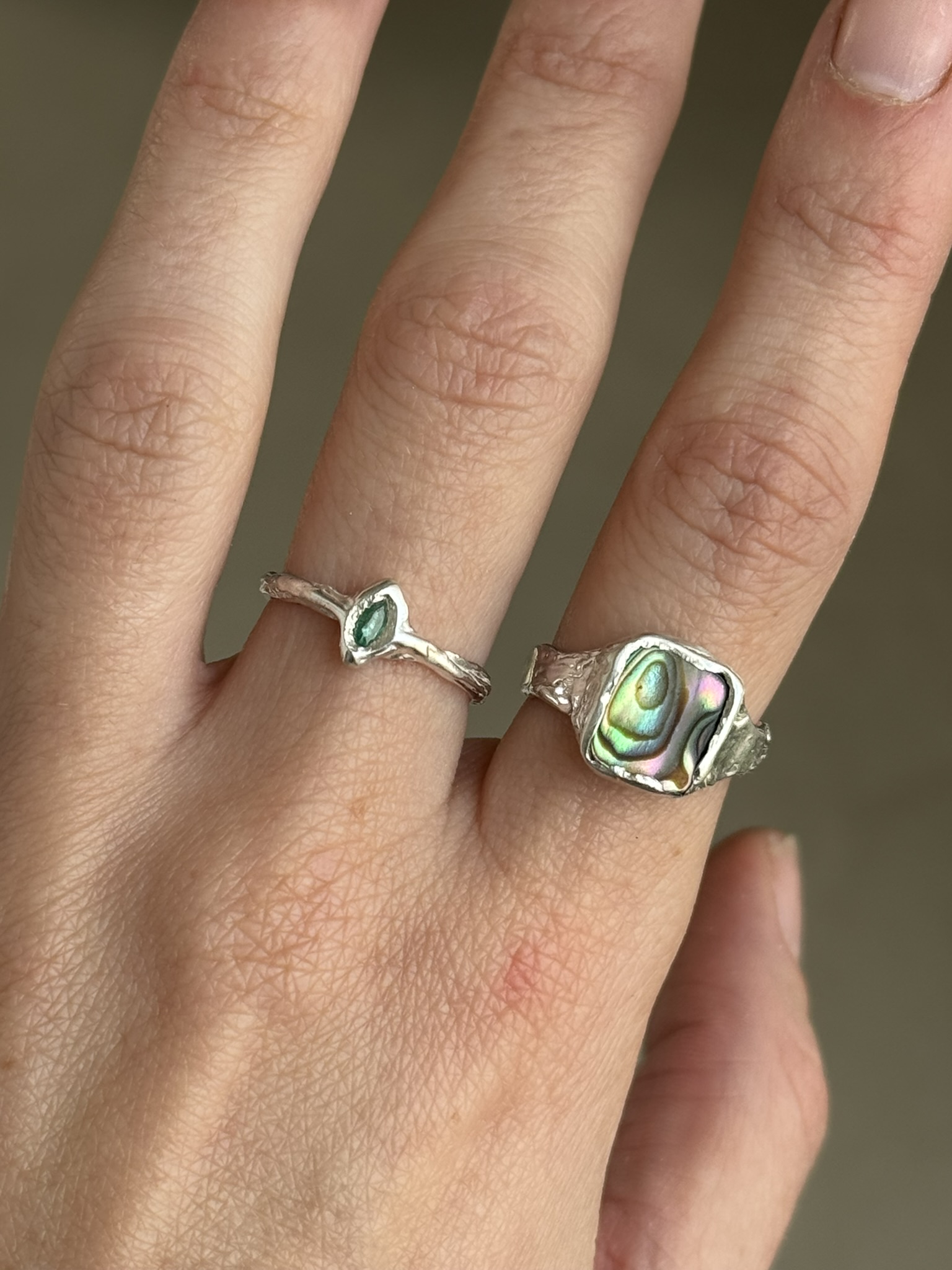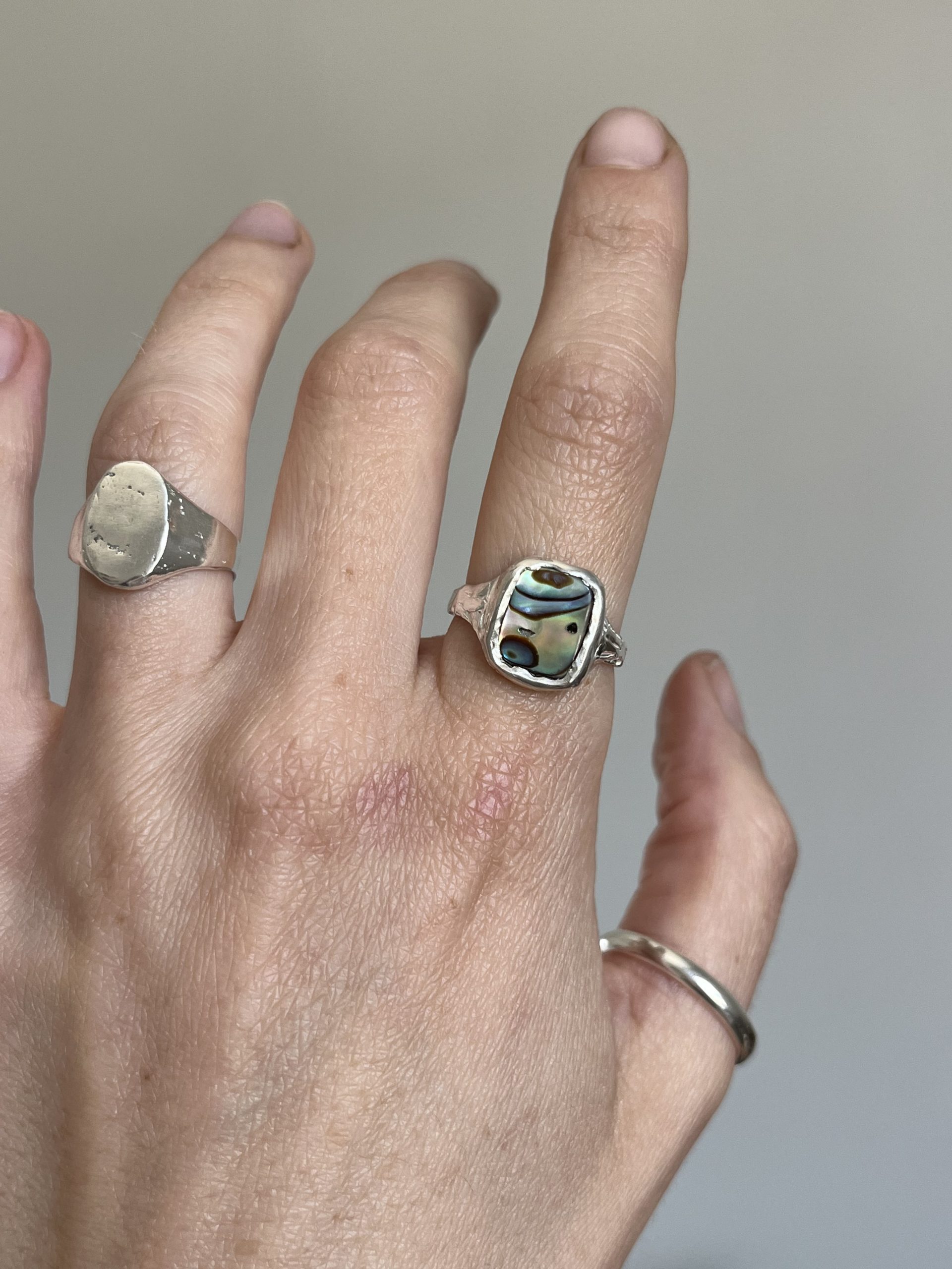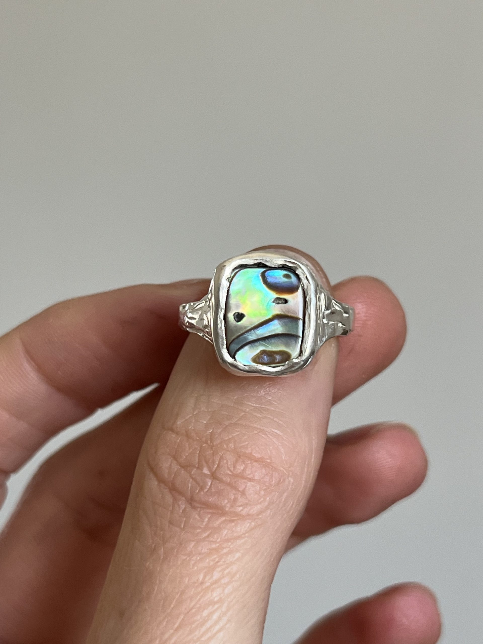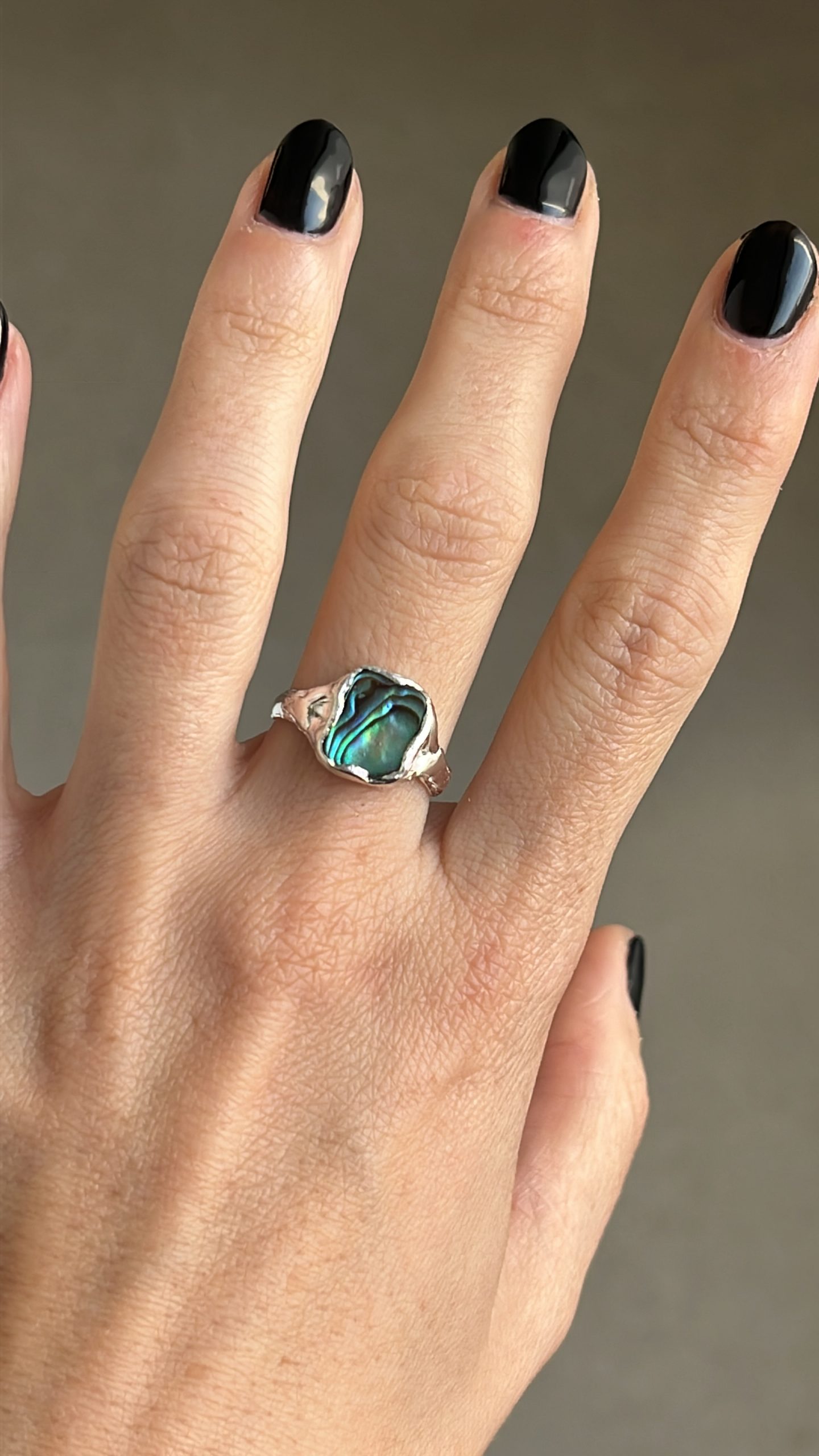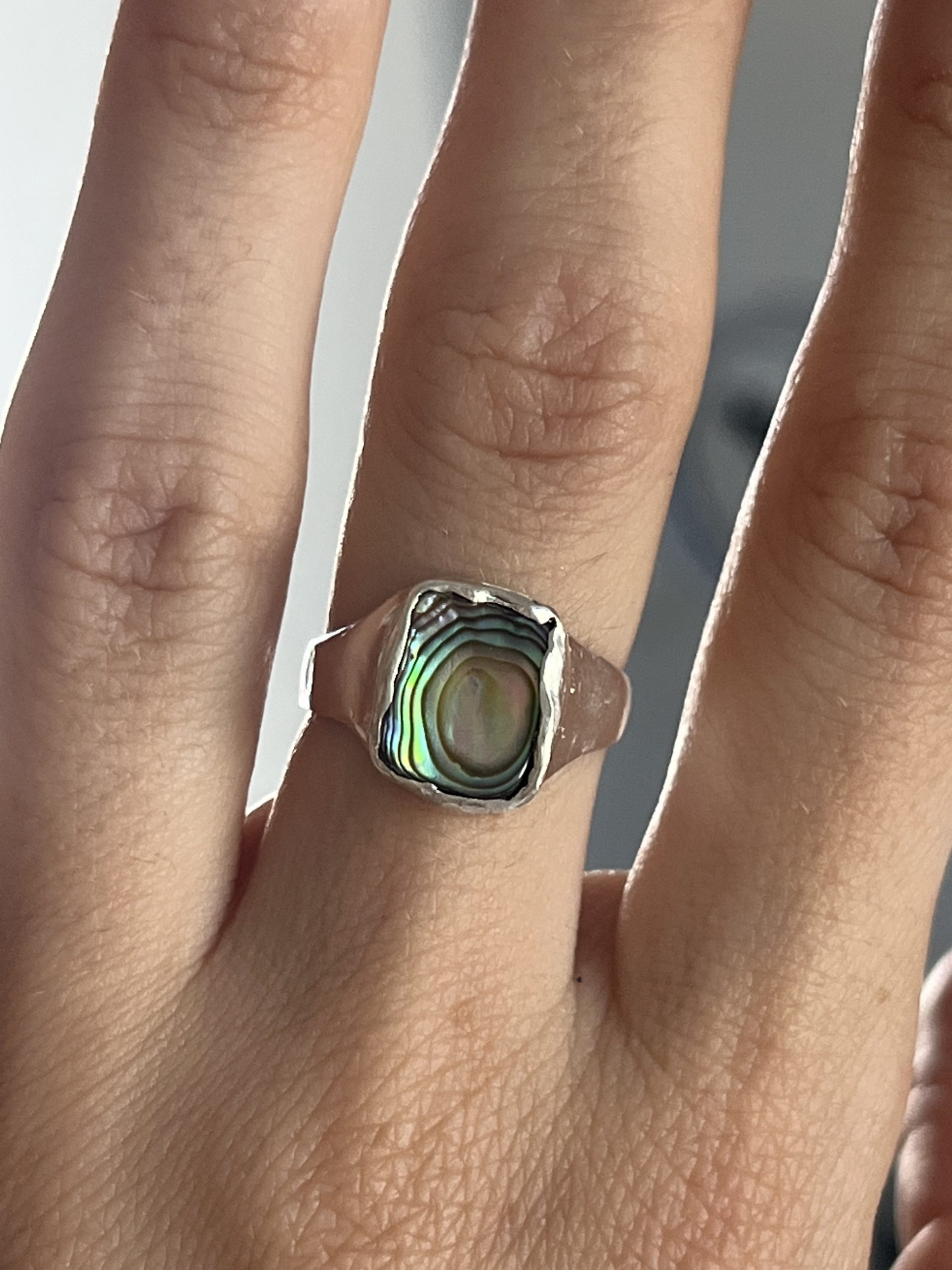 Anillo de textura orgánica y nácar. Por la naturaleza del abulón, cada pieza tendrá un patrón único, escríbeme si quieres que te enseñe los que hay disponibles y seleccionas el que más te guste.