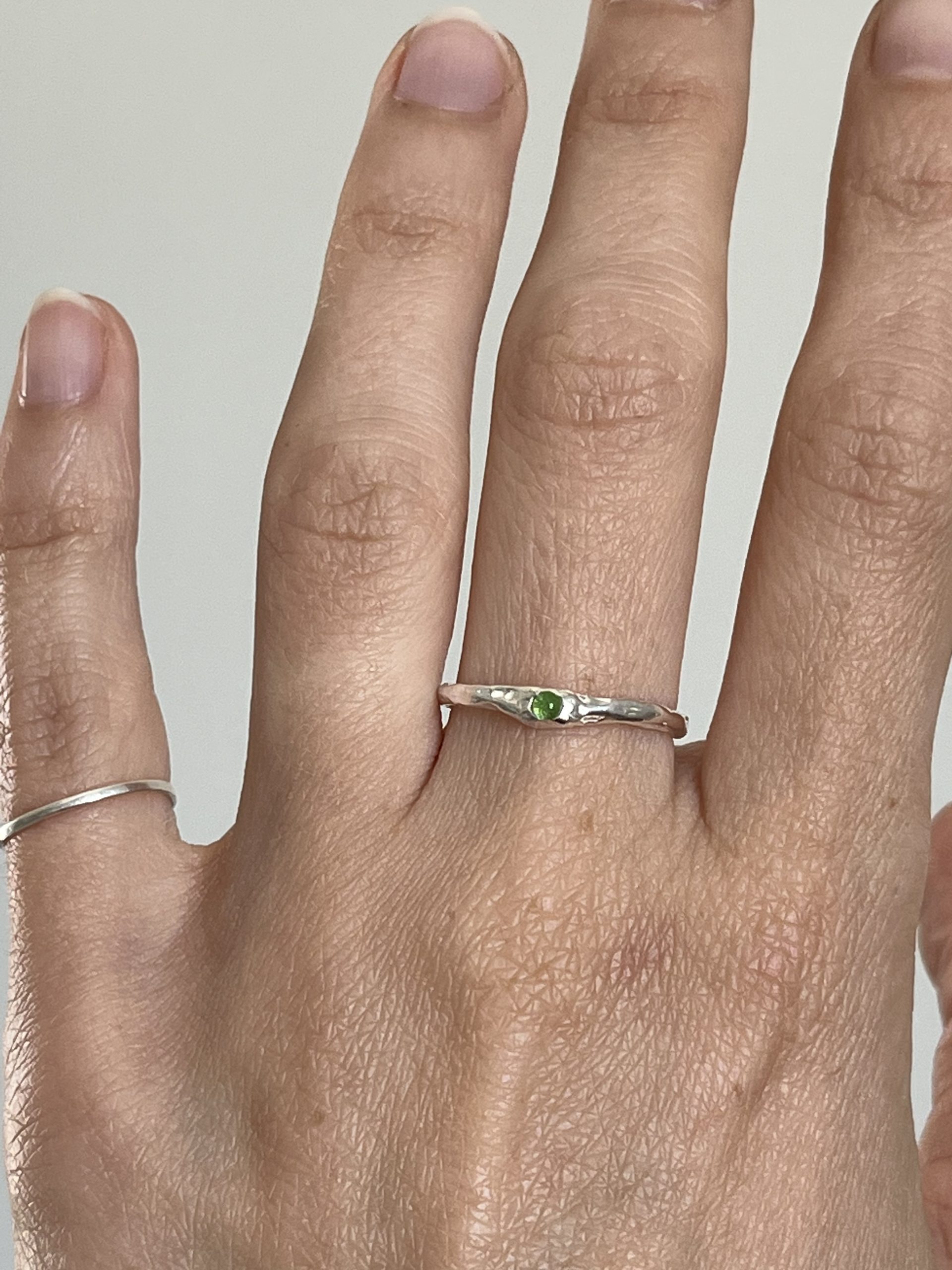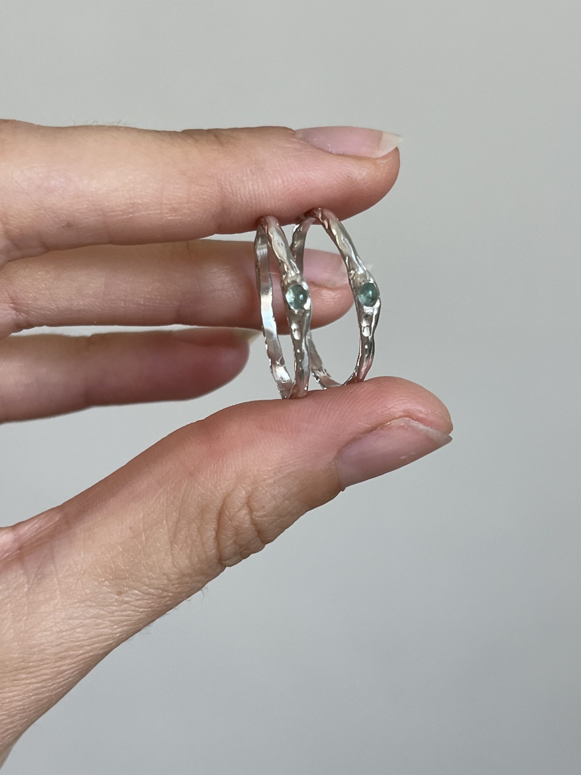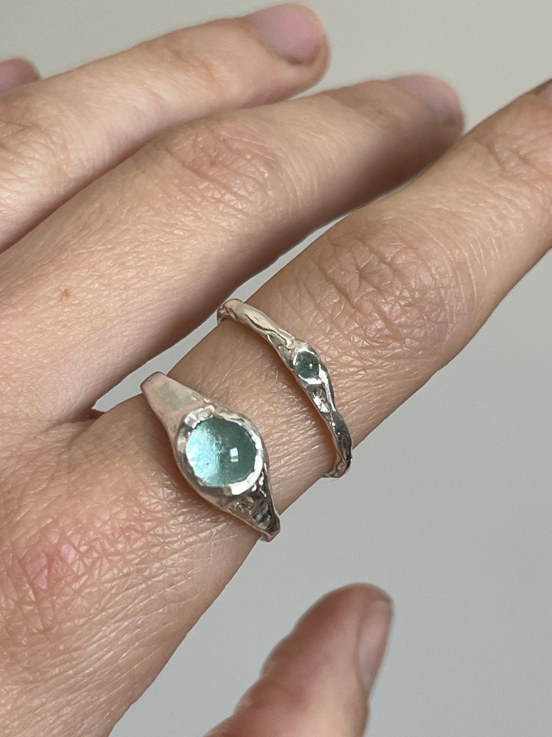 Anillo con forma orgánica, fino y un pequeño vidrio reciclado. También lo puedes personalizar si prefieres que sea solo de plata, sin vidrio.