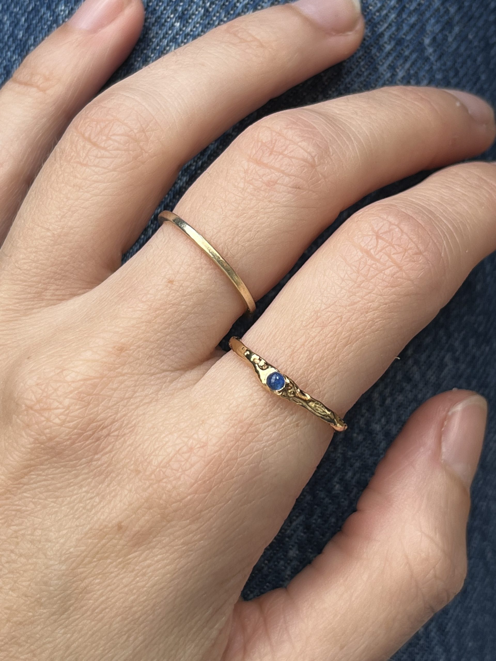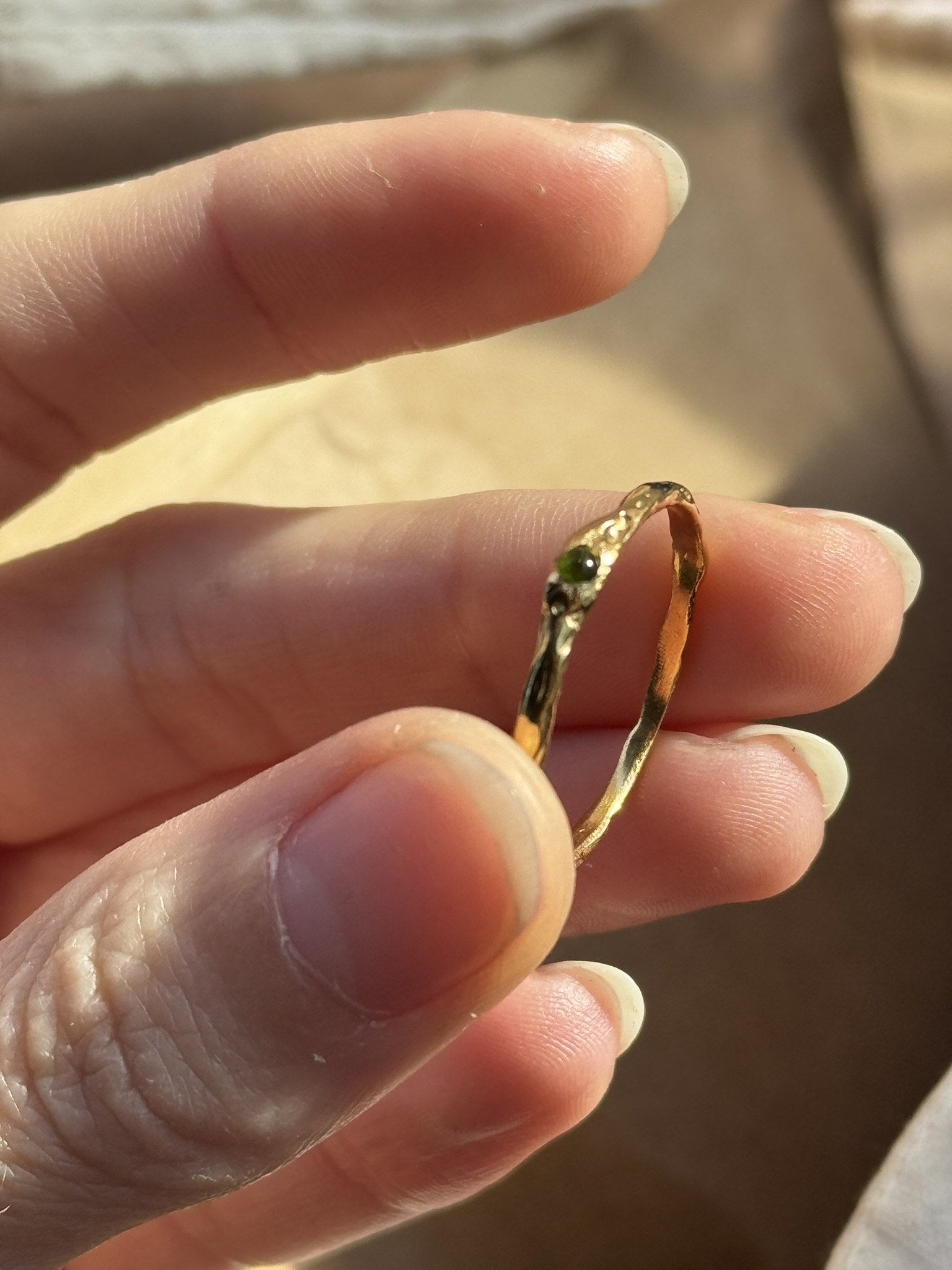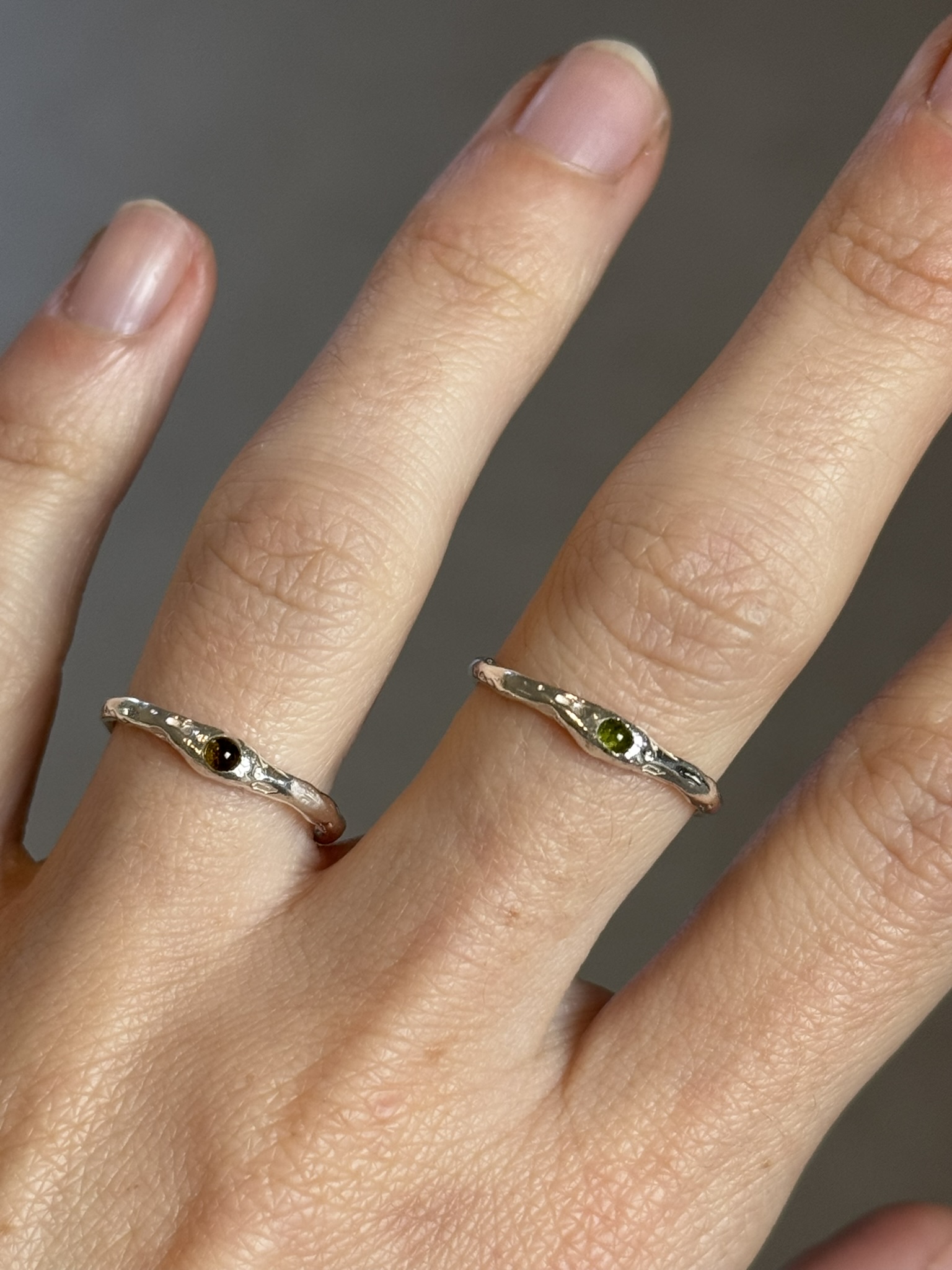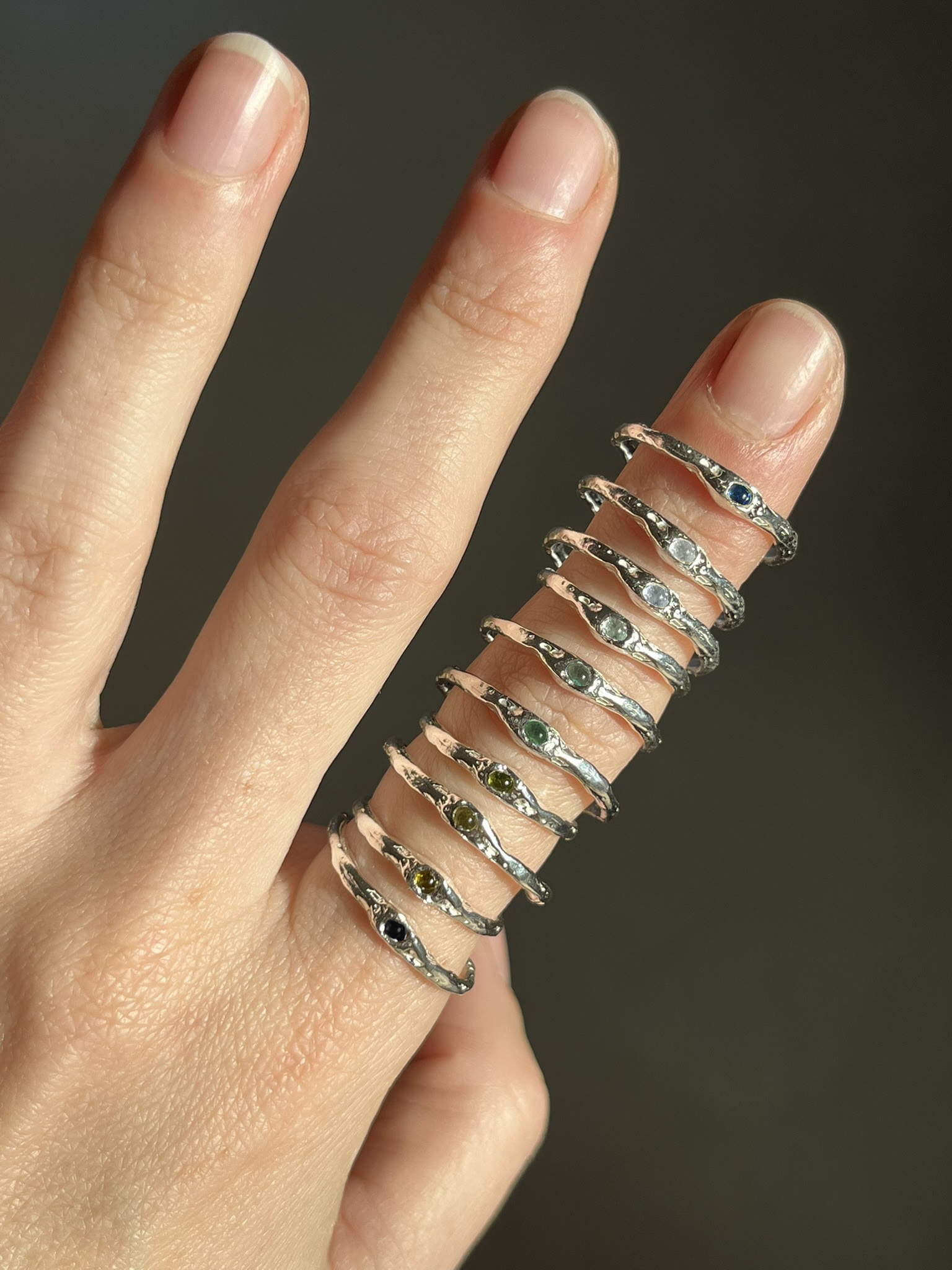 Anillo con forma orgánica, fino y un pequeño vidrio reciclado. También lo puedes personalizar si prefieres que sea solo de plata, sin vidrio.