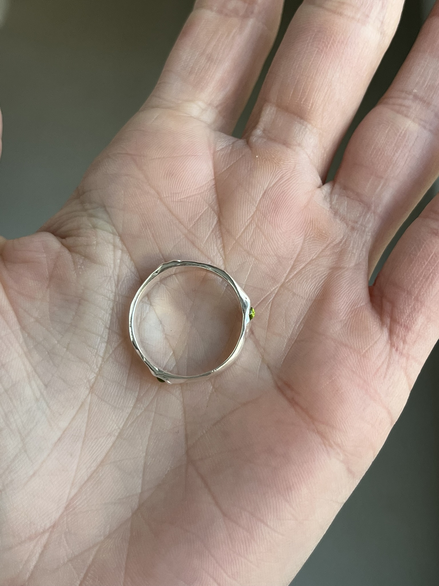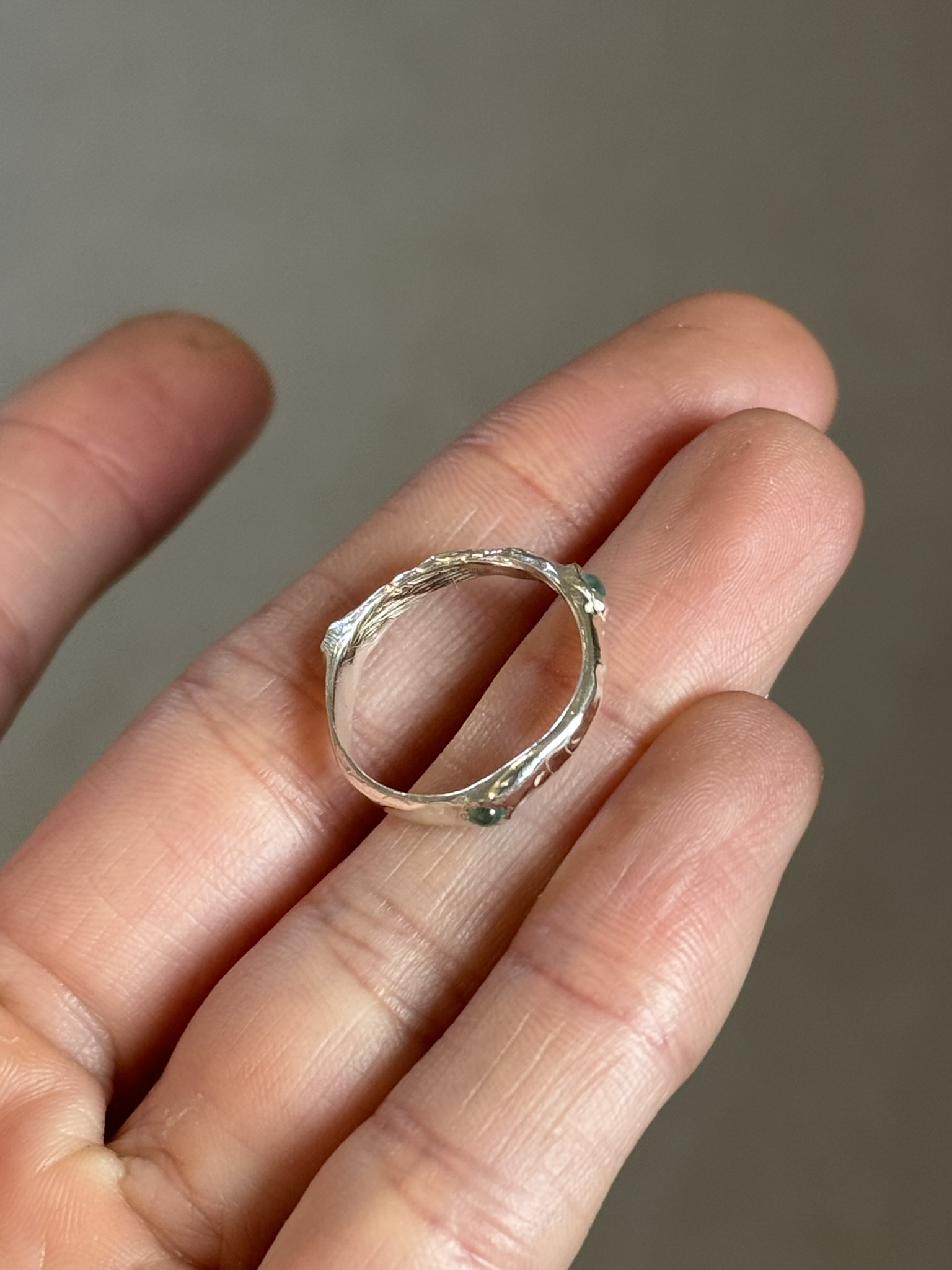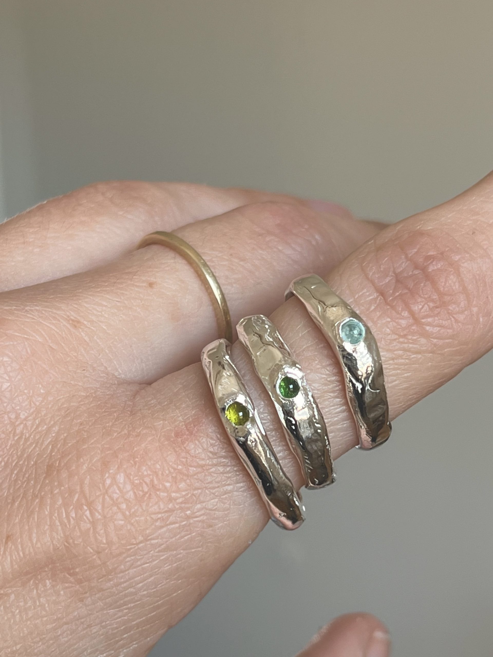 Anillo orgánico hecho con plata y 3 pequeños vidrios reciclados. Puedes escribirme desde el campo de notas o en “personaliza tu joya” para hacer una combinación de colores.