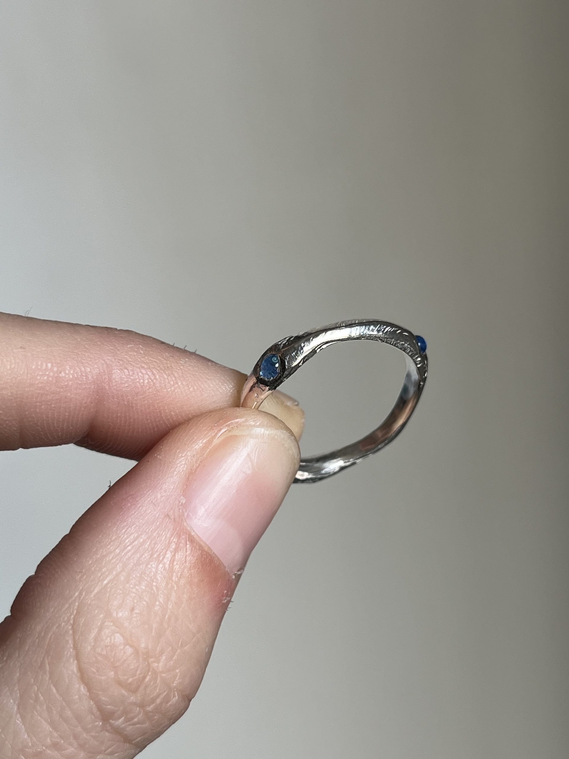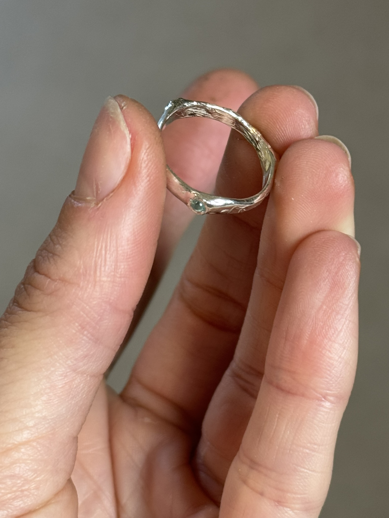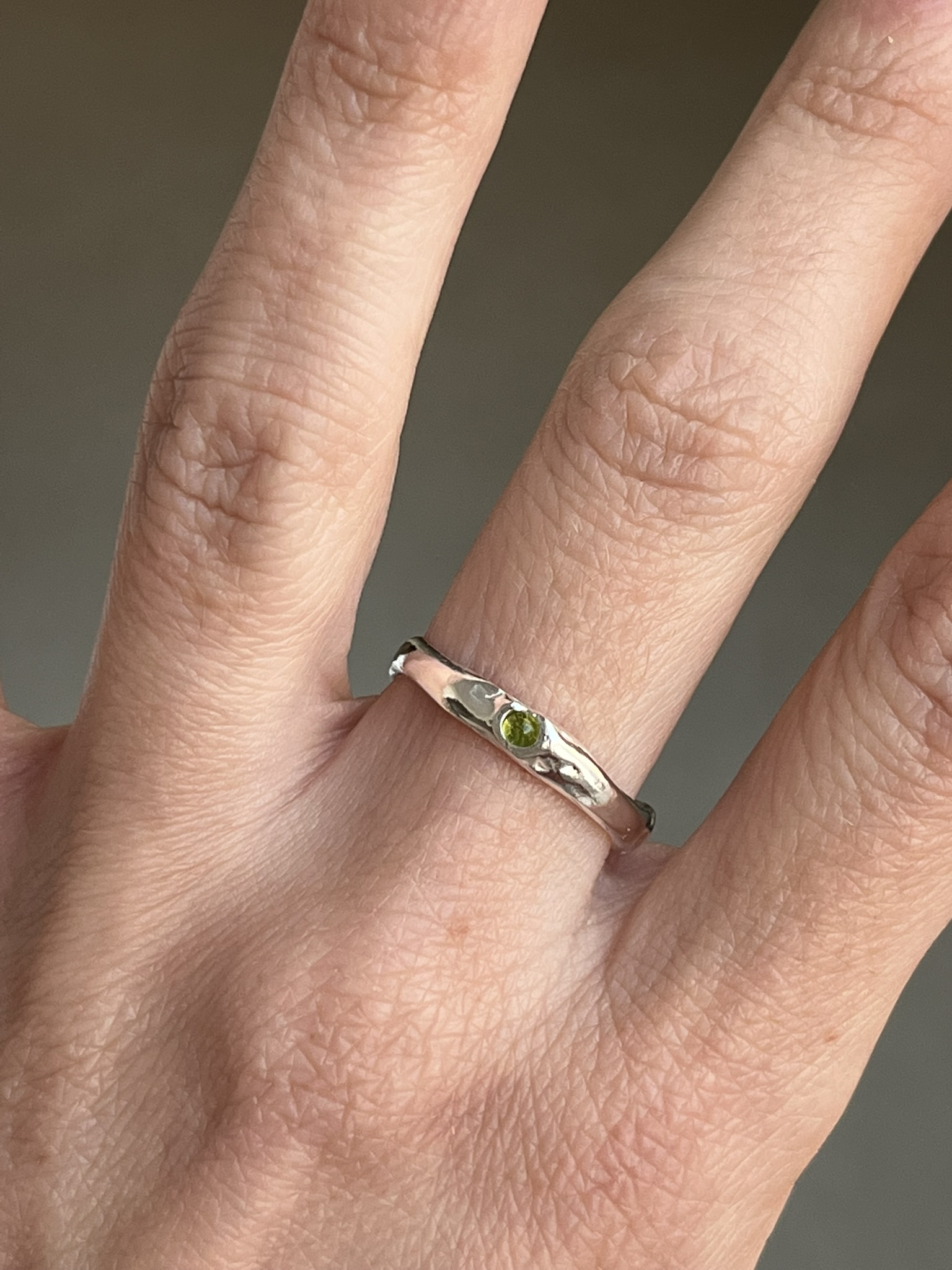 Anillo orgánico hecho con plata y 3 pequeños vidrios reciclados. Puedes escribirme desde el campo de notas o en “personaliza tu joya” para hacer una combinación de colores.