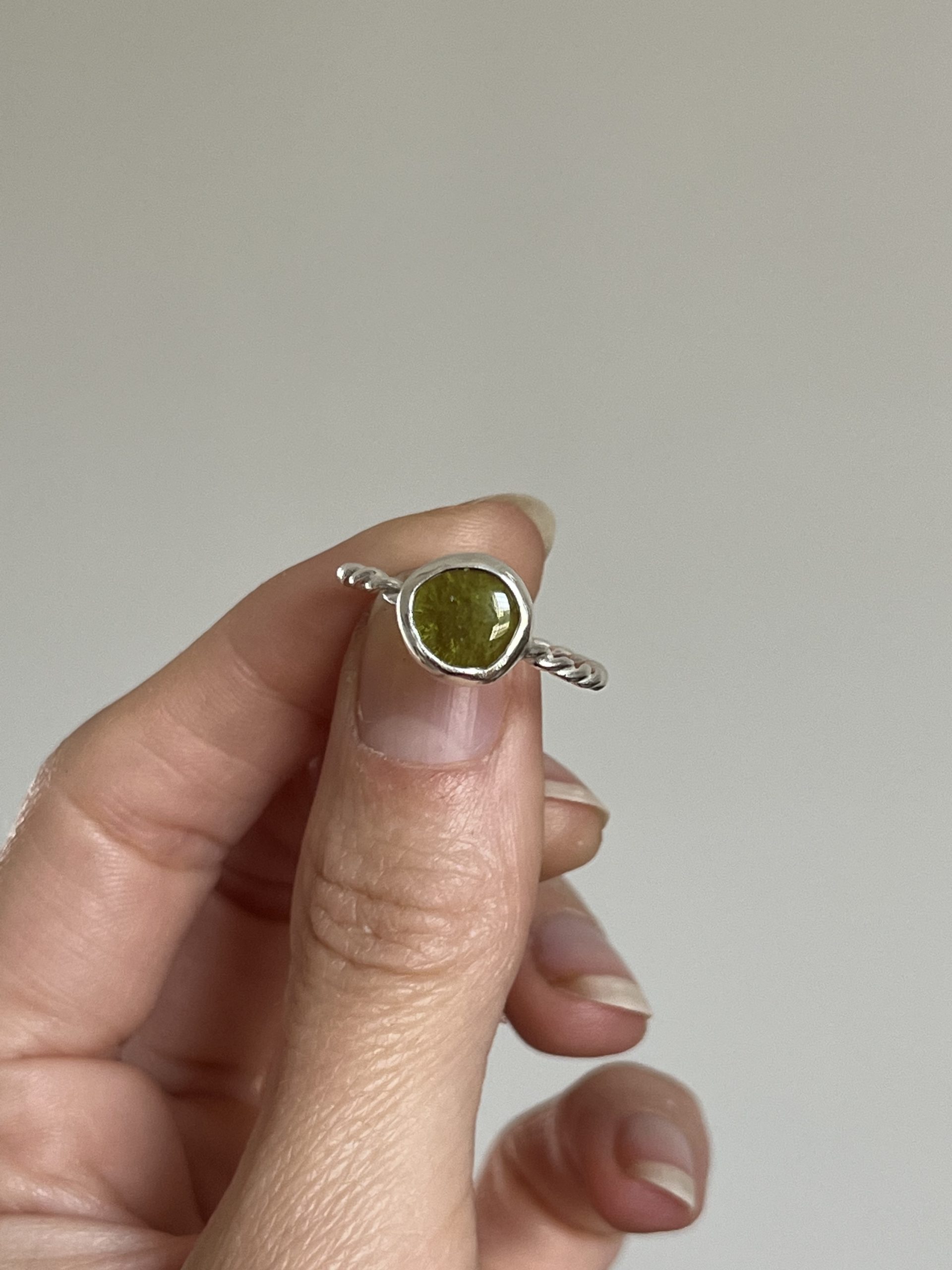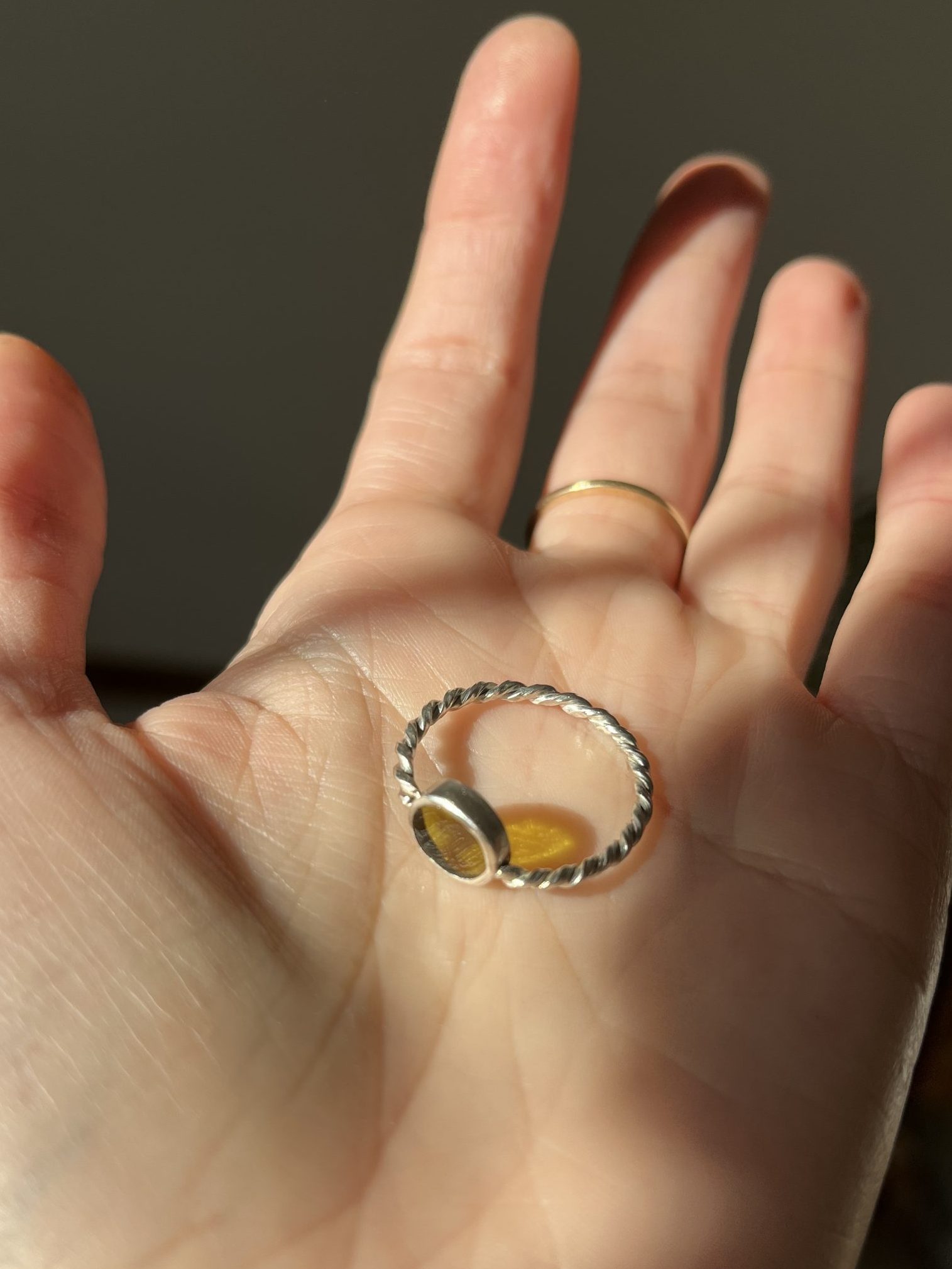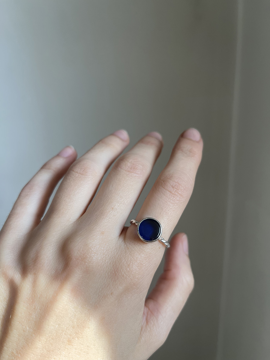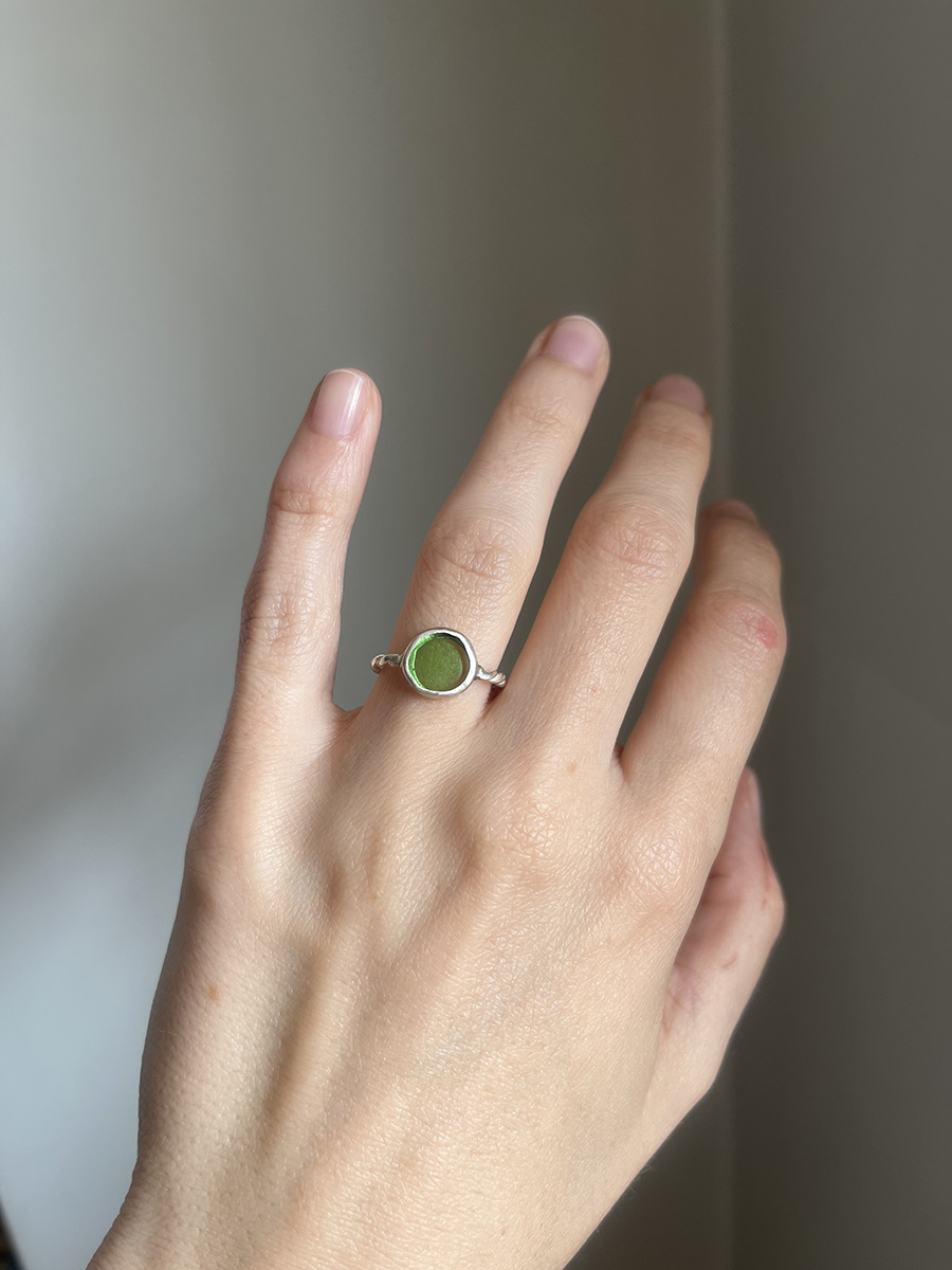 Anillo con vidrio reciclado, tallado y pulido artesanalmente. Banda trenzada.