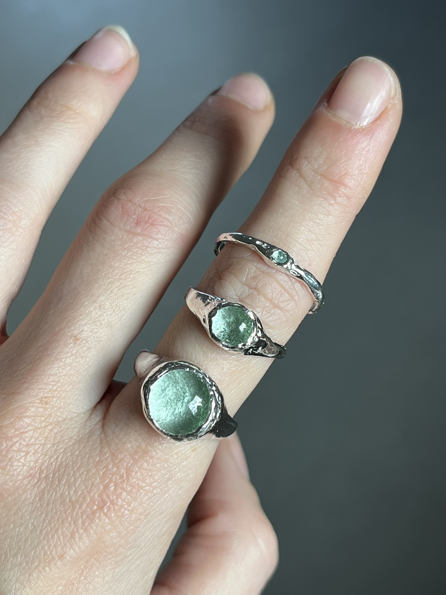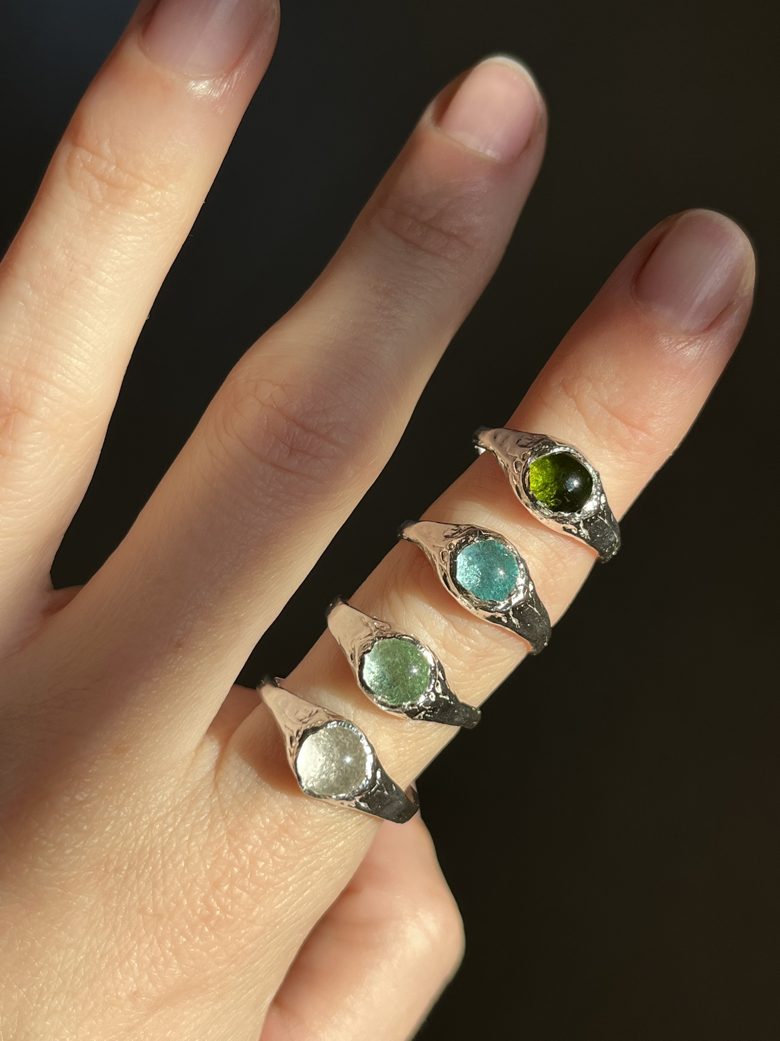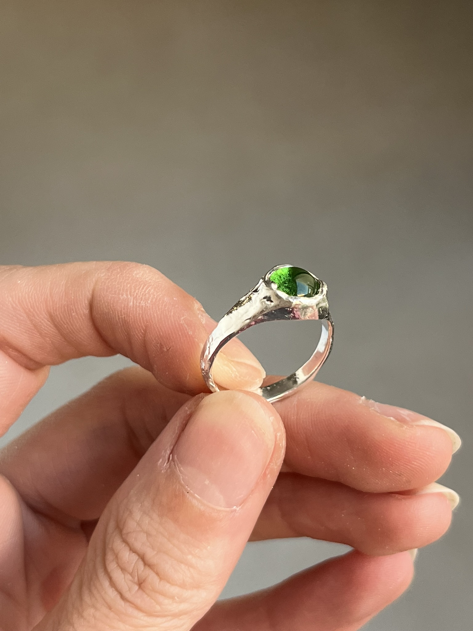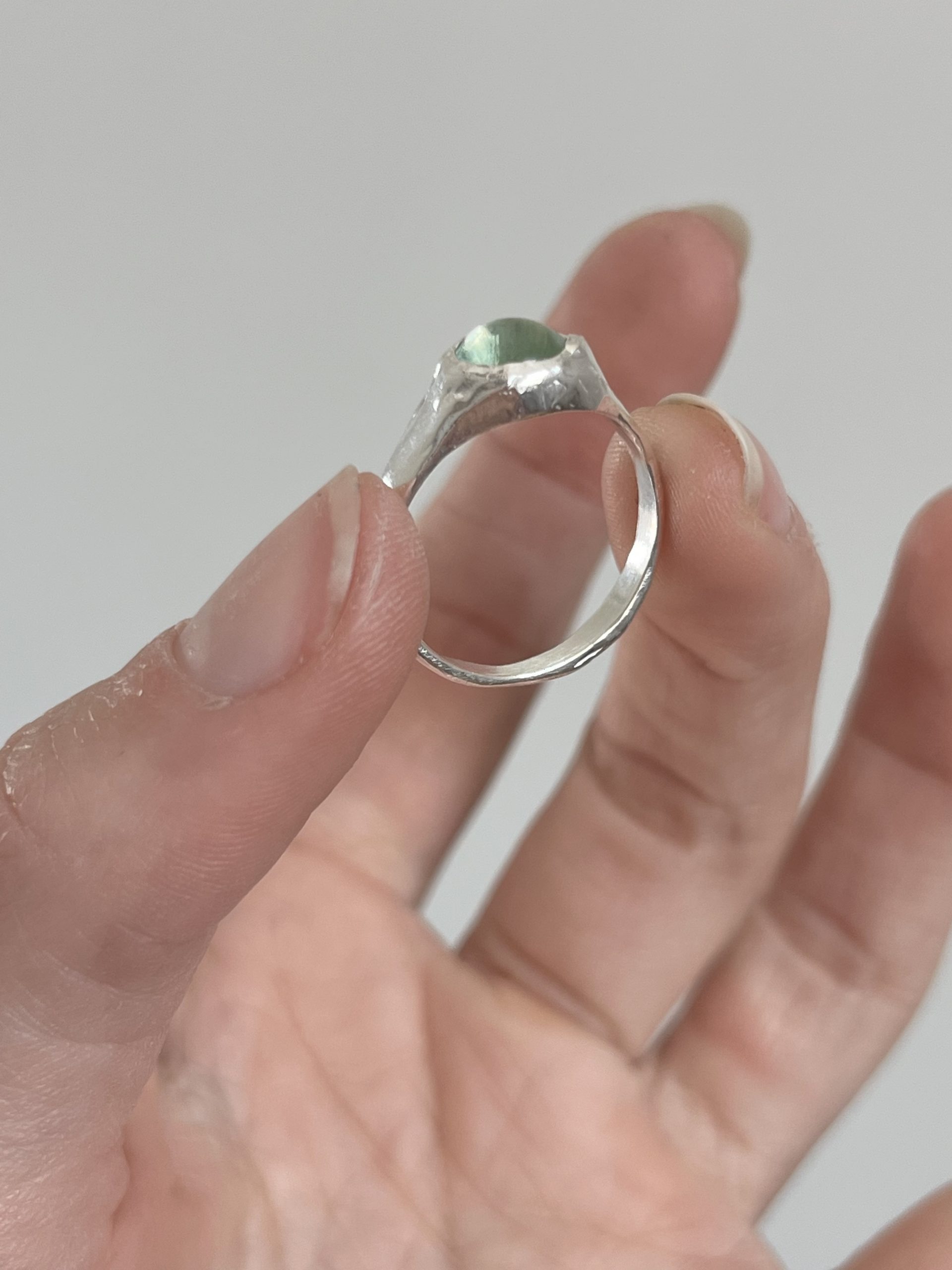 Anillo de textura orgánica y vidrio reciclado en forma de cabujón. Este diseño está realizado mediante diferentes procesos artesanales, lo que hace cada pieza única.