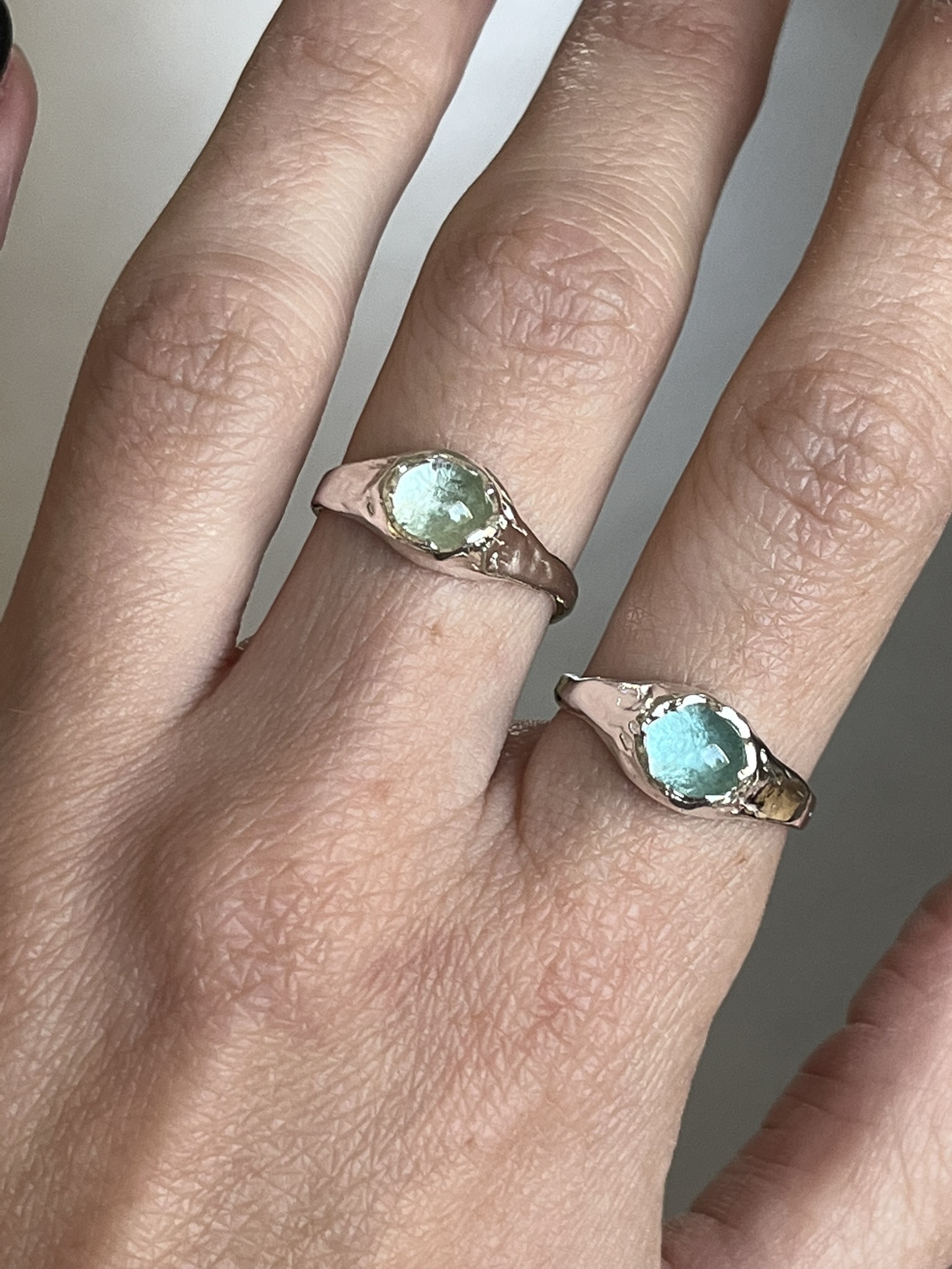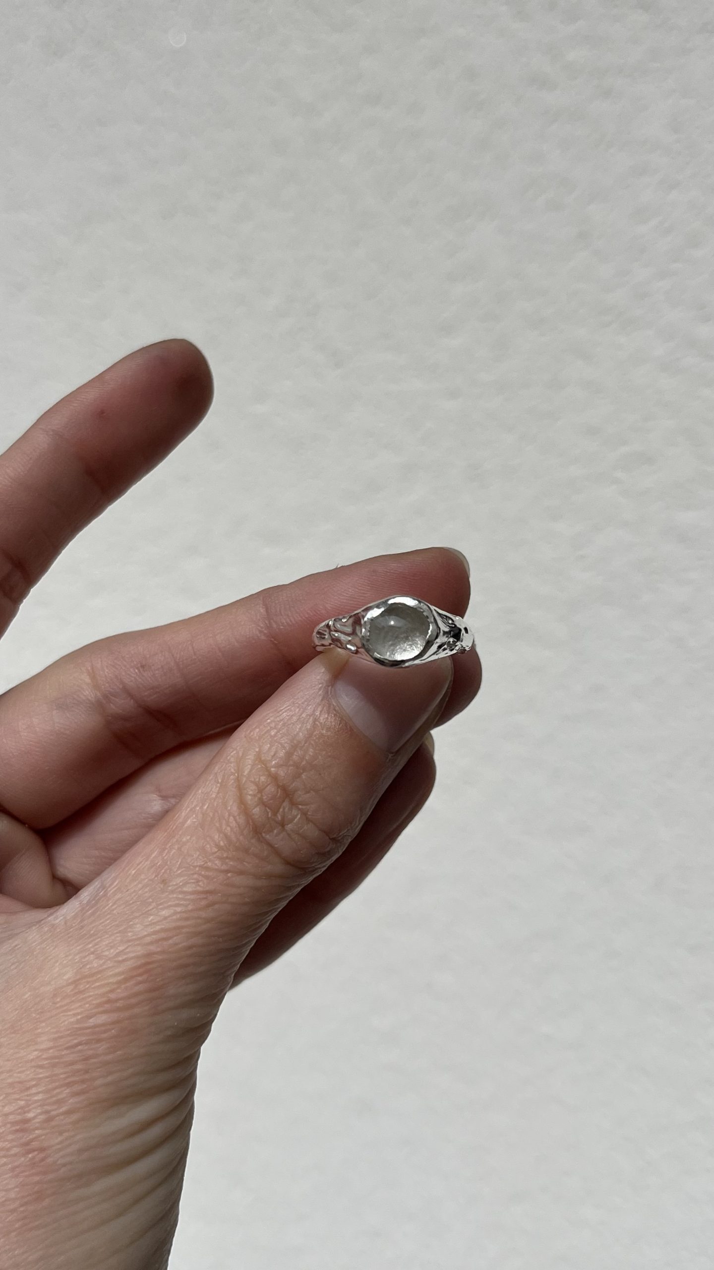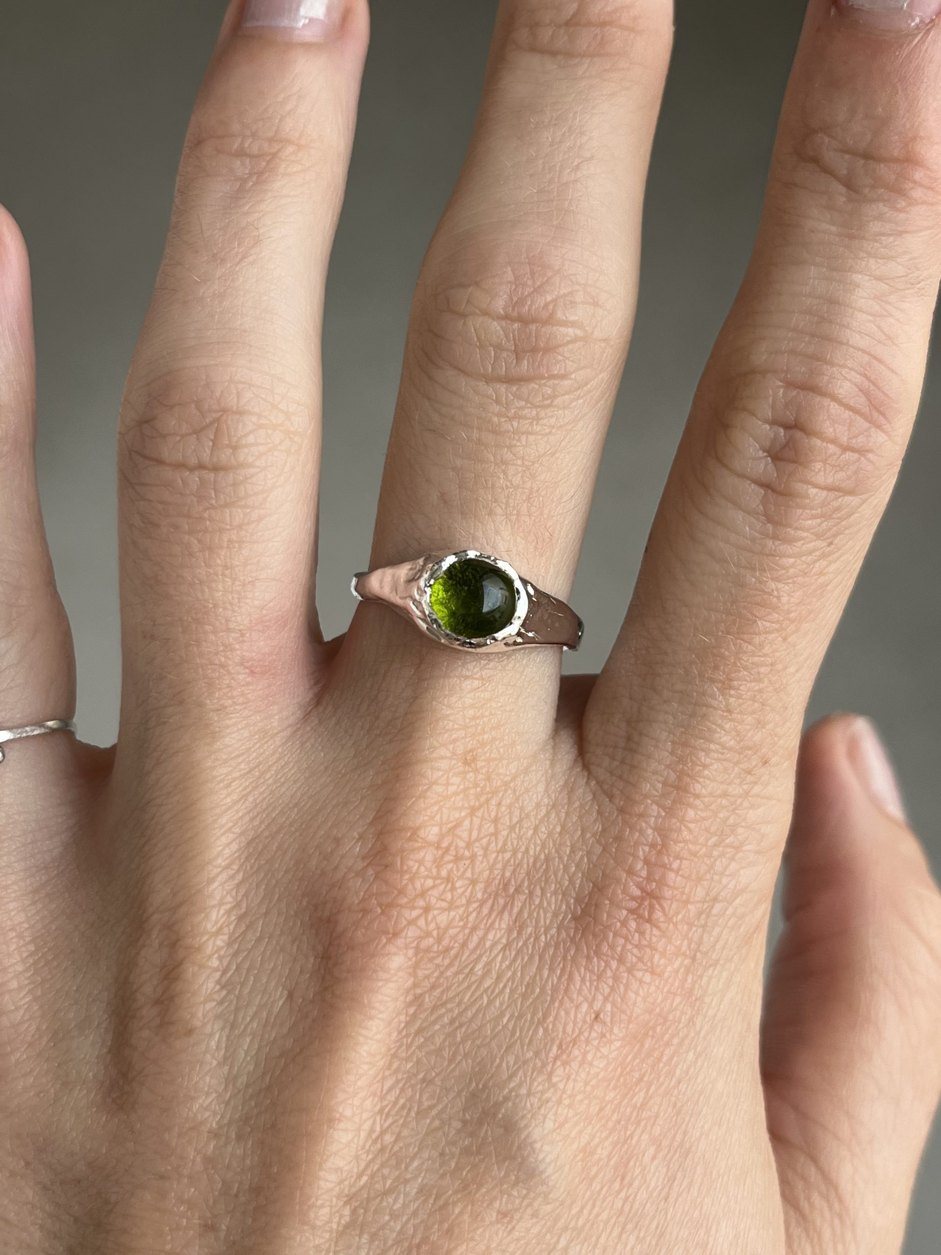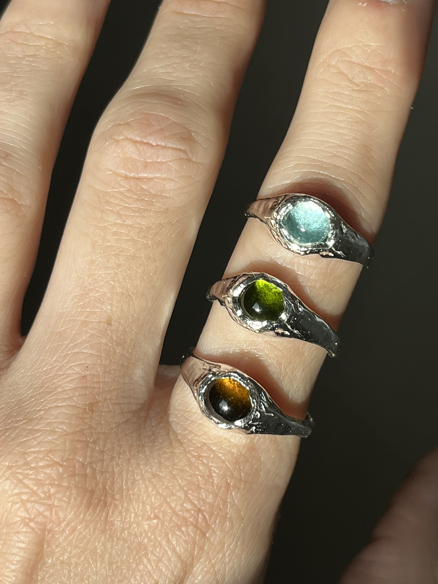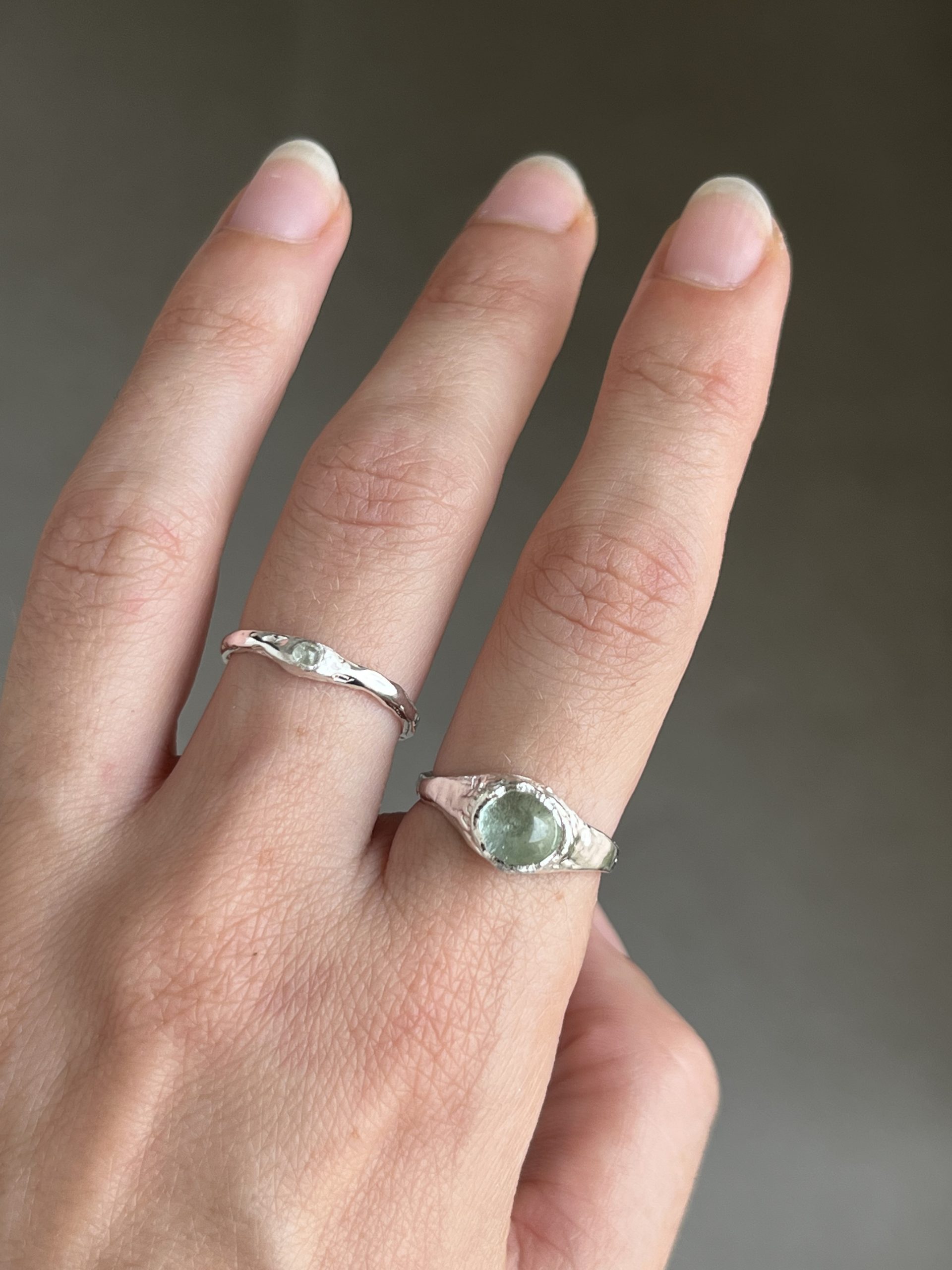 Anillo de textura orgánica y vidrio reciclado en forma de cabujón. Este diseño está realizado mediante diferentes procesos artesanales, lo que hace cada pieza única.