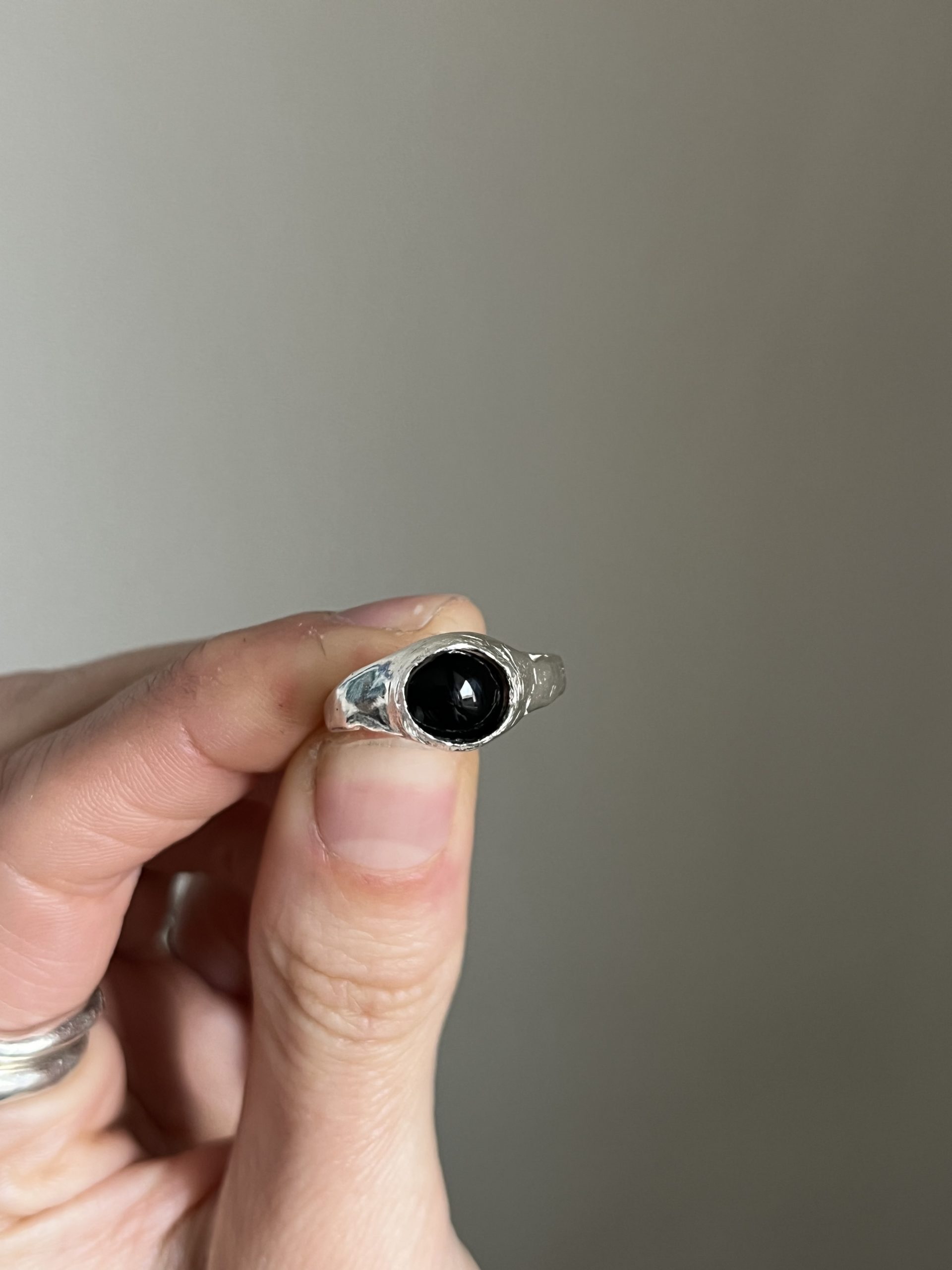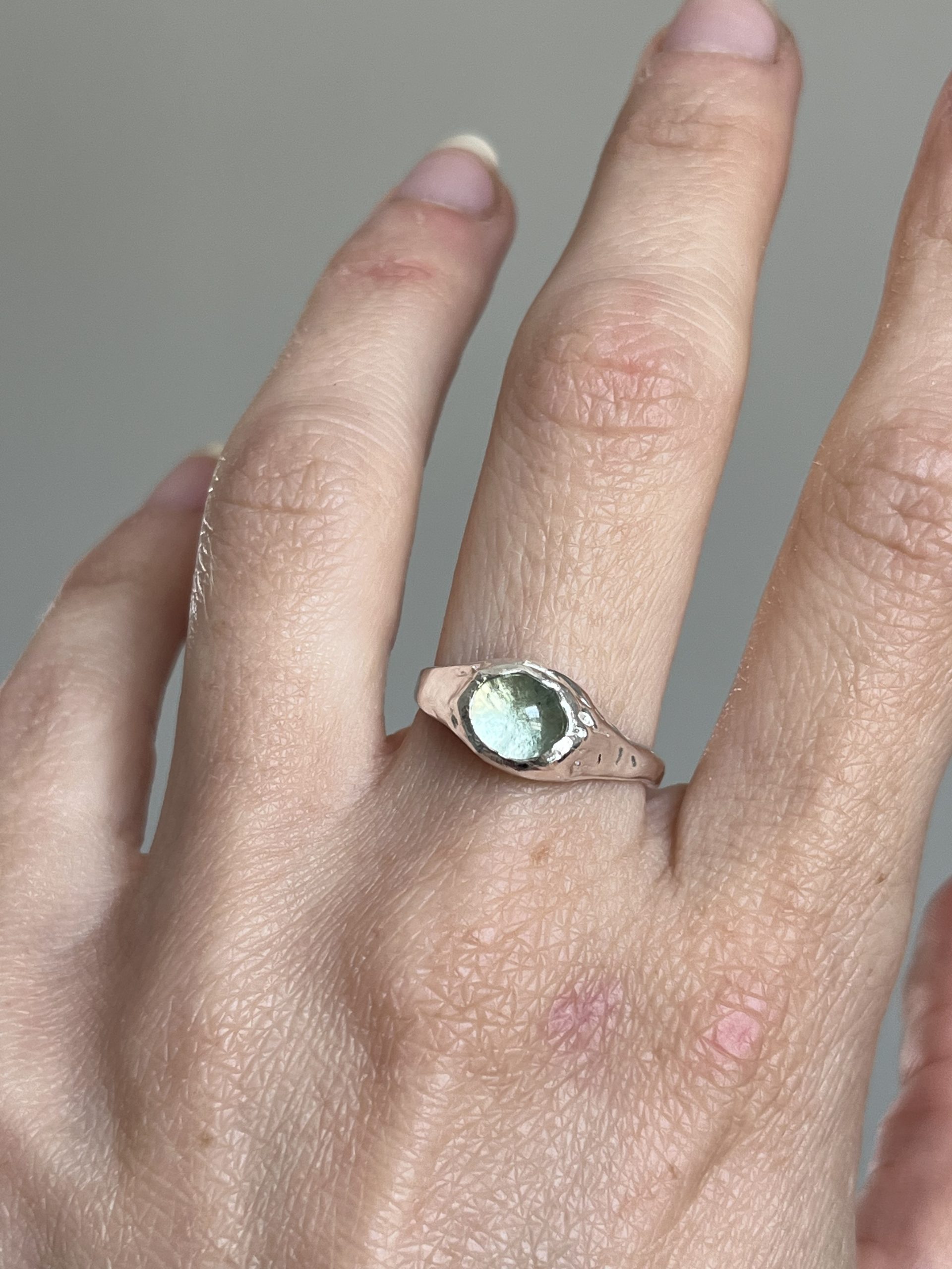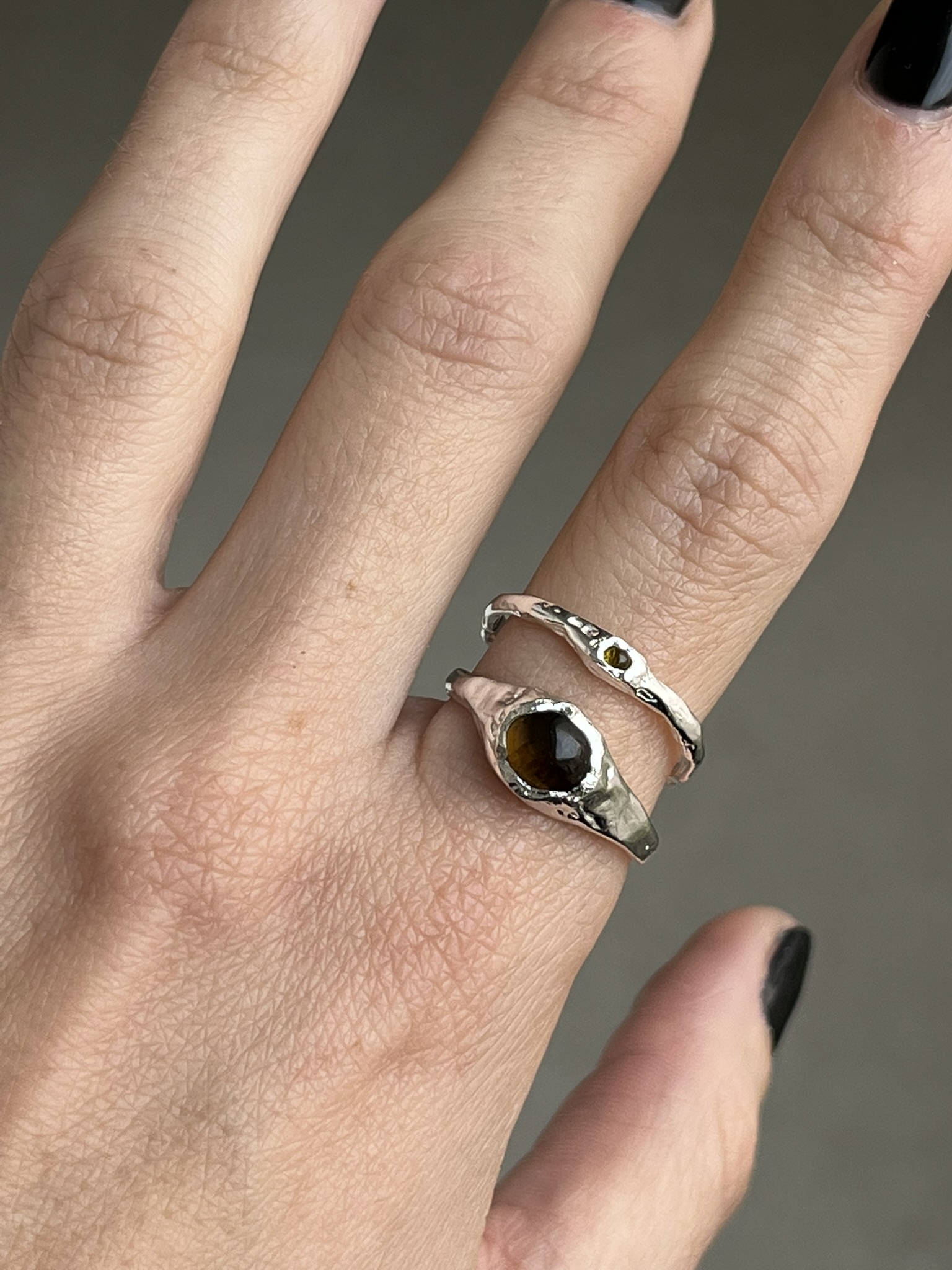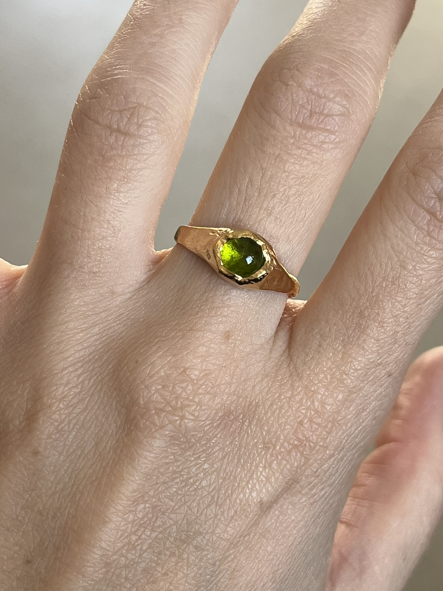 Anillo de textura orgánica y vidrio reciclado en forma de cabujón. Este diseño está realizado mediante diferentes procesos artesanales, lo que hace cada pieza única.