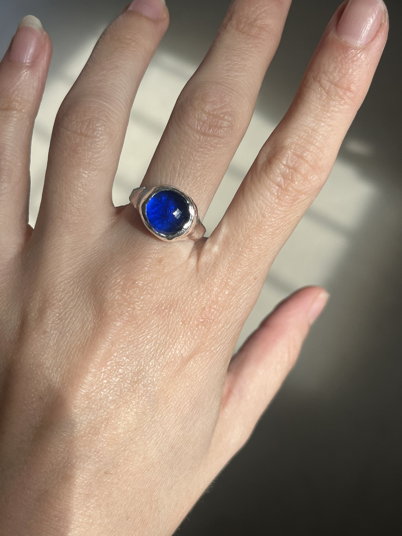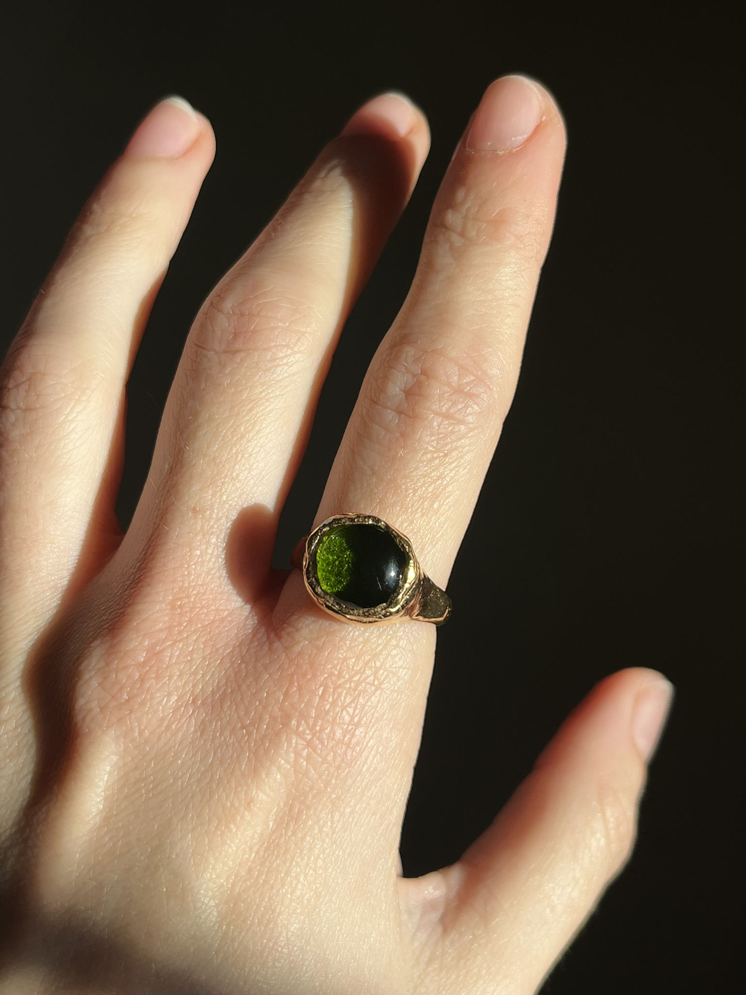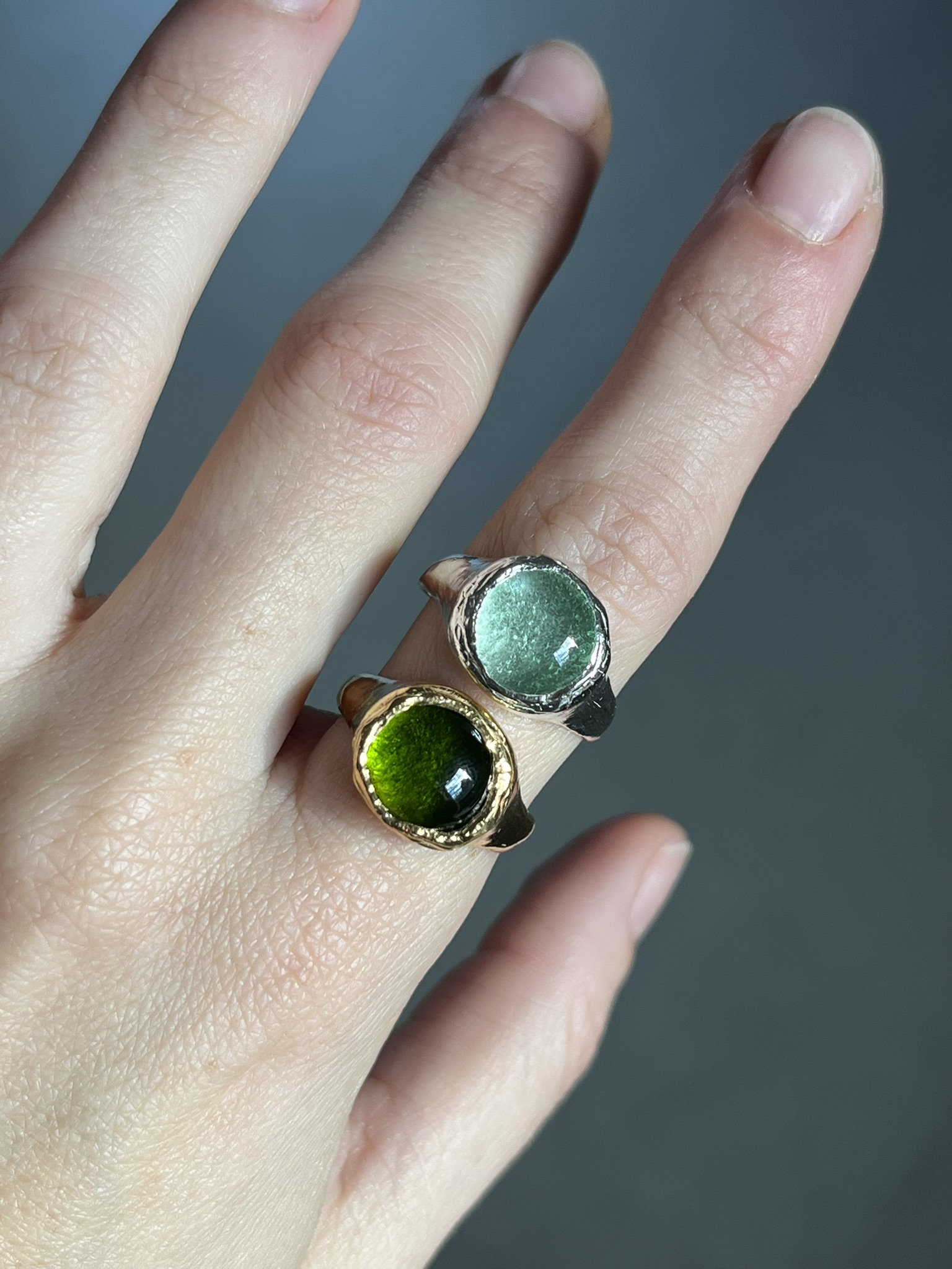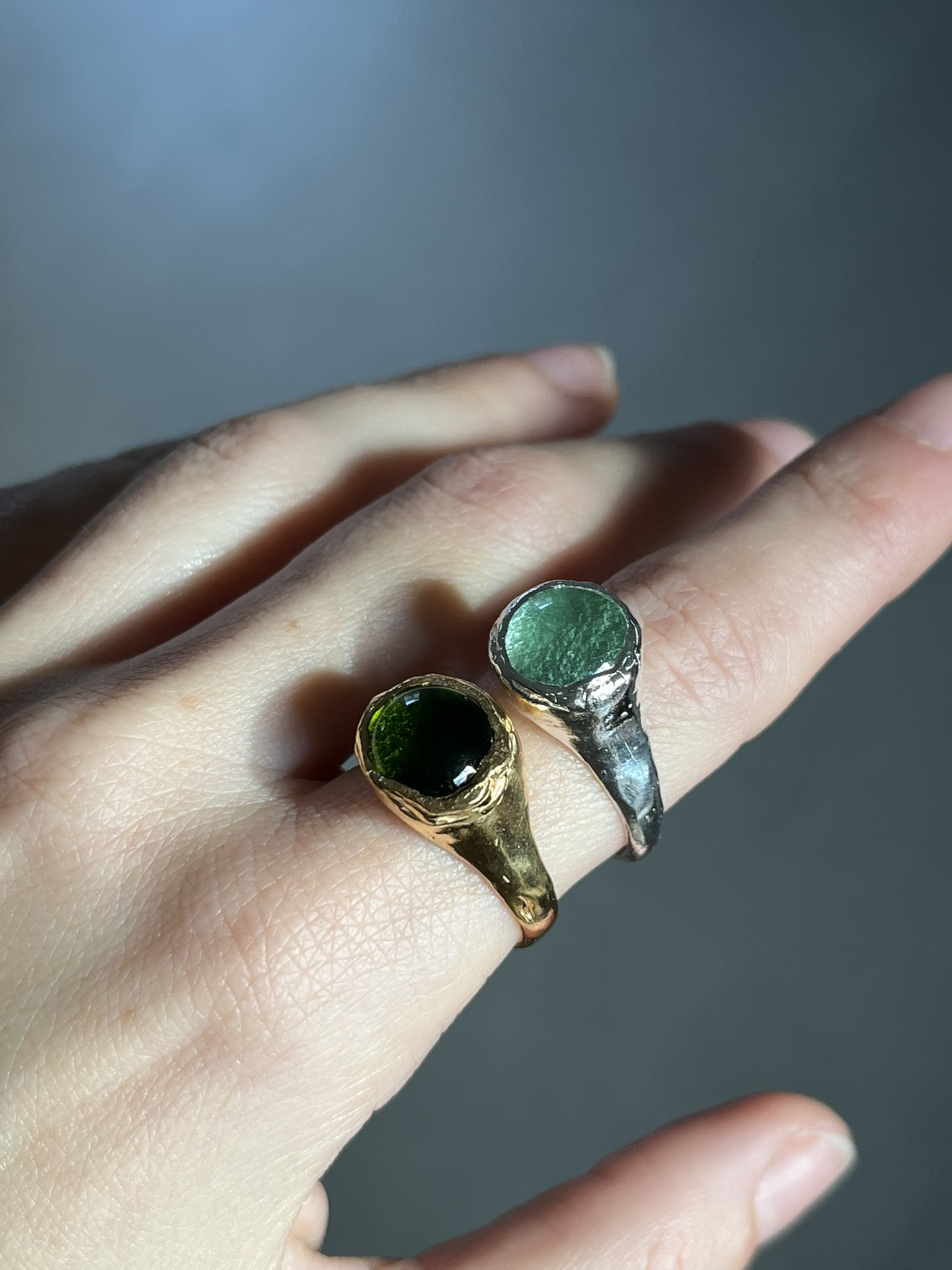 Anillo de textura orgánica y vidrio reciclado en forma de cabujón. Este diseño está realizado mediante diferentes procesos artesanales, lo que hace cada pieza única.