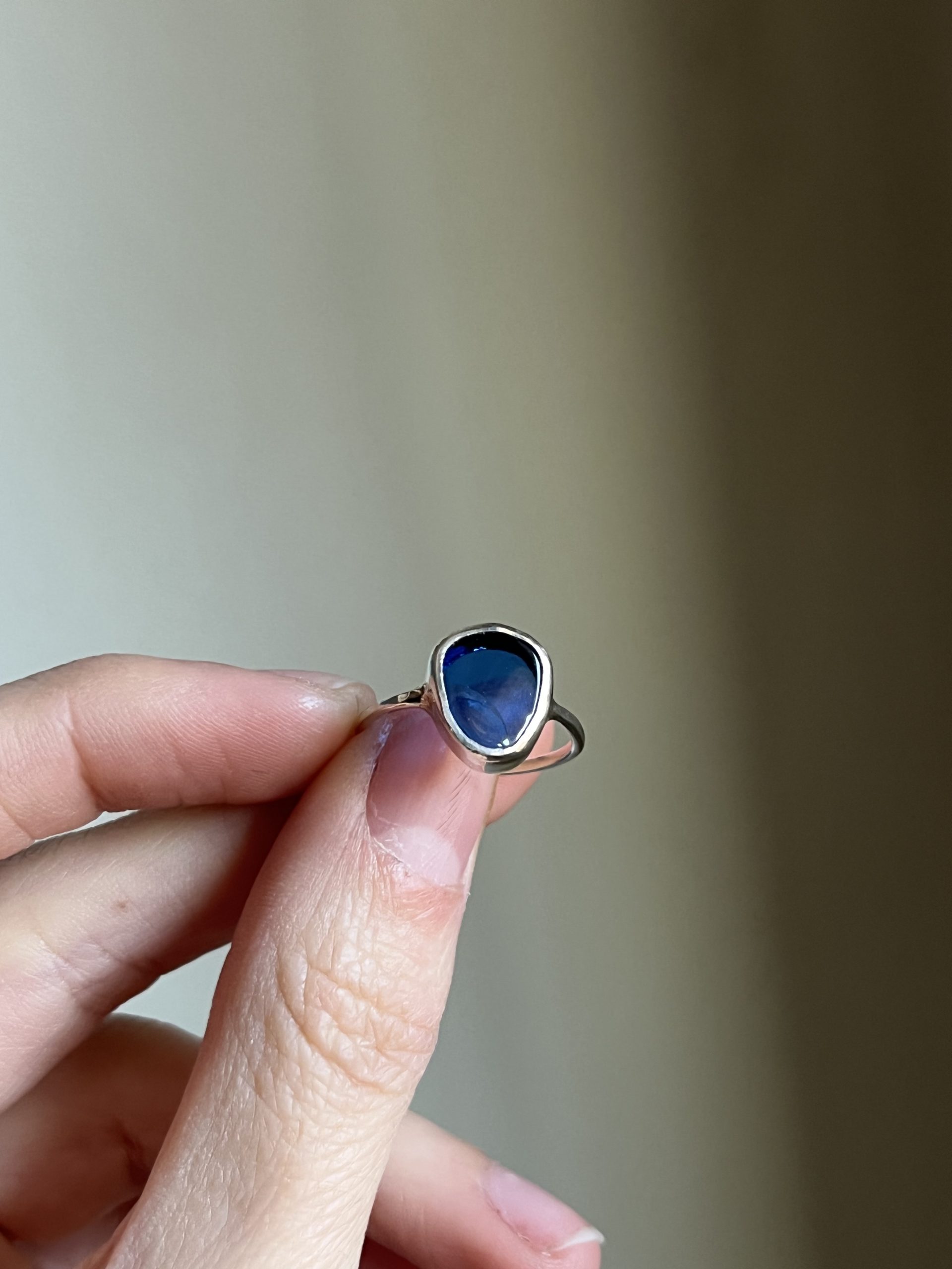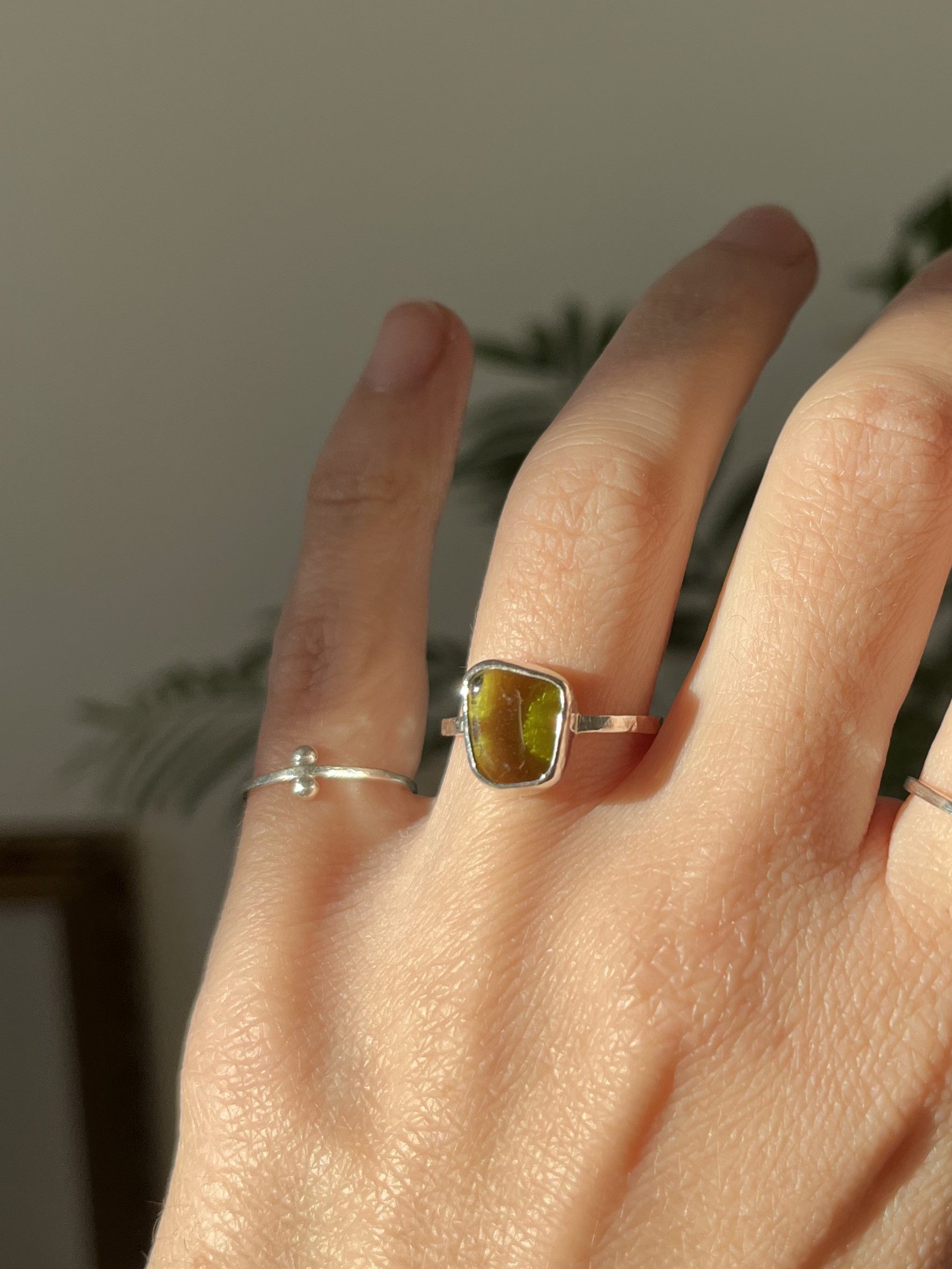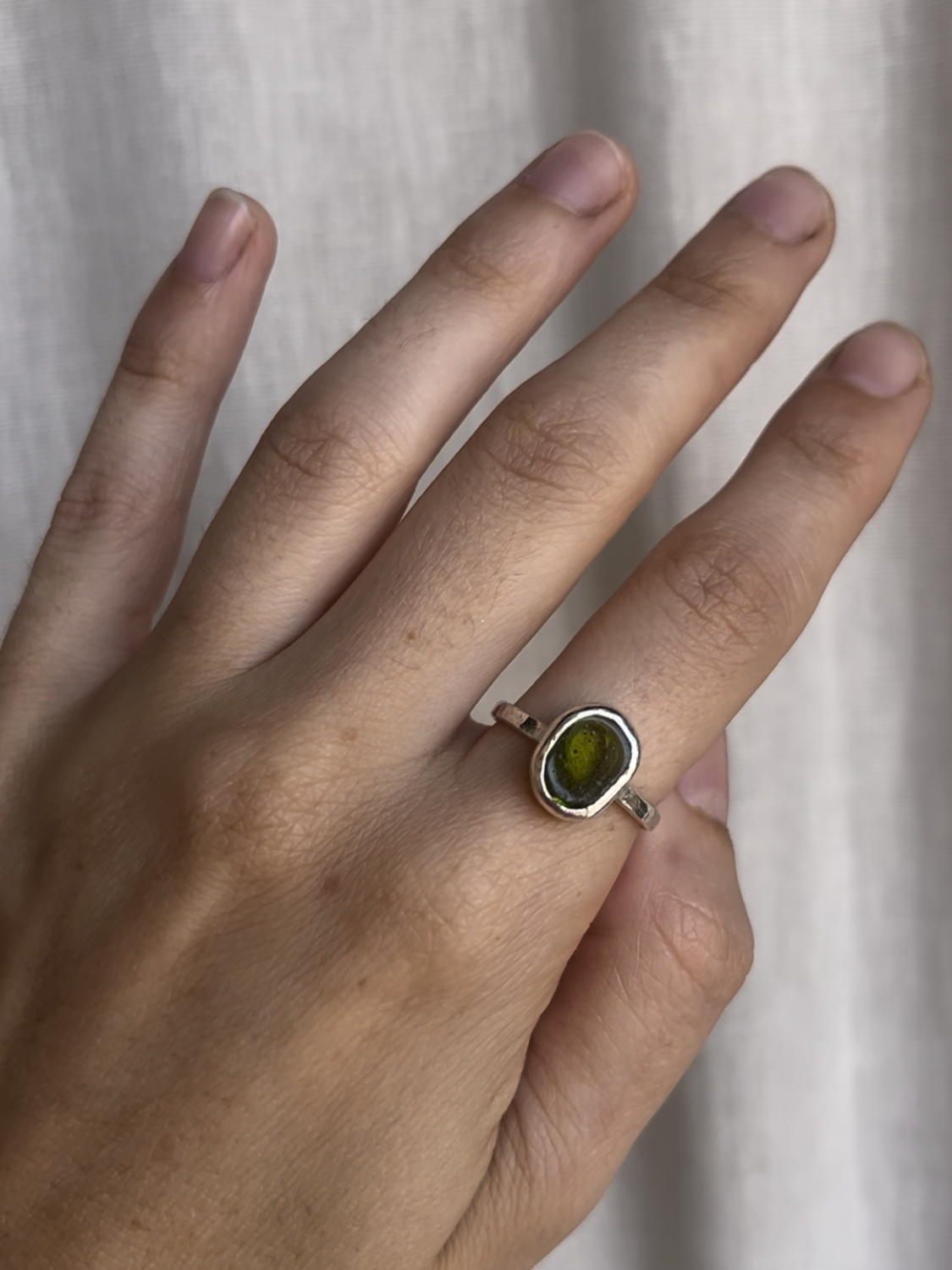 Anillo con vidrio reciclado, tallado y pulido artesanalmente. Cada vidrio está hecho sin seguir una forma geométrica concreta y la anilla tiene una textura «martelé» para acentuar ese aspecto más rústico.