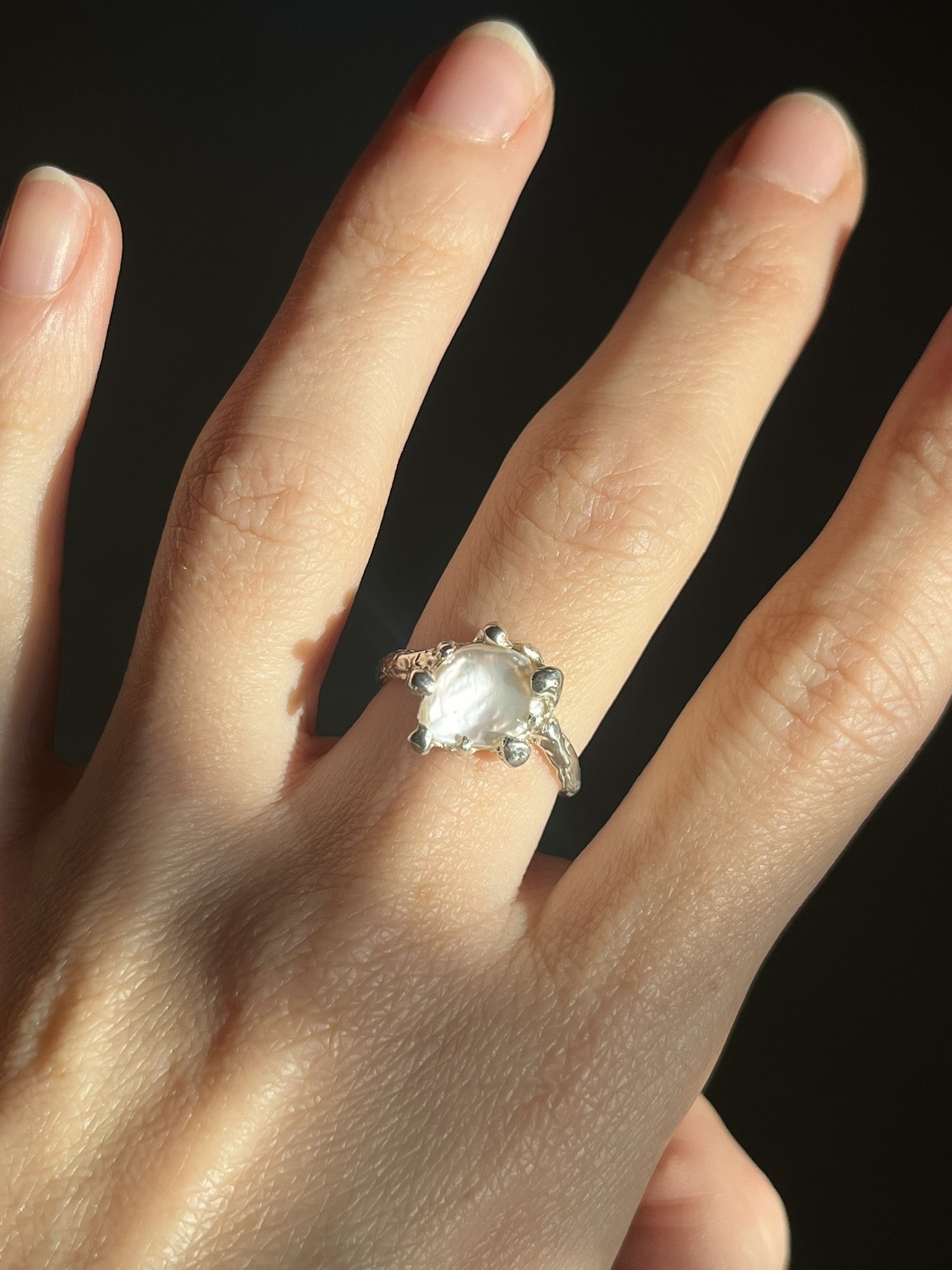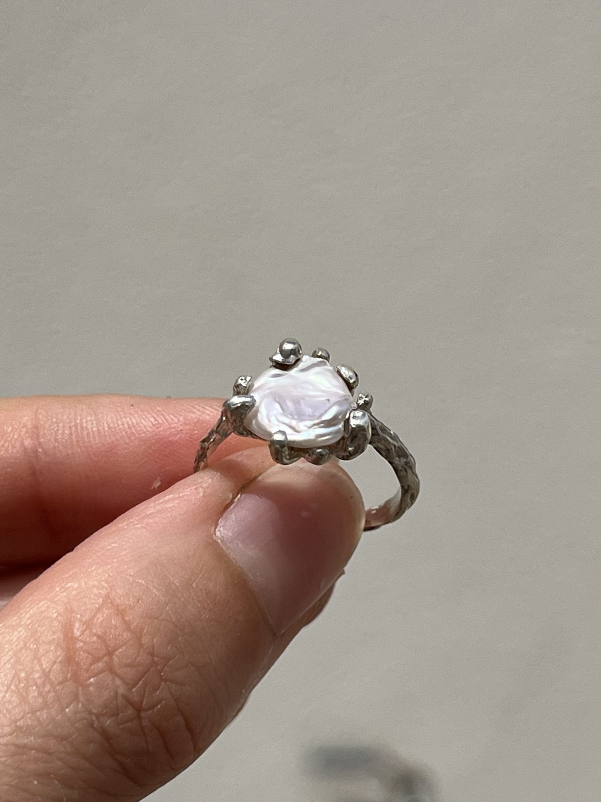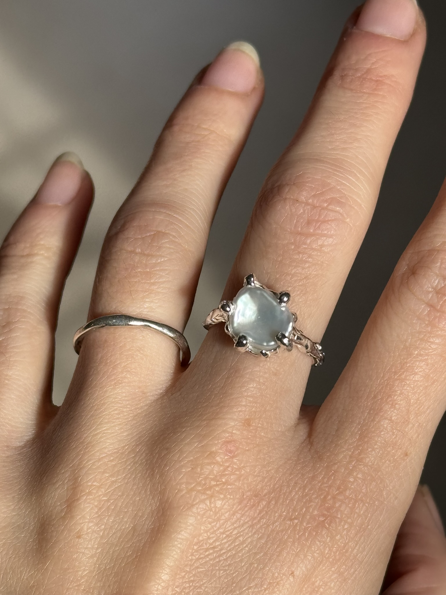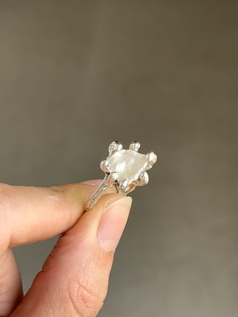 Anillo de textura orgánica y perla keshi. Por la naturaleza de la perla, cada pieza tendrá una forma única, escríbeme si quieres que te enseñe las que hay disponibles y seleccionas la que más te gusta.