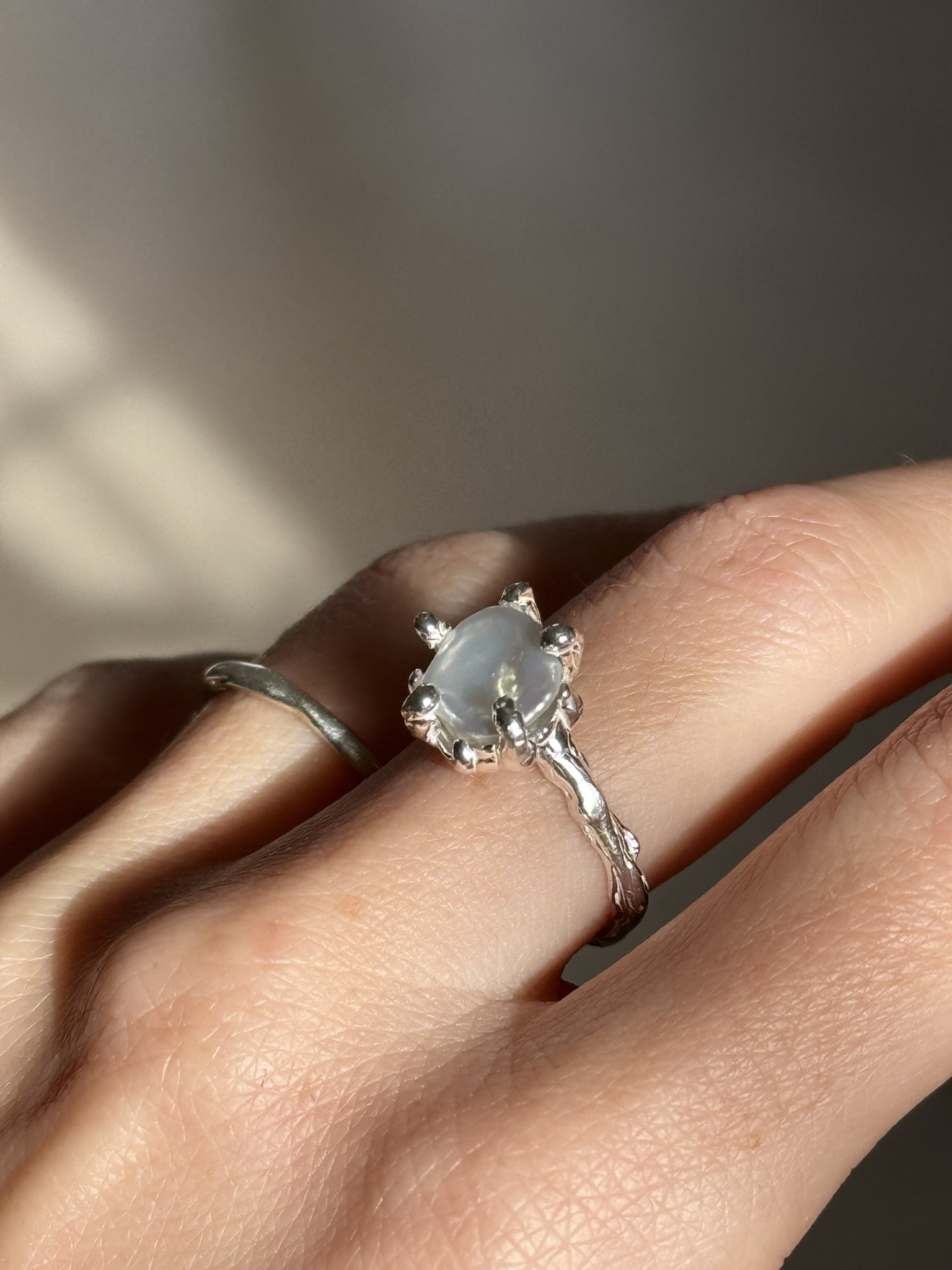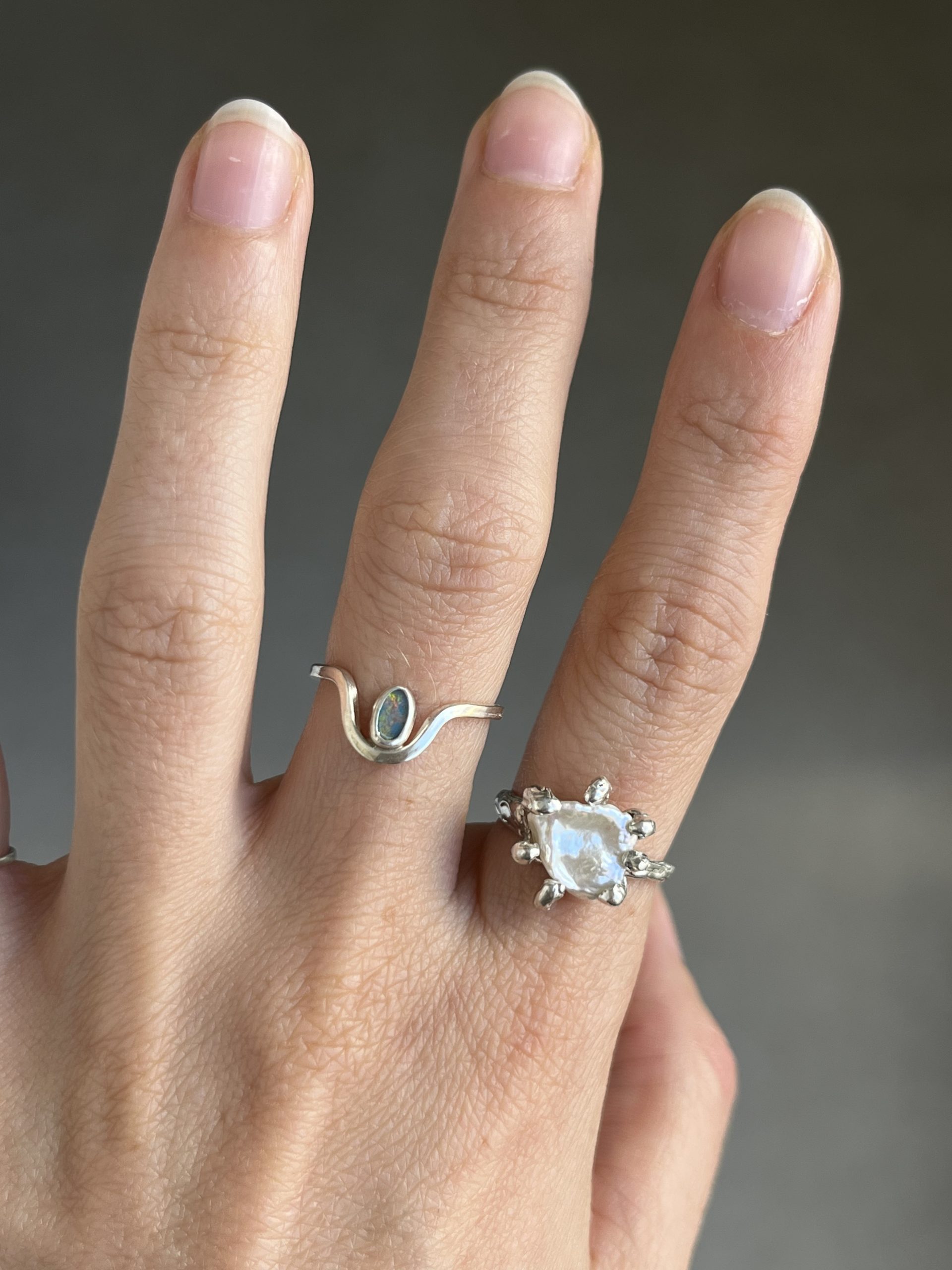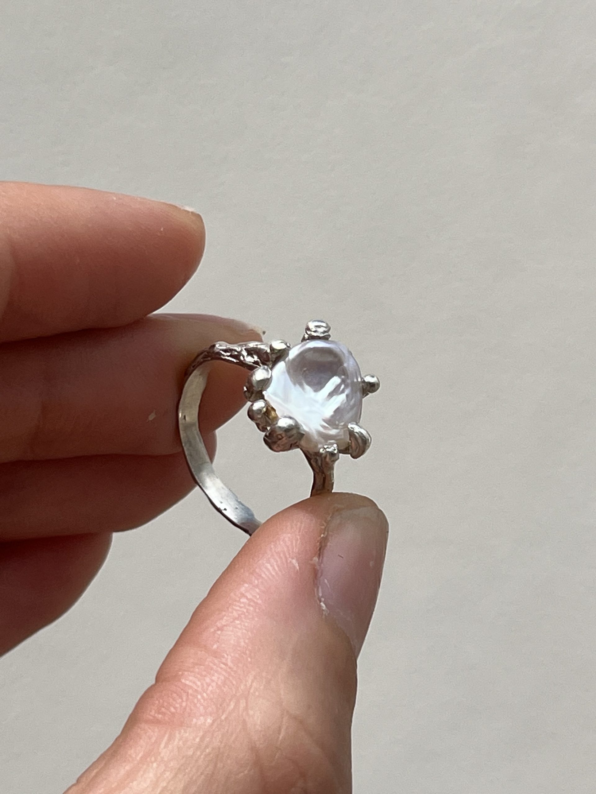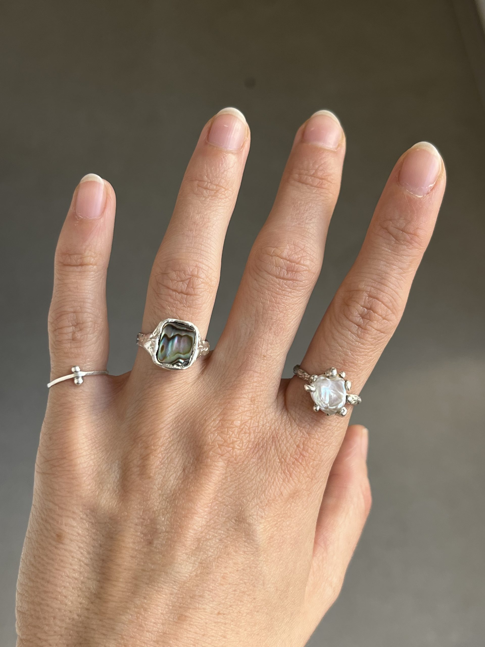 Anillo de textura orgánica y perla keshi. Por la naturaleza de la perla, cada pieza tendrá una forma única, escríbeme si quieres que te enseñe las que hay disponibles y seleccionas la que más te gusta.