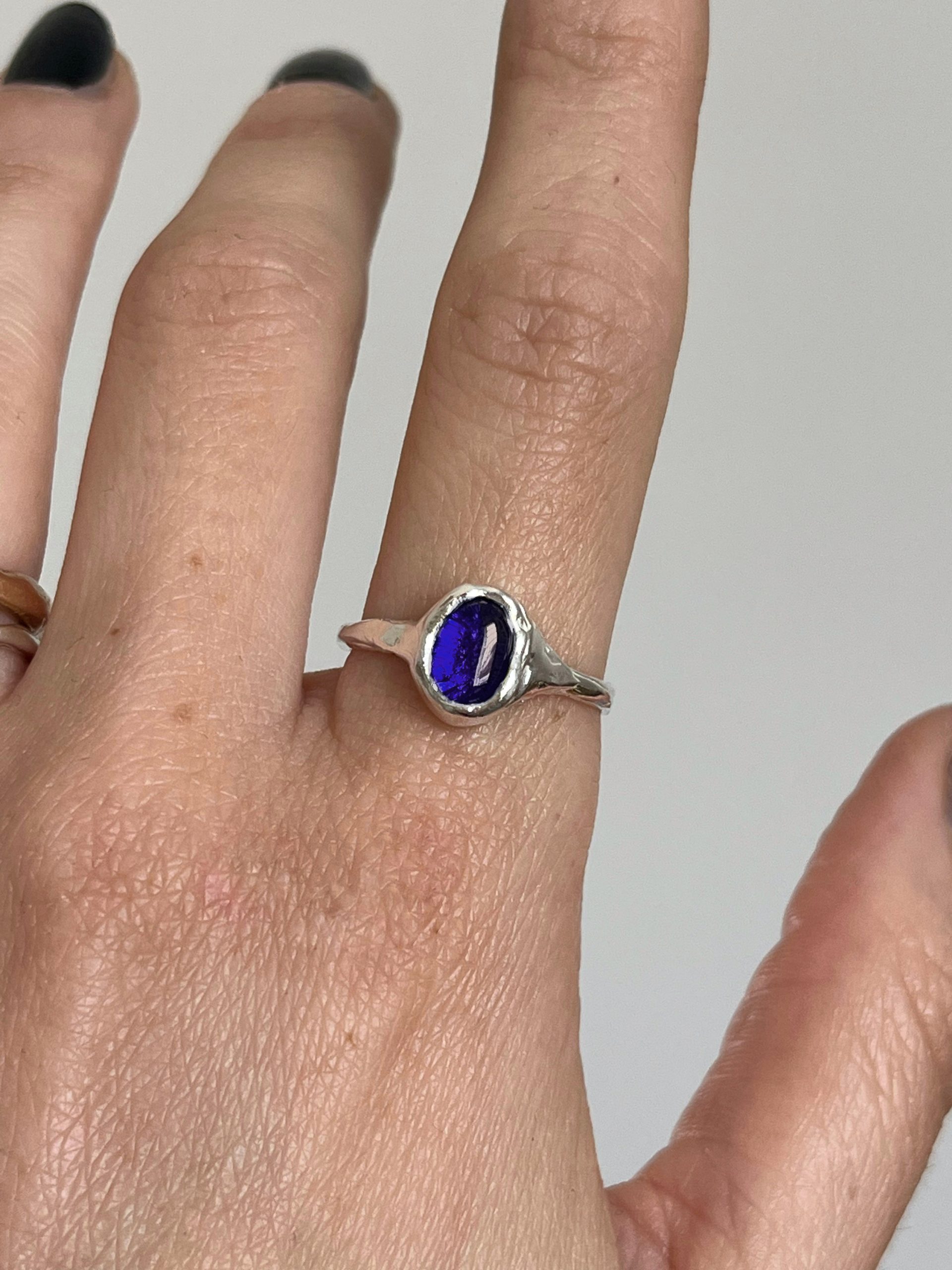 Anillo de textura orgánica y vidrio reciclado ovalado. Este diseño está realizado mediante diferentes procesos artesanales y sin moldes, lo que hace cada pieza única.