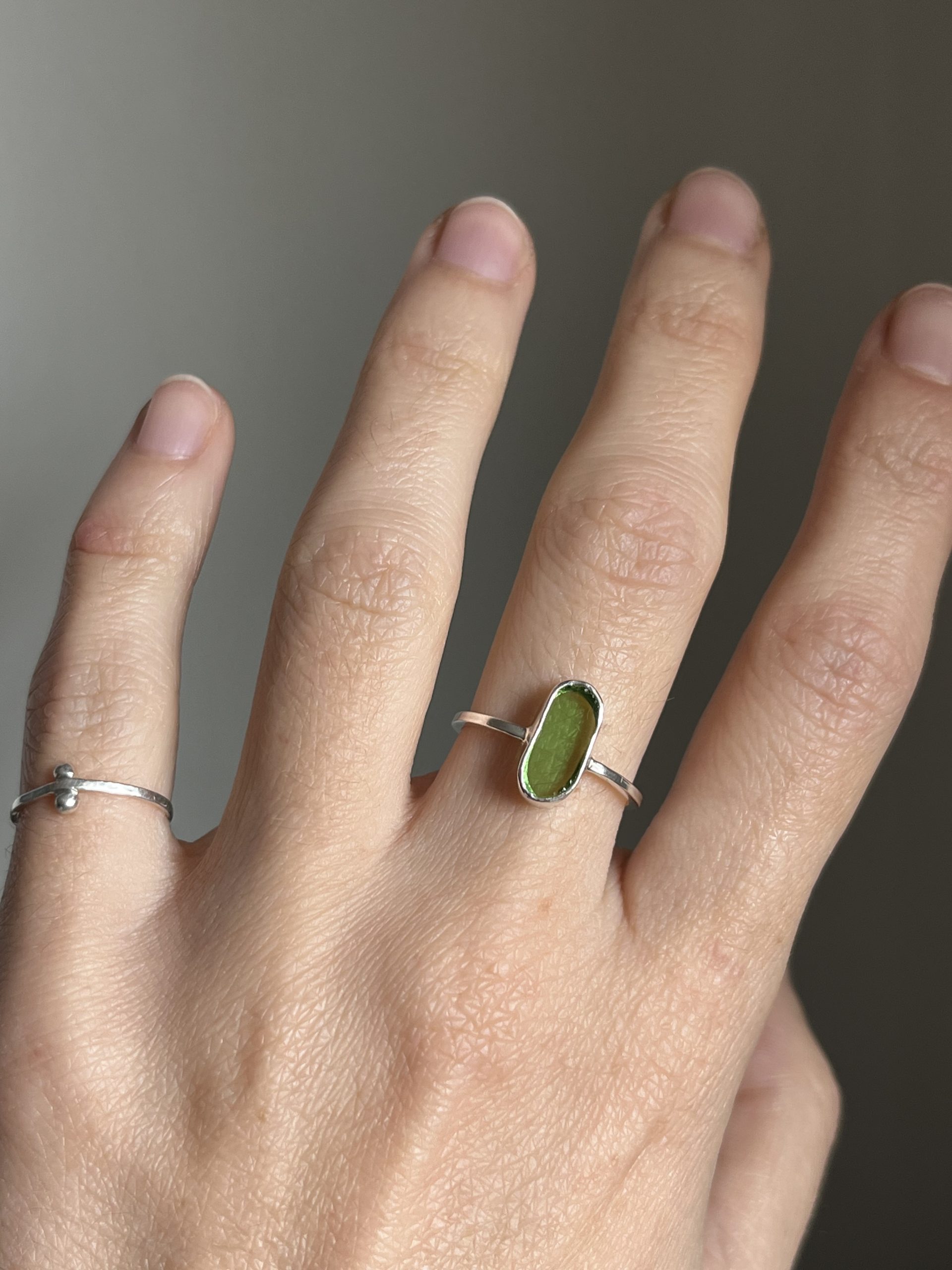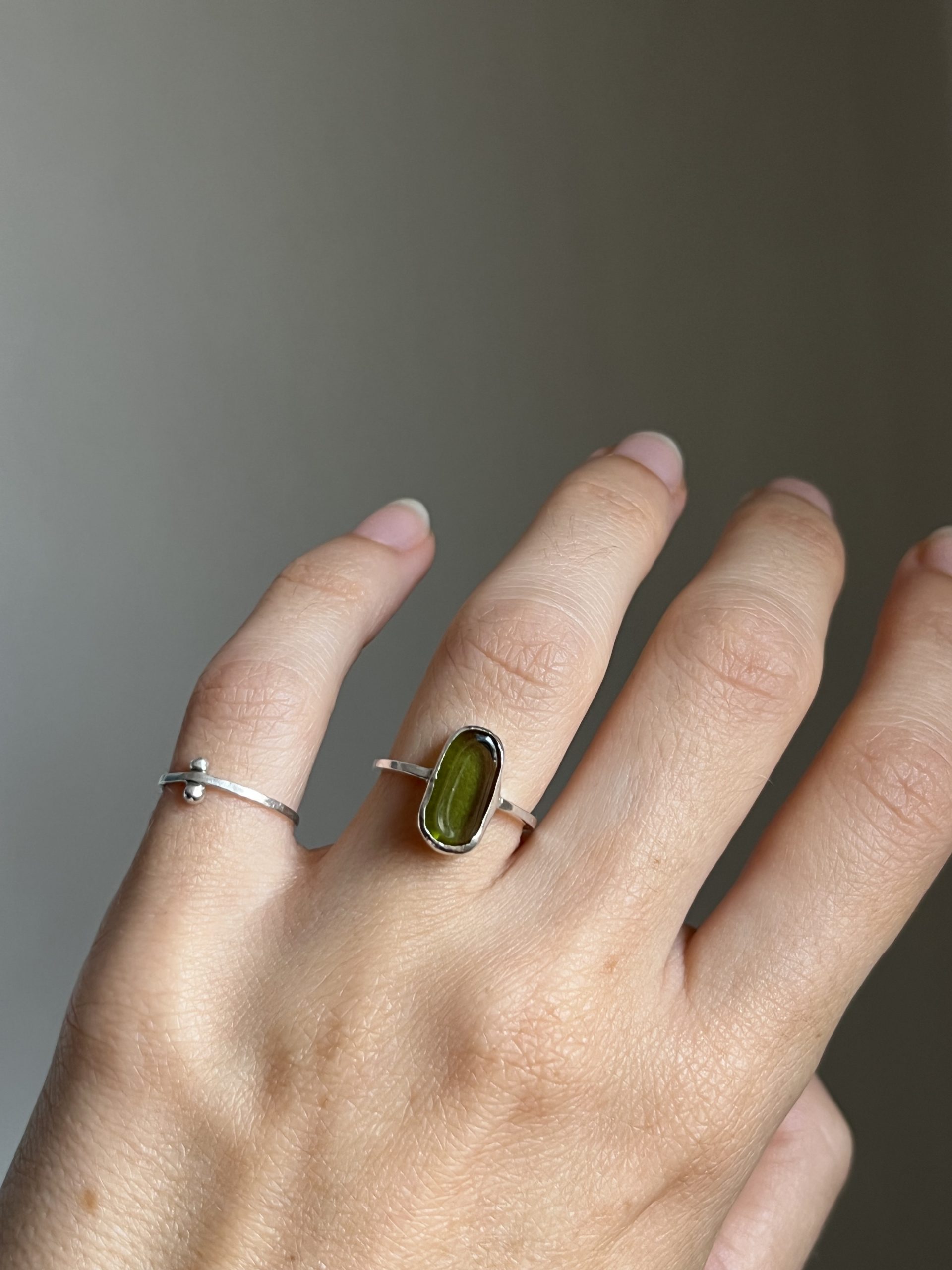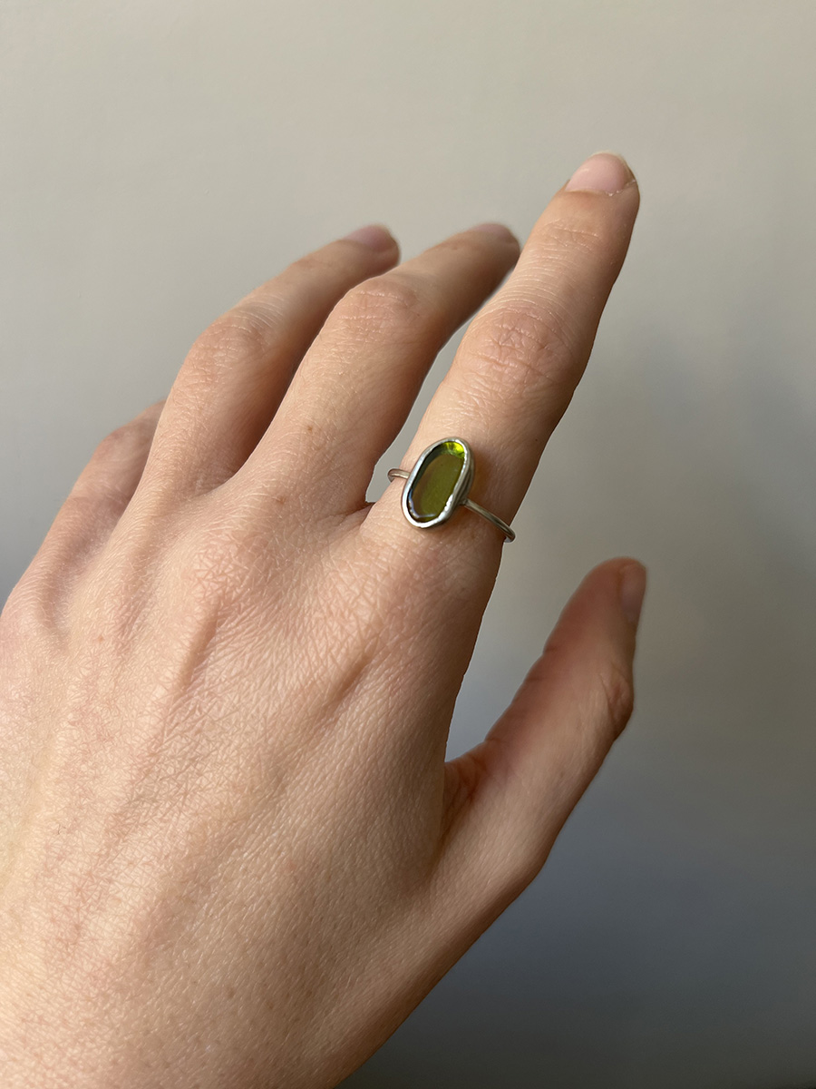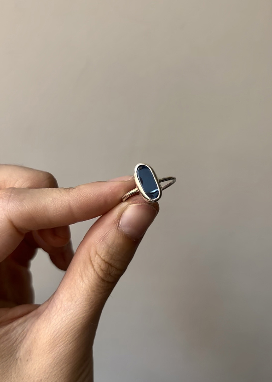 Anillo con vidrio reciclado, tallado y pulido artesanalmente.