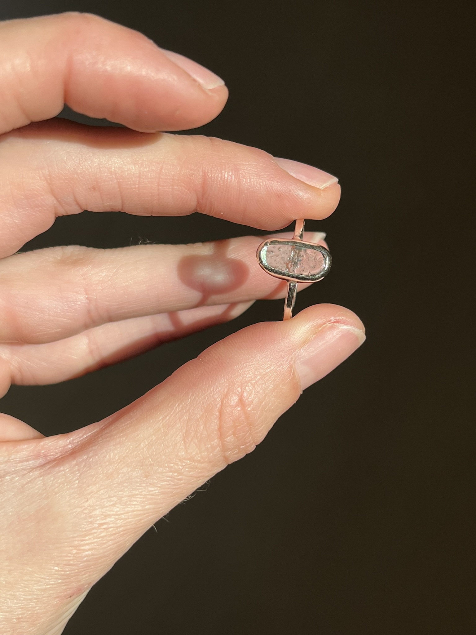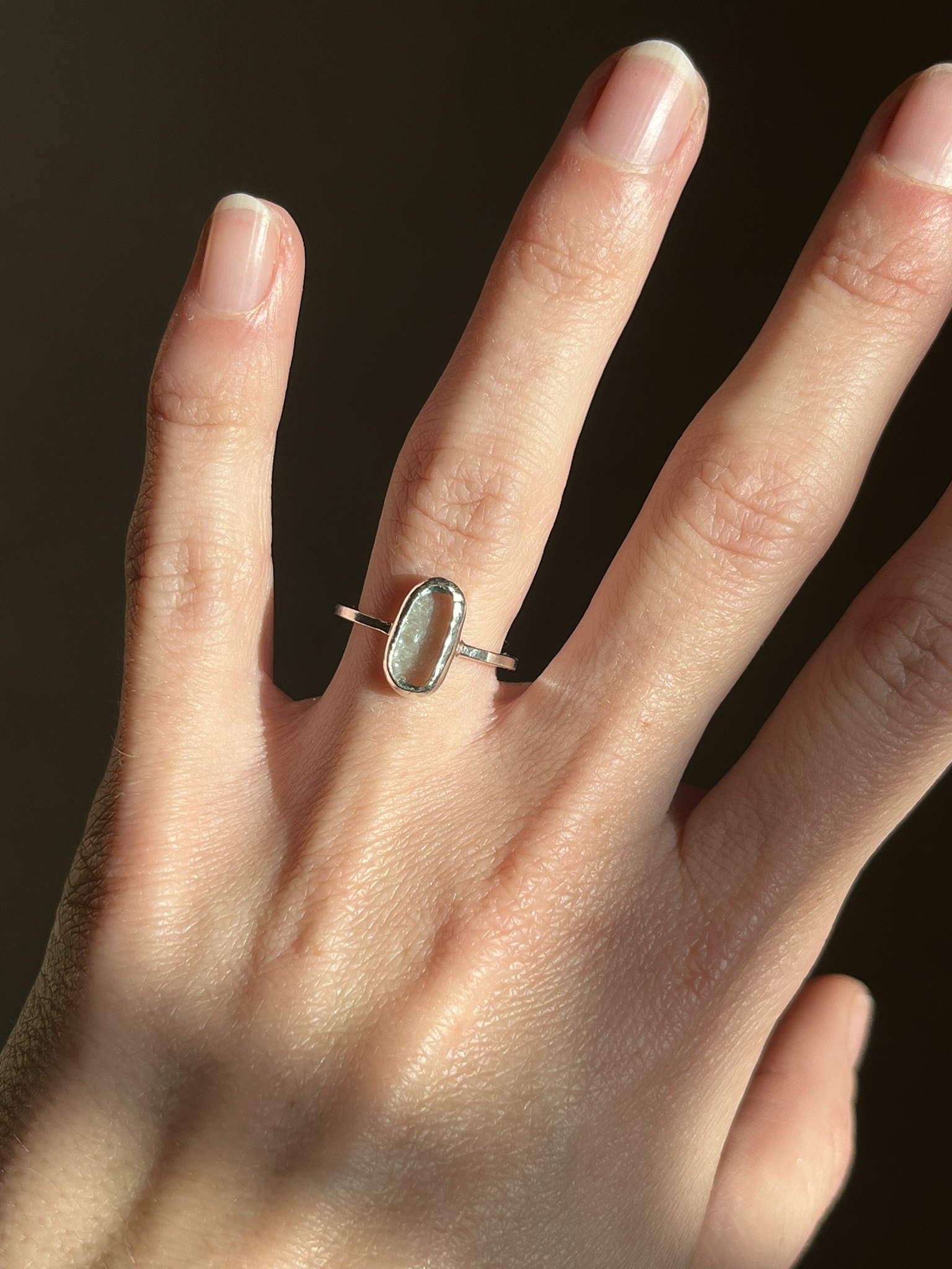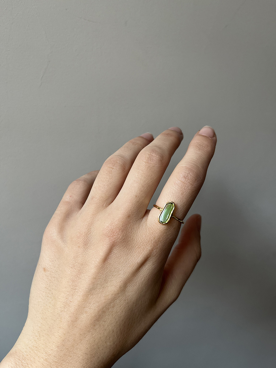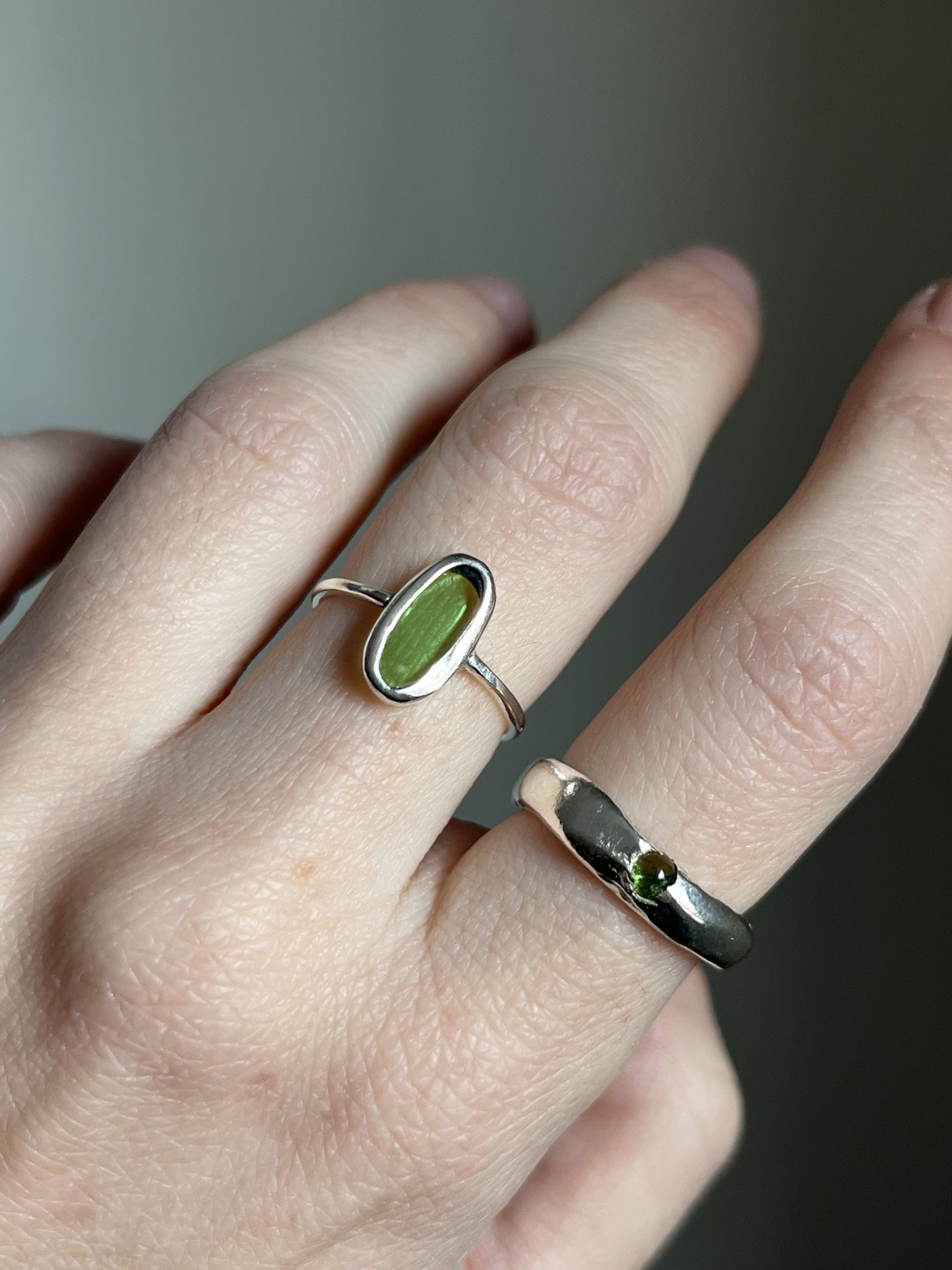 Anillo con vidrio reciclado, tallado y pulido artesanalmente.