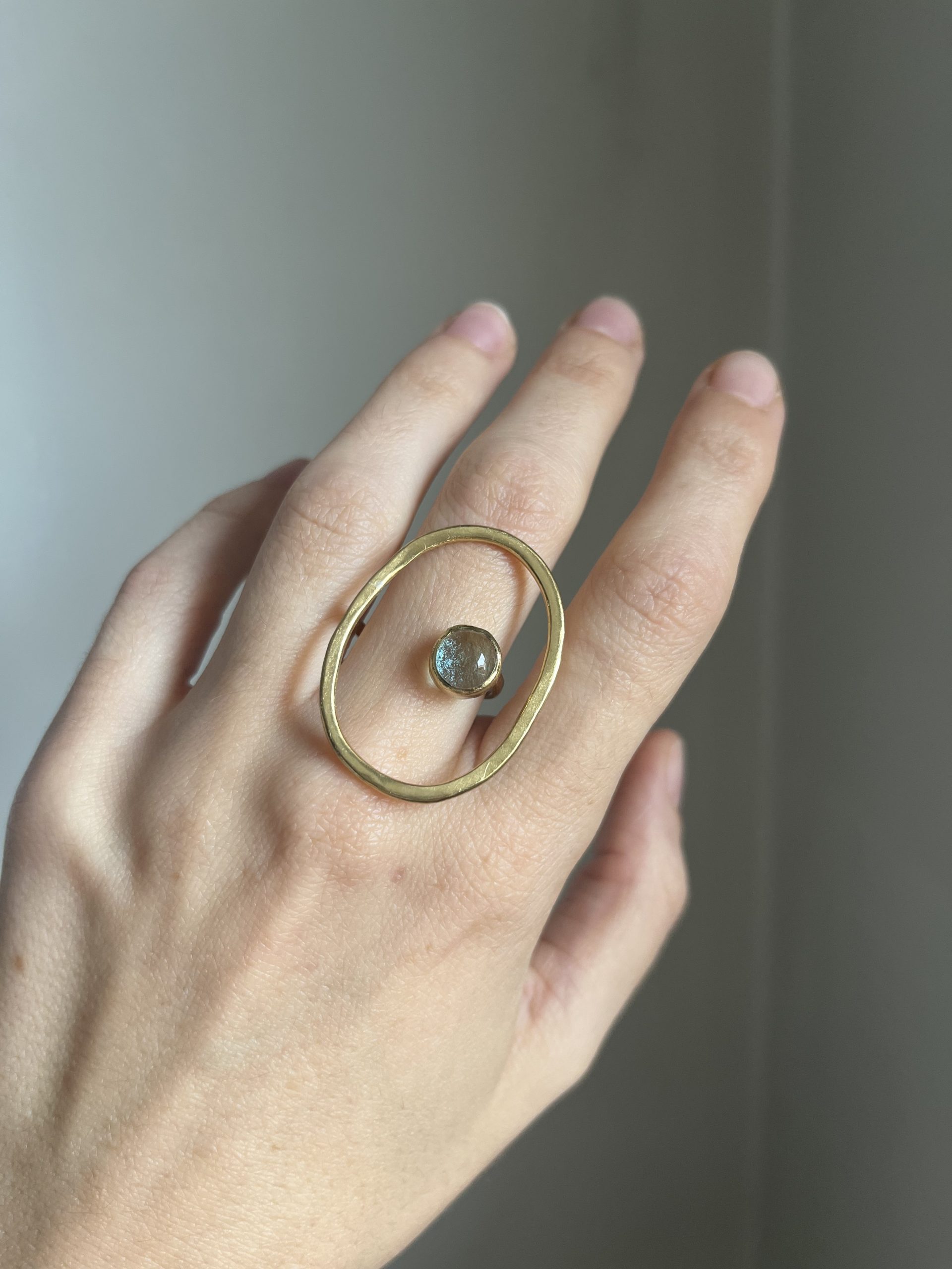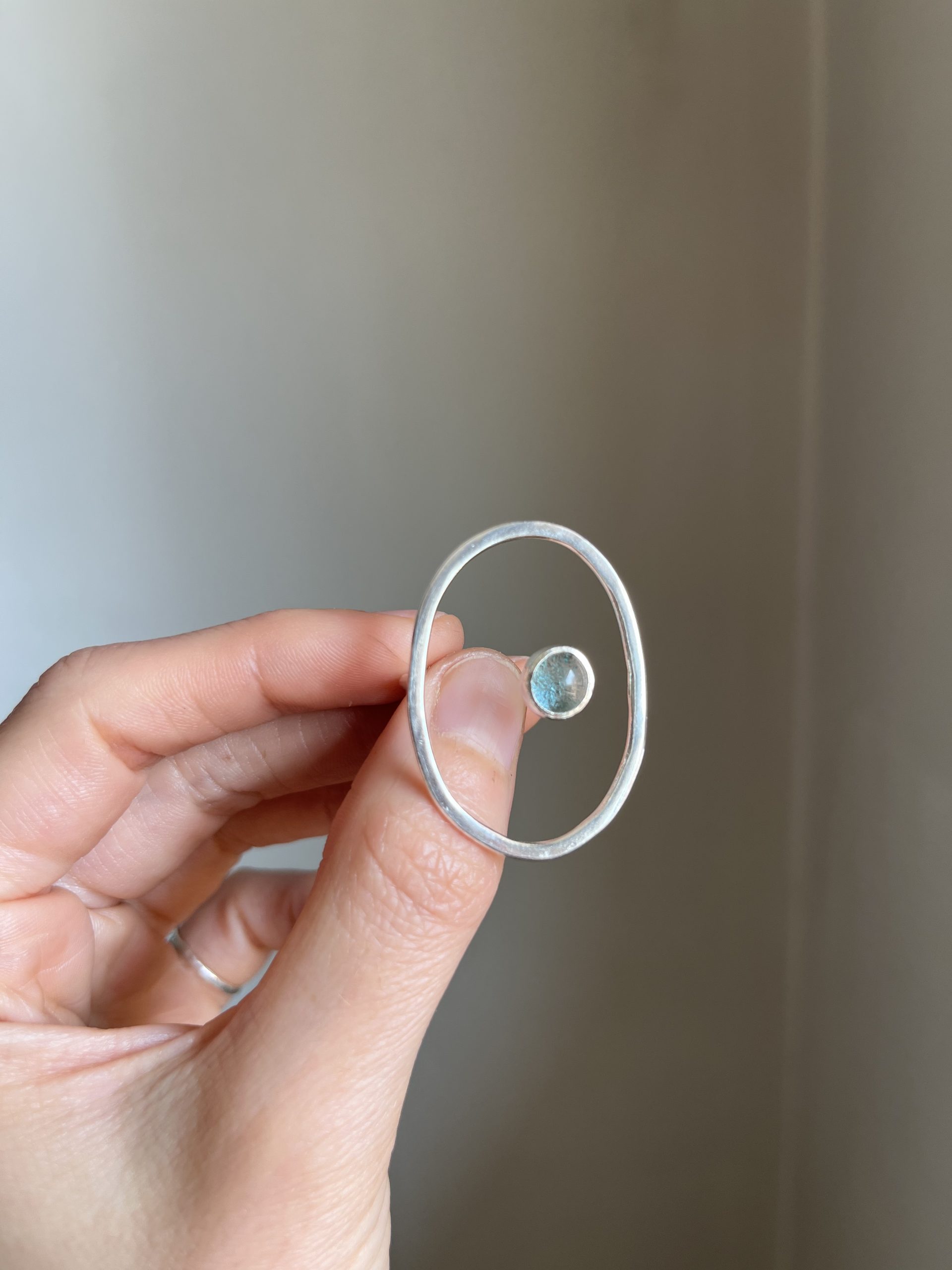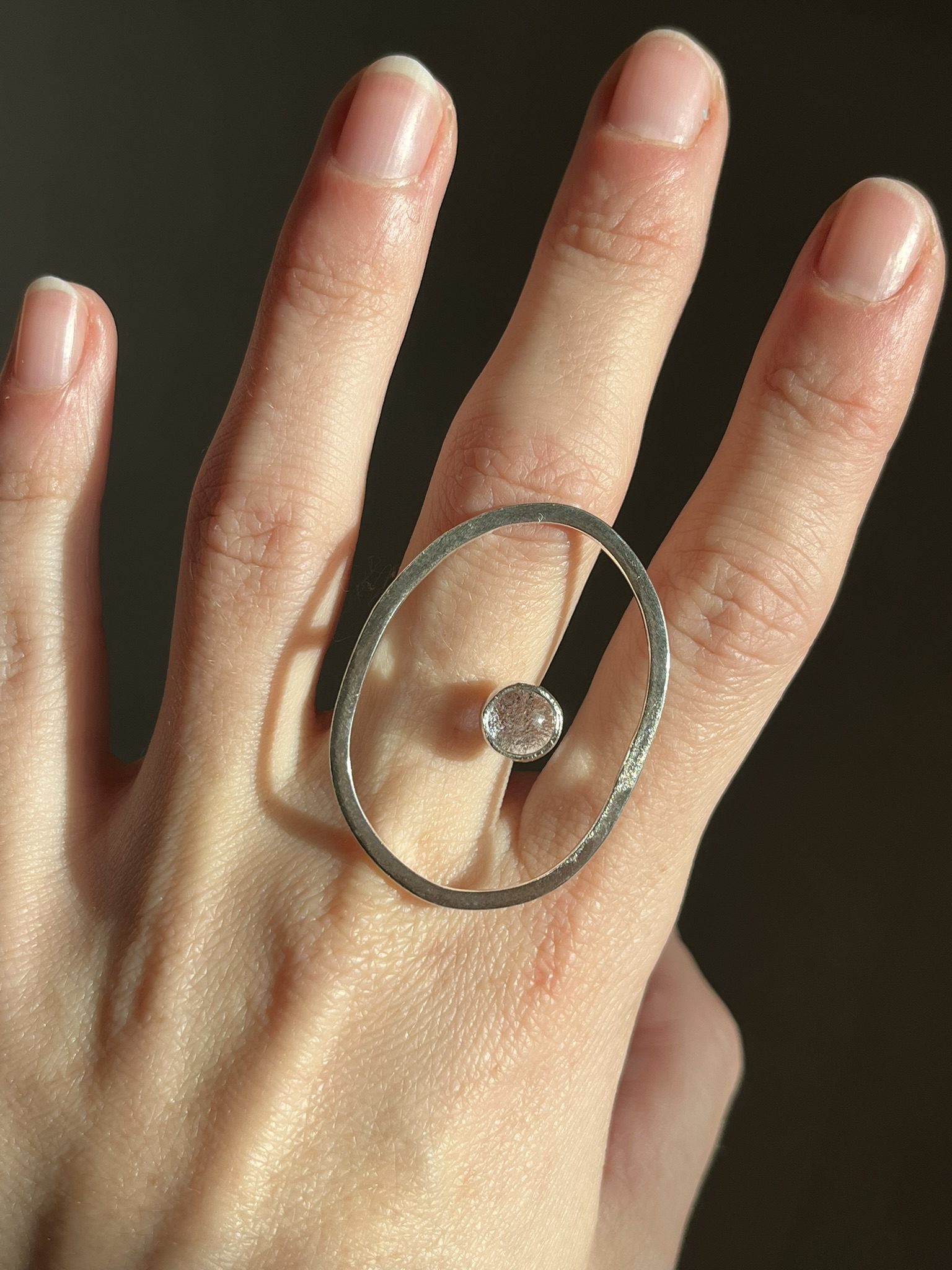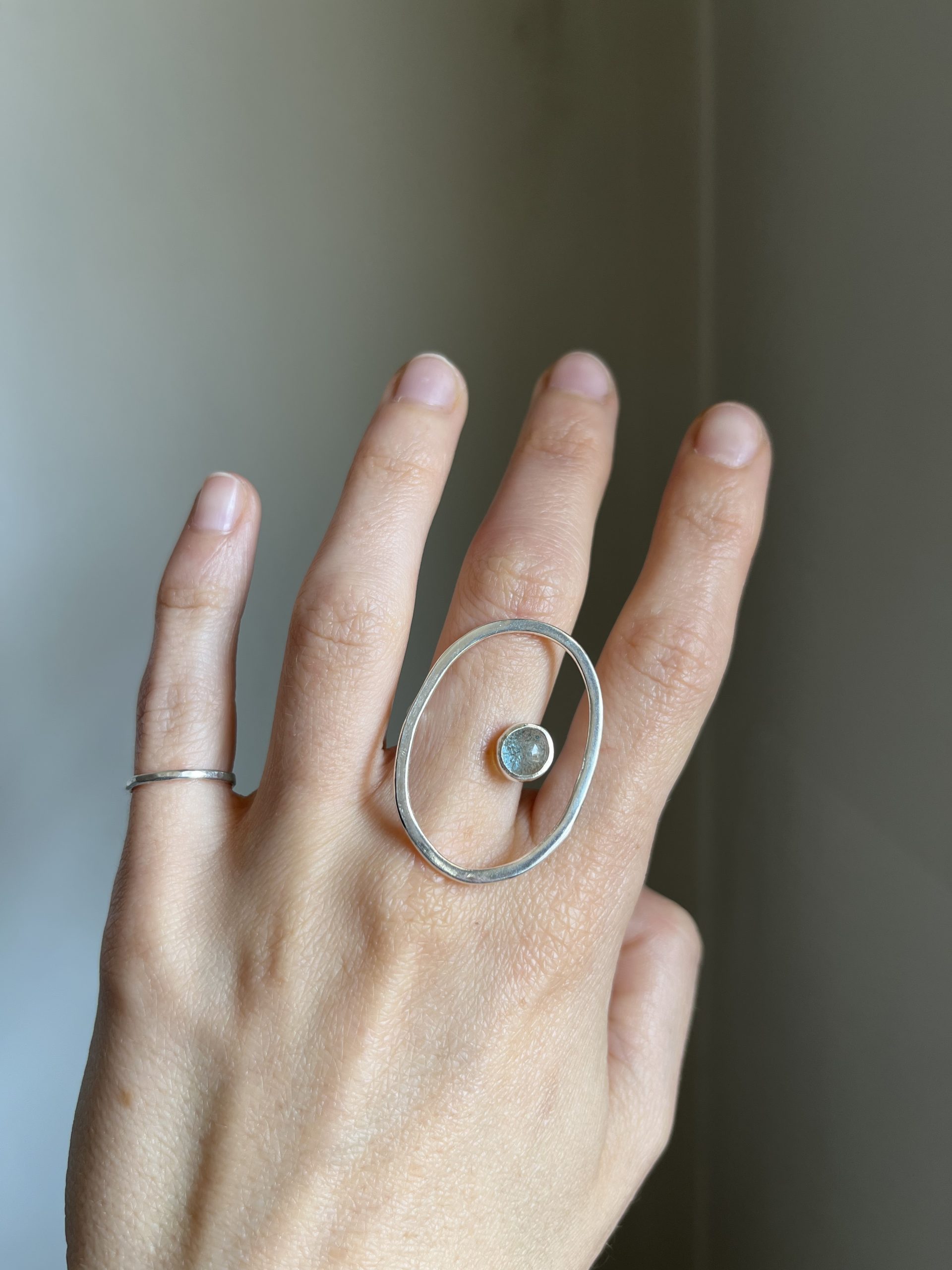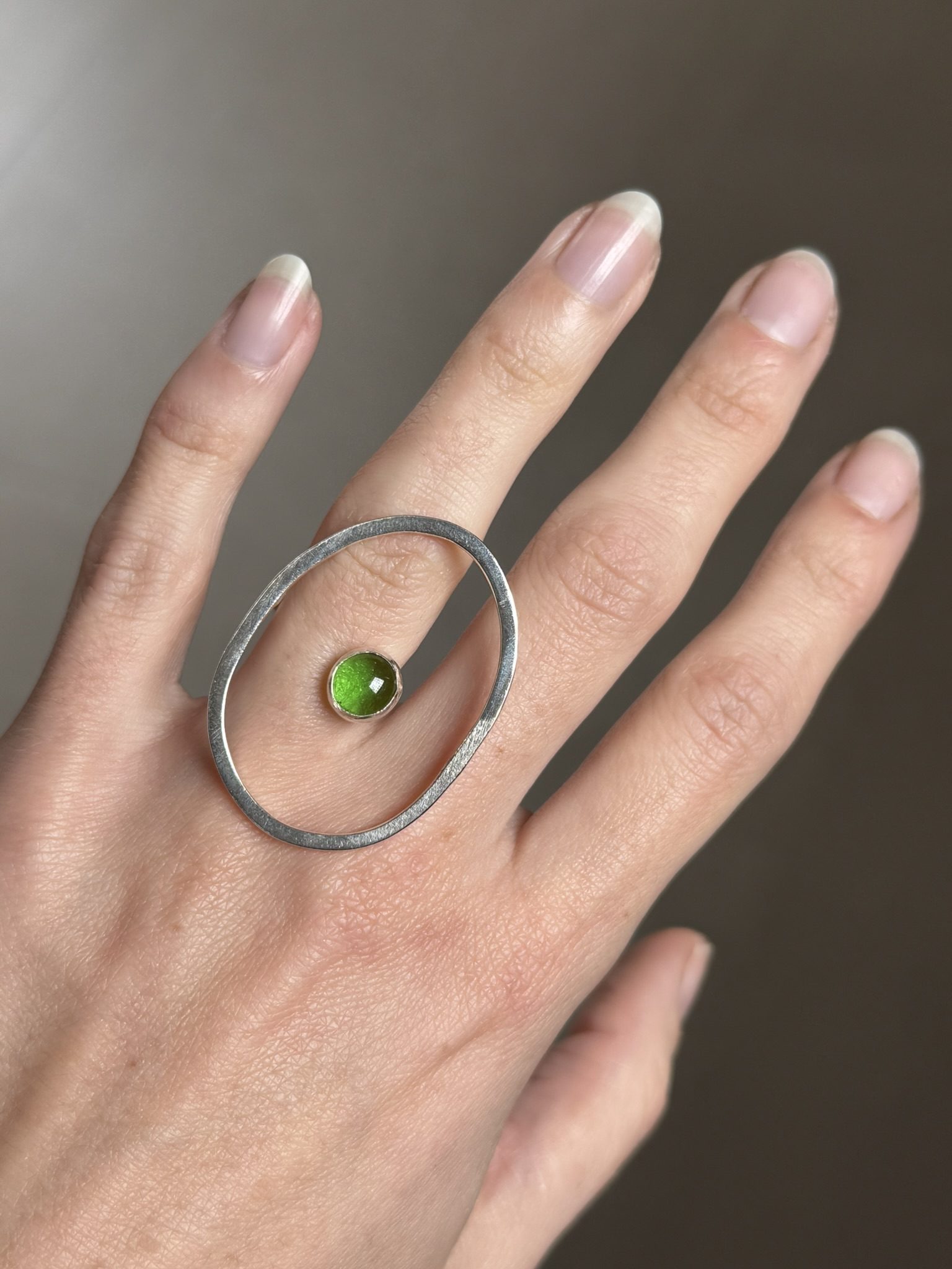 Anillo con vidrio reciclado en forma de cabujón. Este diseño es ligeramente ajustable. Si no encuentras tu talla, selecciona la opción de «otra» e indica los detalles en el campo de notas del checkout. Si no conoces tu medida, consulta en la guía de tallas.