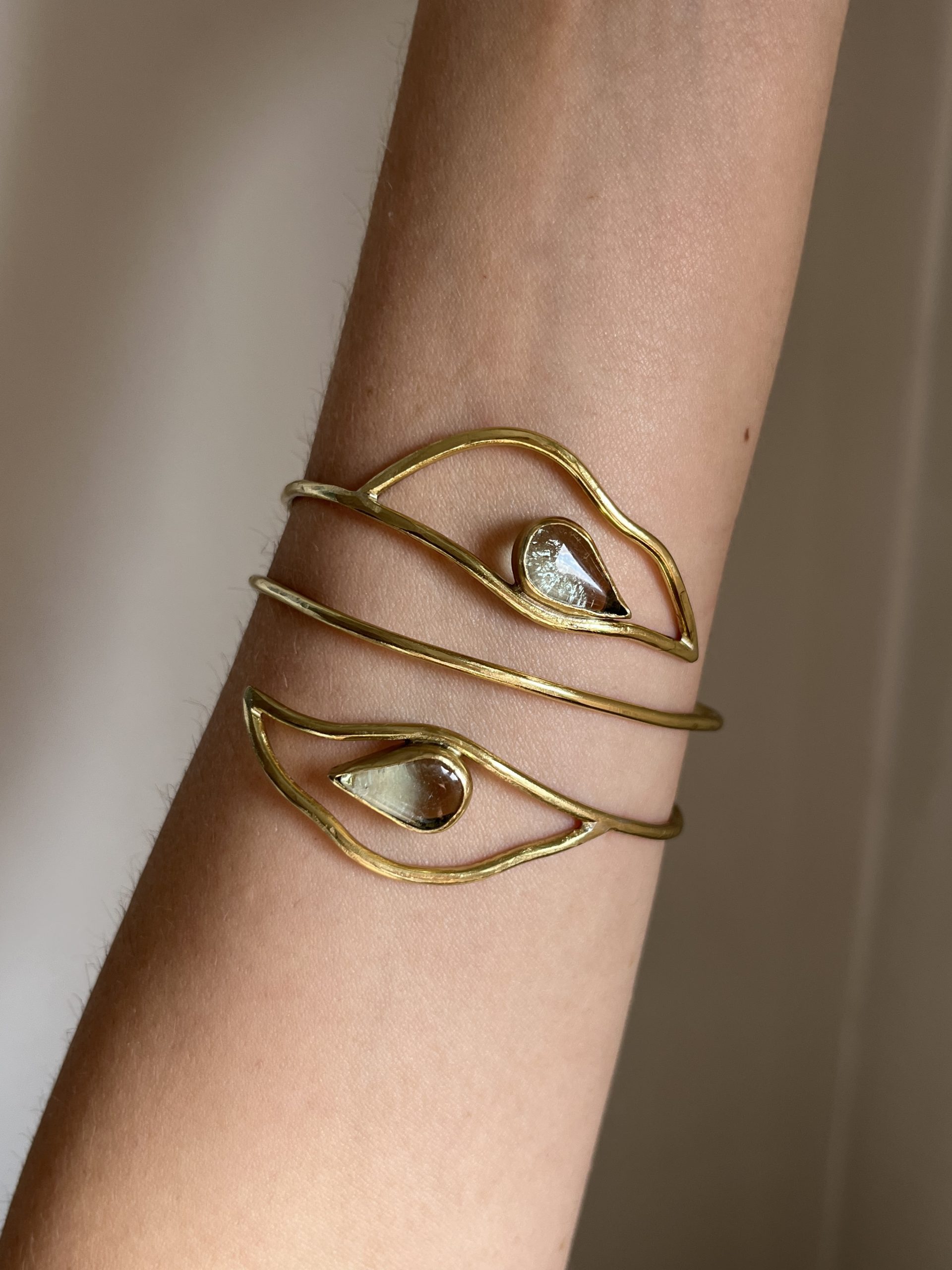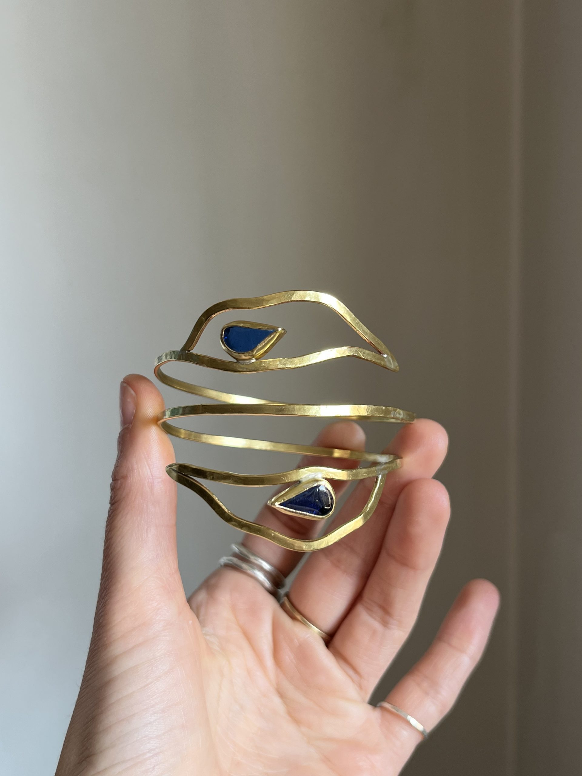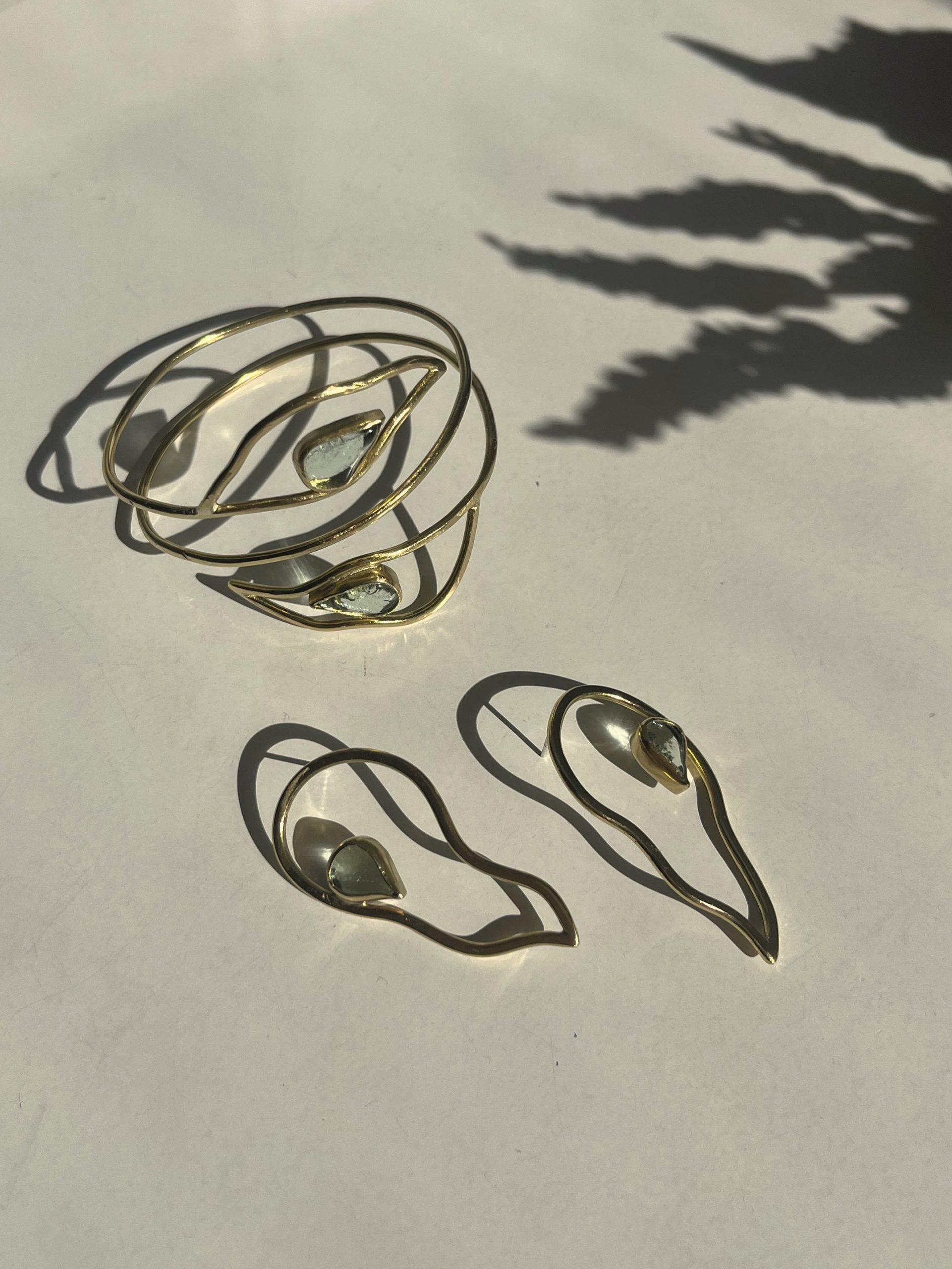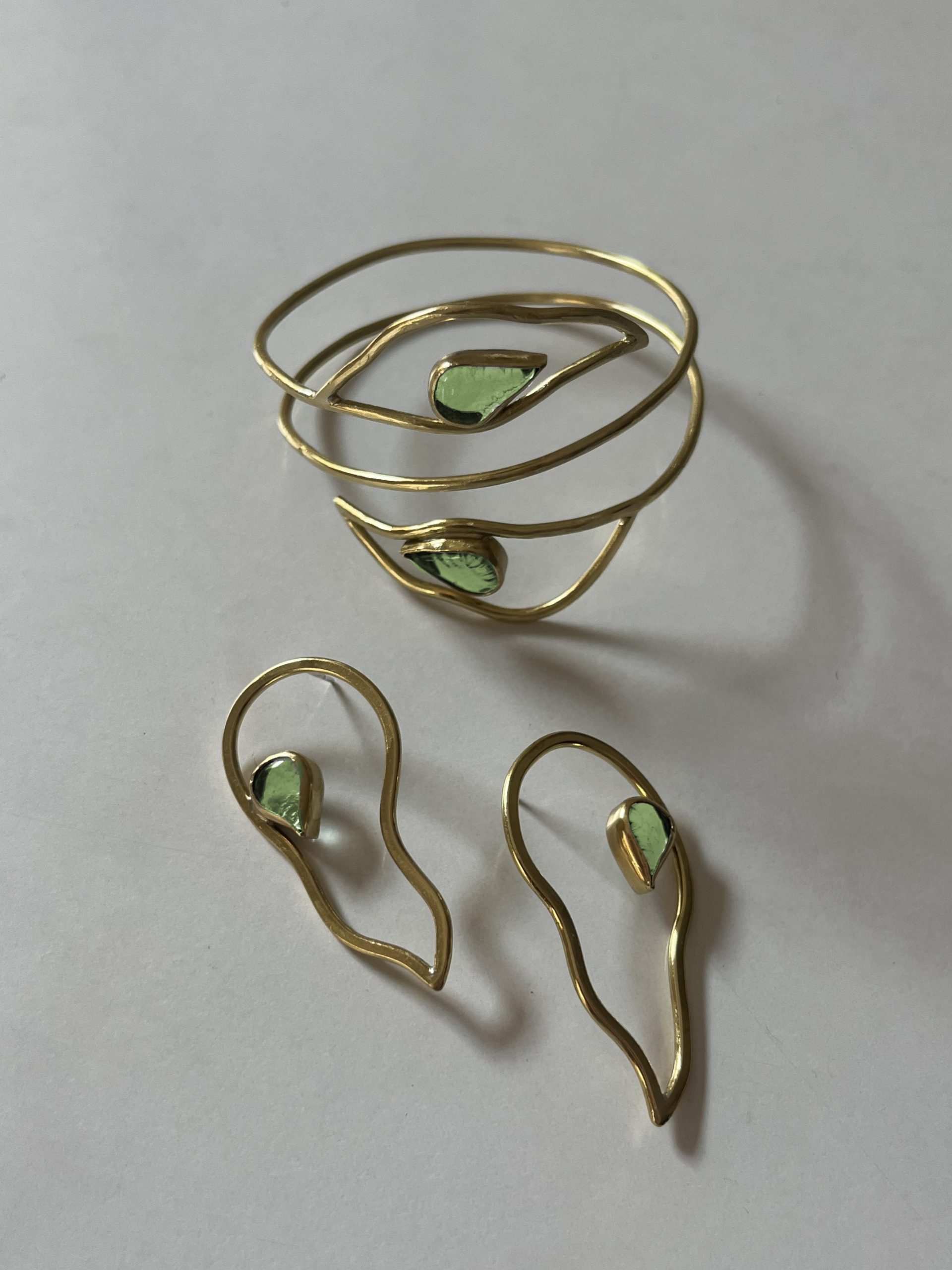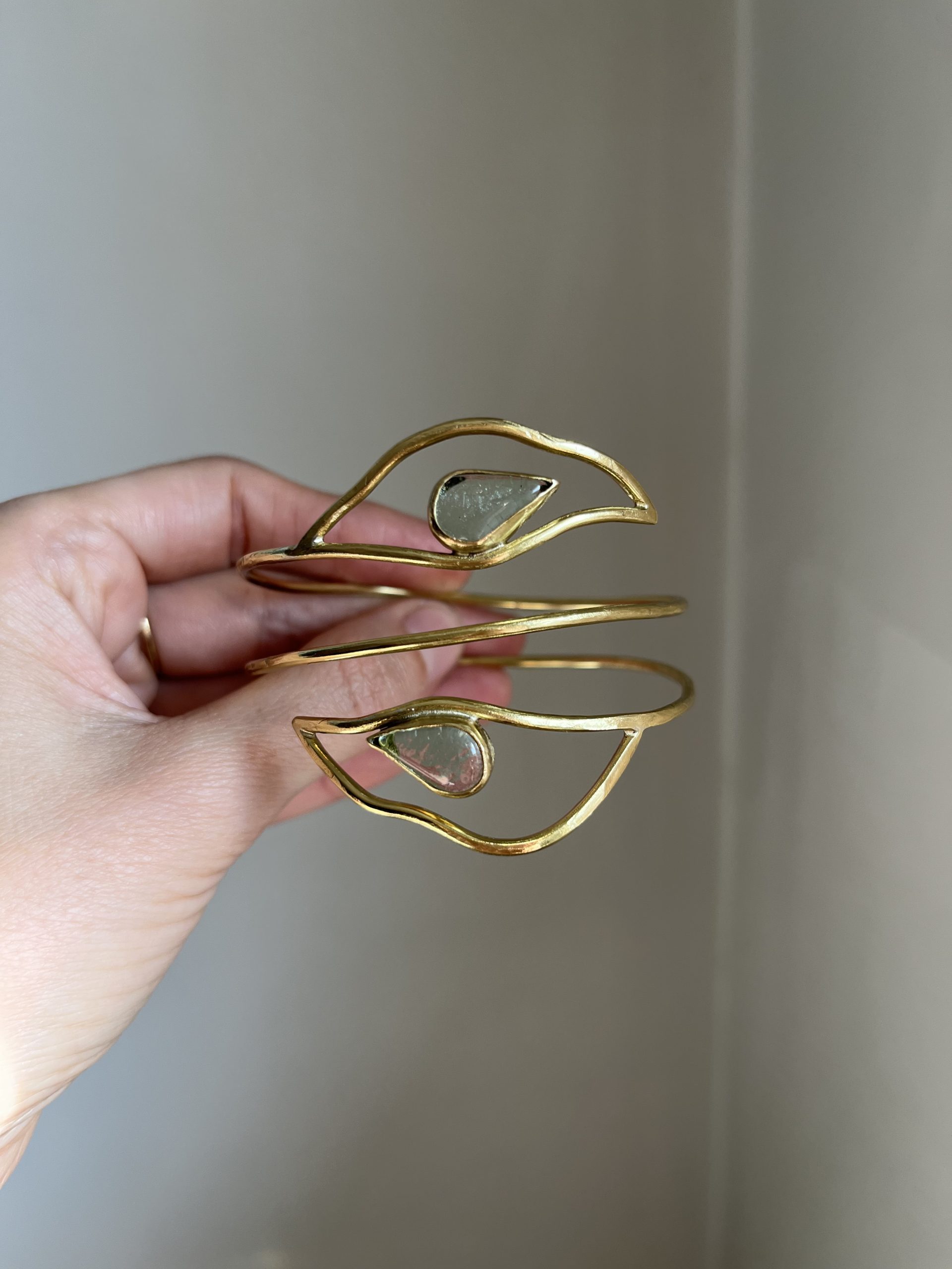 Brazalete con vidrios reciclados y forma de hojas. Medida estándar de 23 cm de perímetro, puede ajustarse un poco y adaptarse a la forma del brazo. Si necesitas una medida en concreto puedes comentármelo en el campo de notas del check out.