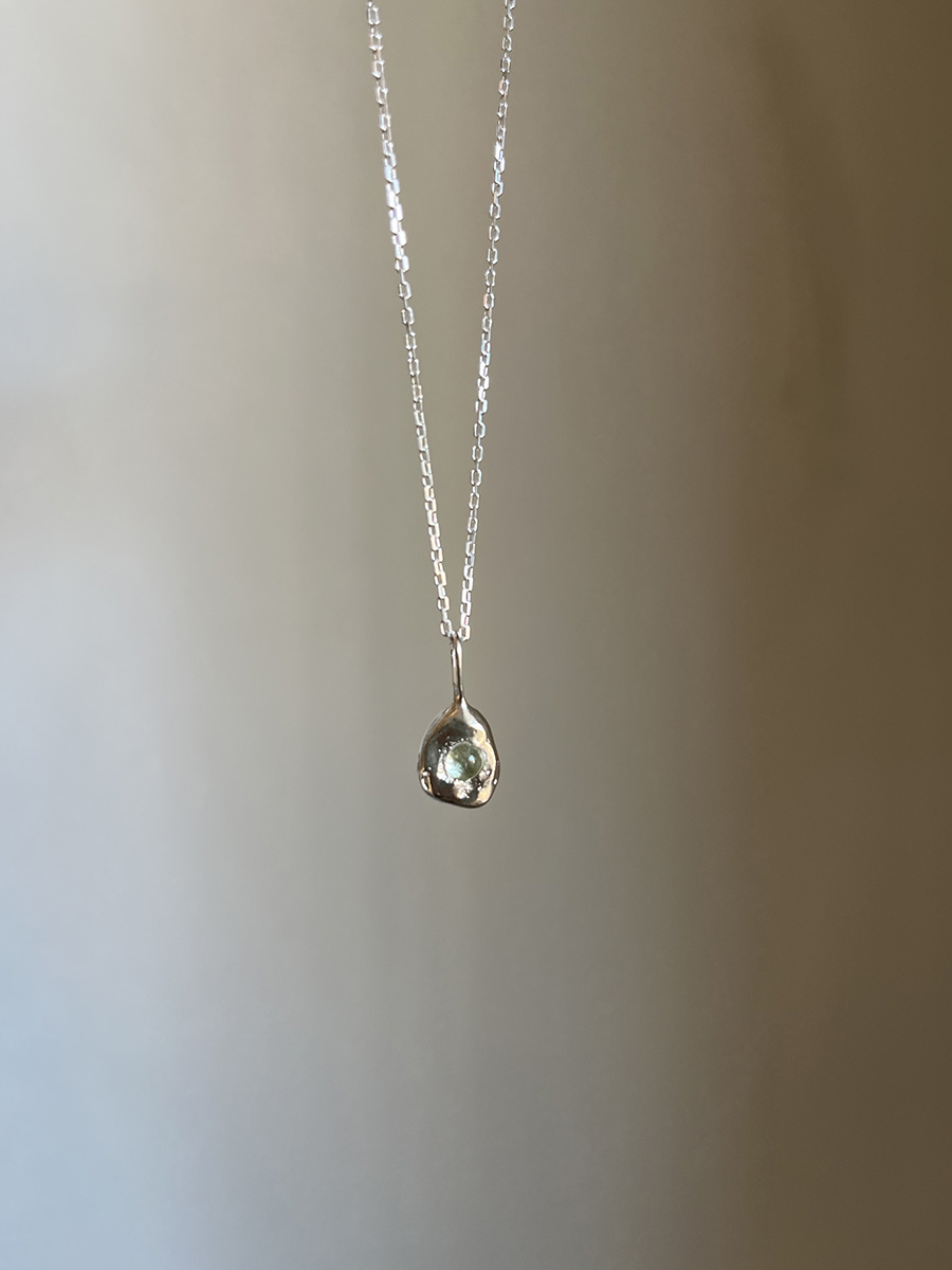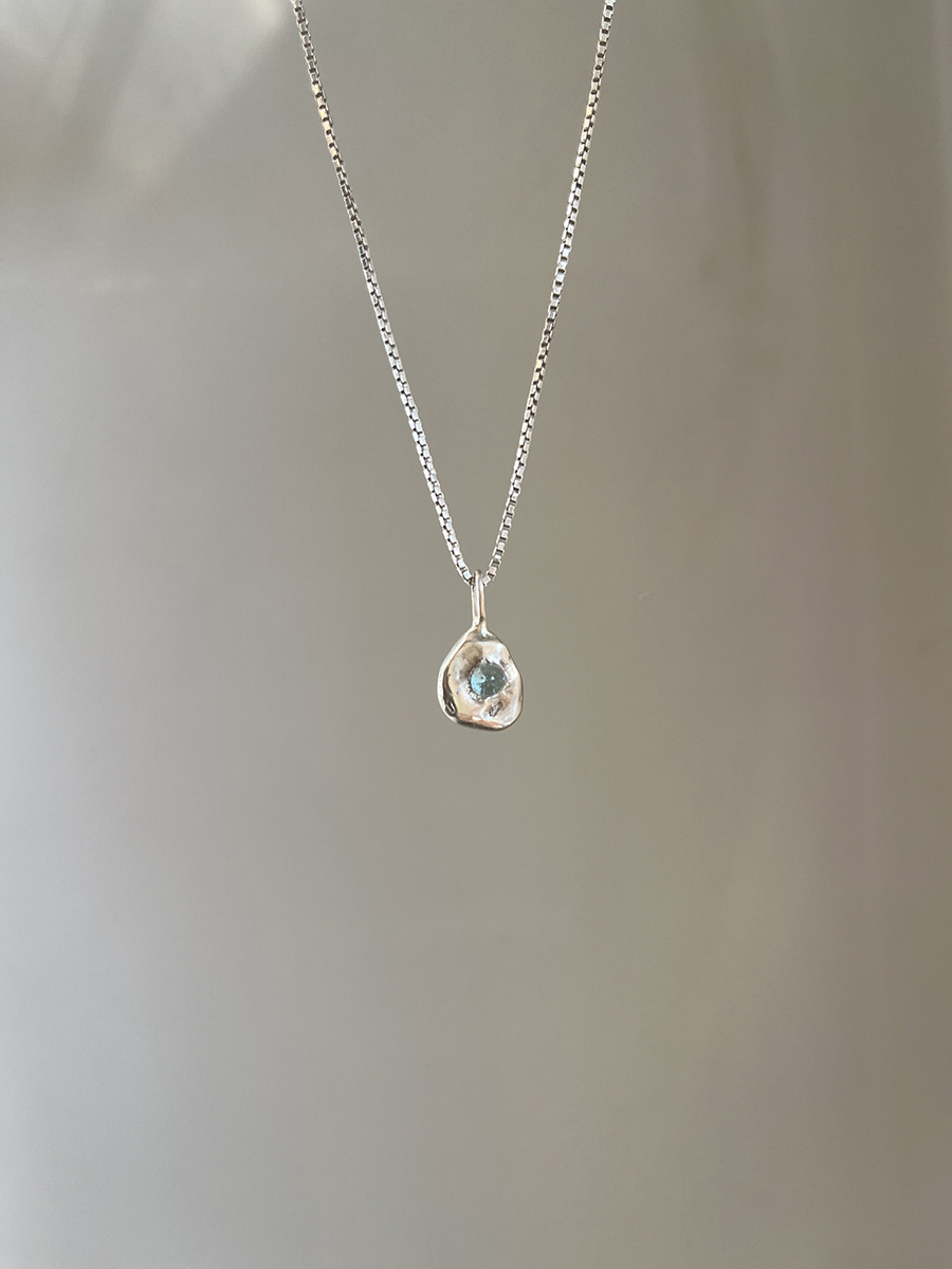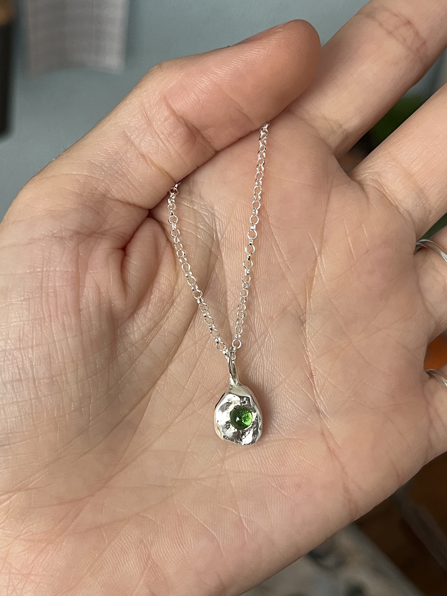 Colgante con un pequeño vidrio reciclado «incrustado» en plata de textura orgánica. Este diseño está realizado mediante diferentes procesos artesanales, lo que hace cada pieza única con sus pequeñas diferencias.