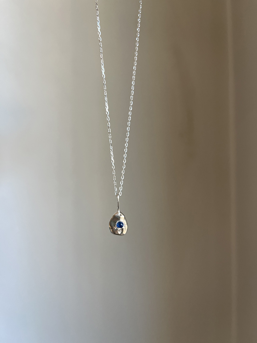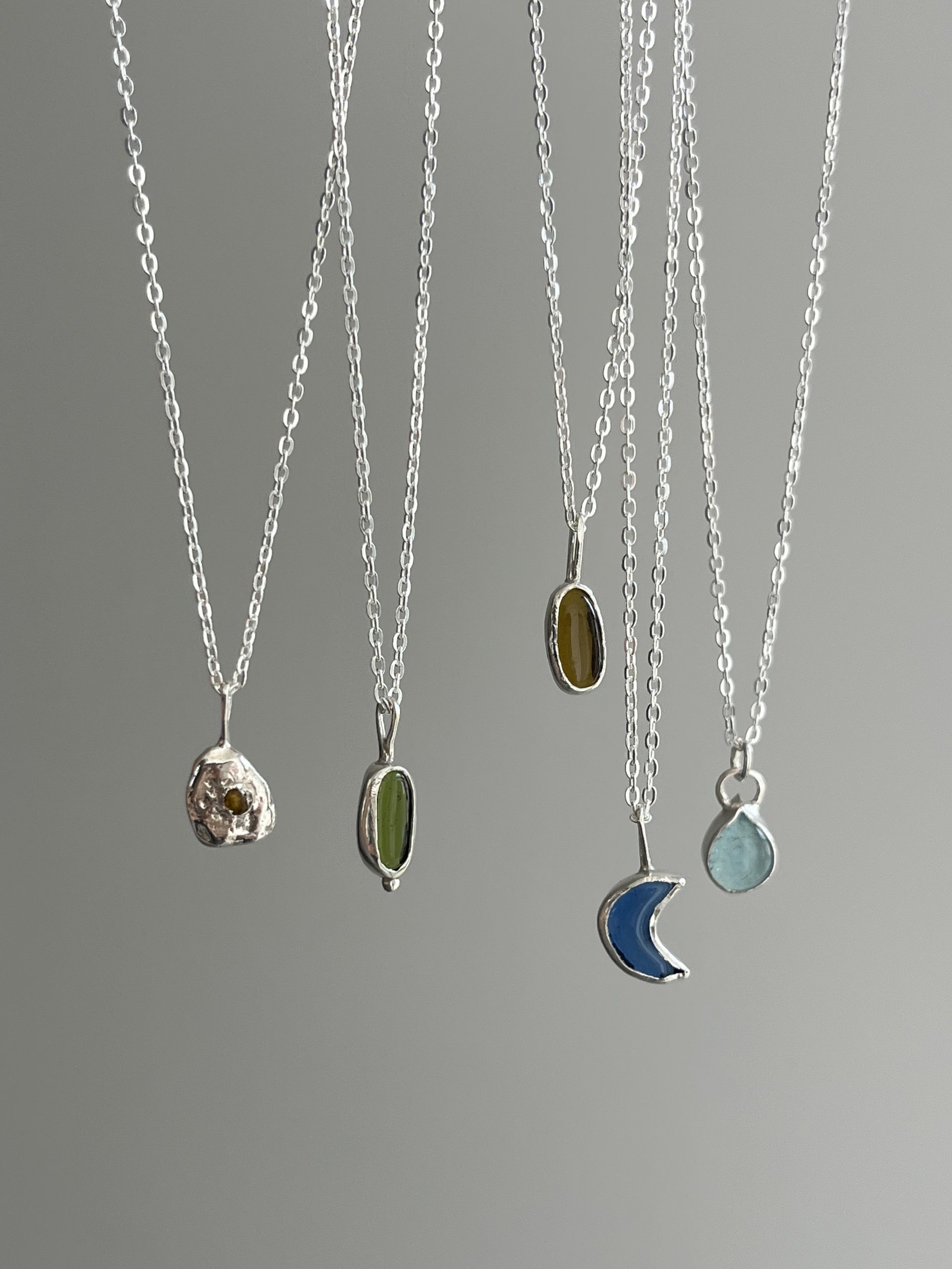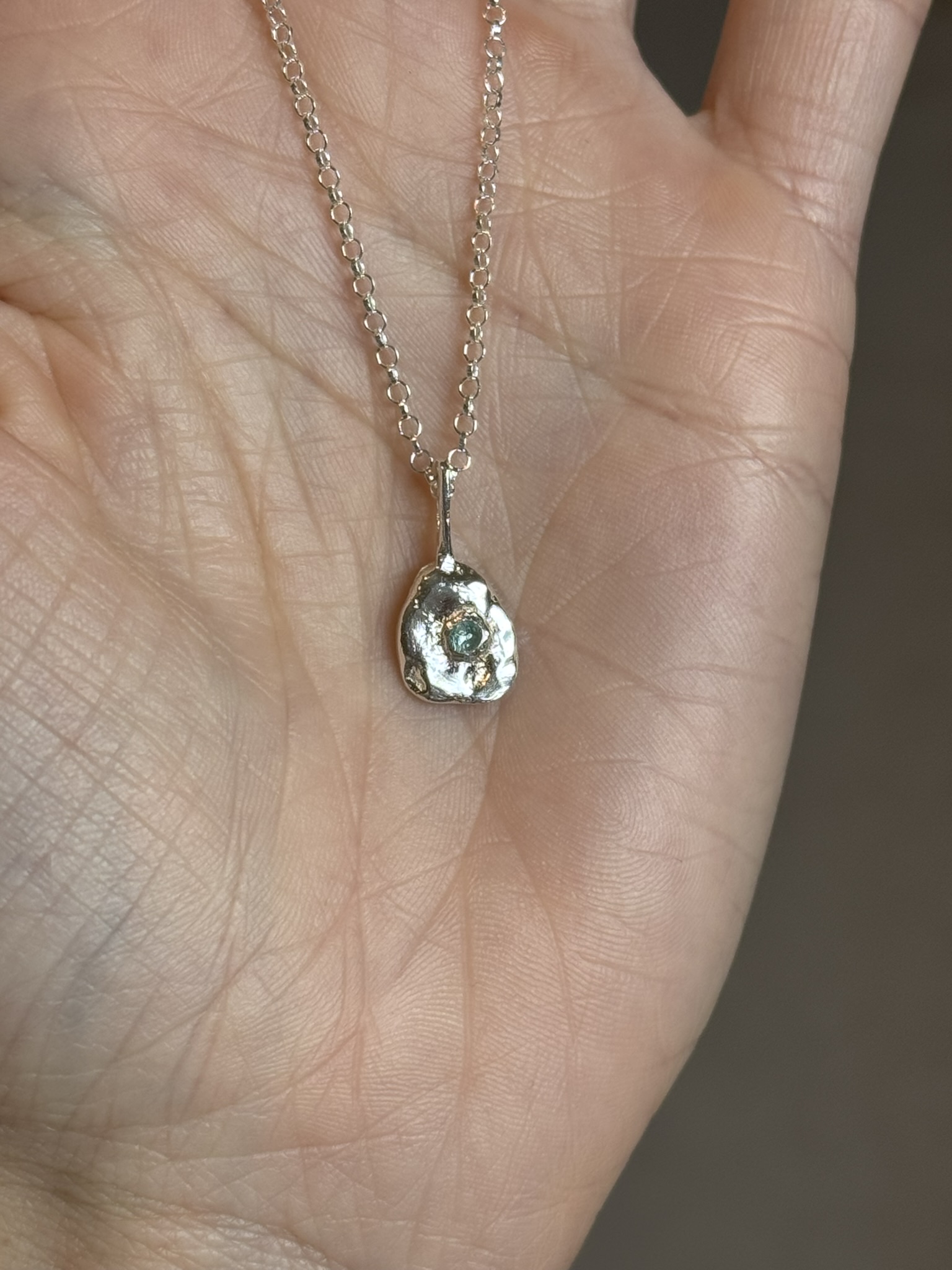 Colgante con un pequeño vidrio reciclado «incrustado» en plata de textura orgánica. Este diseño está realizado mediante diferentes procesos artesanales, lo que hace cada pieza única con sus pequeñas diferencias.