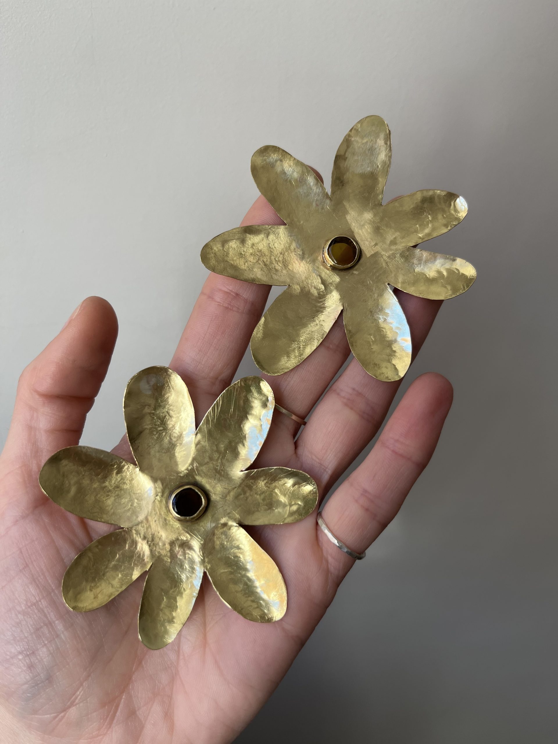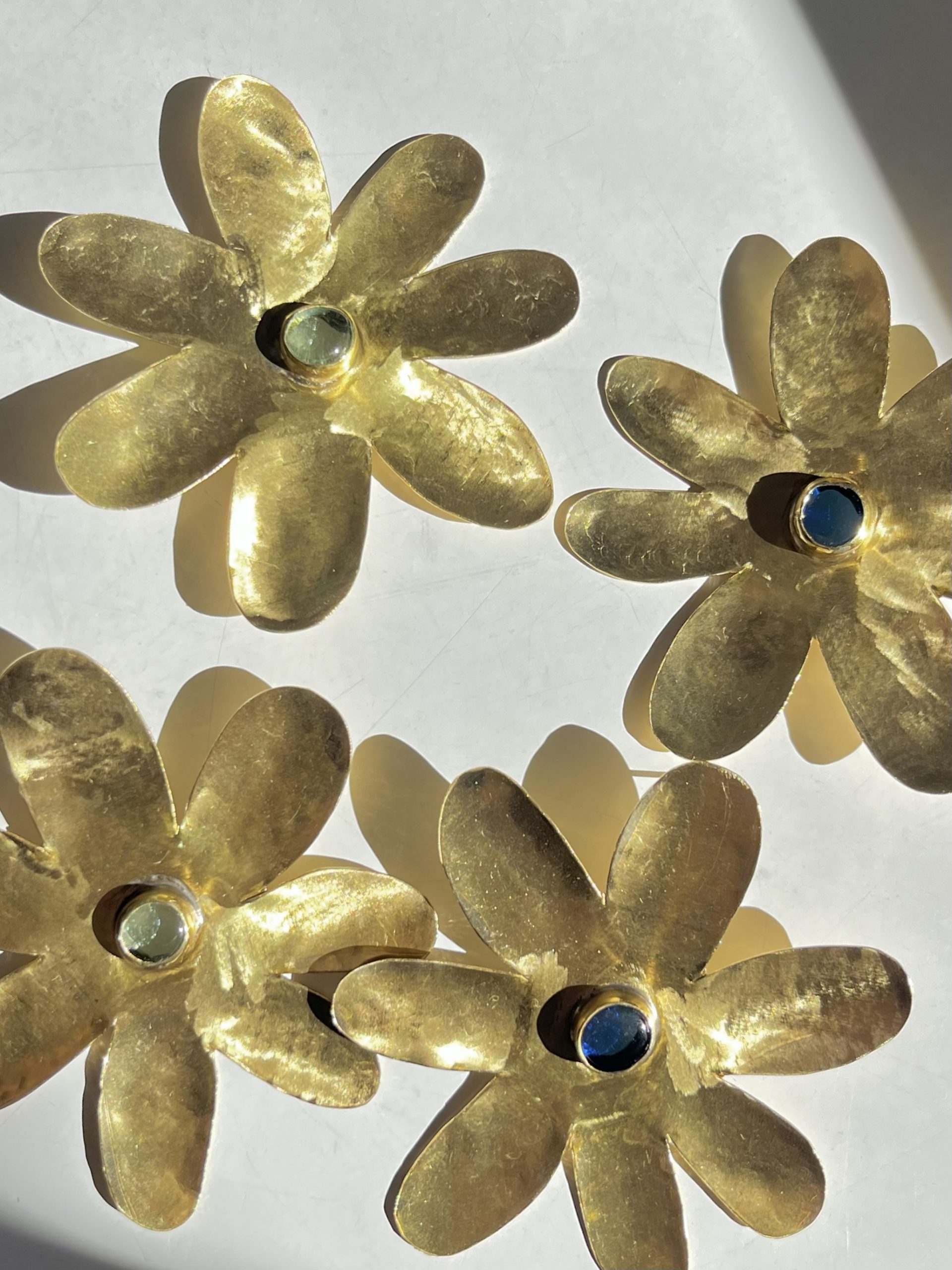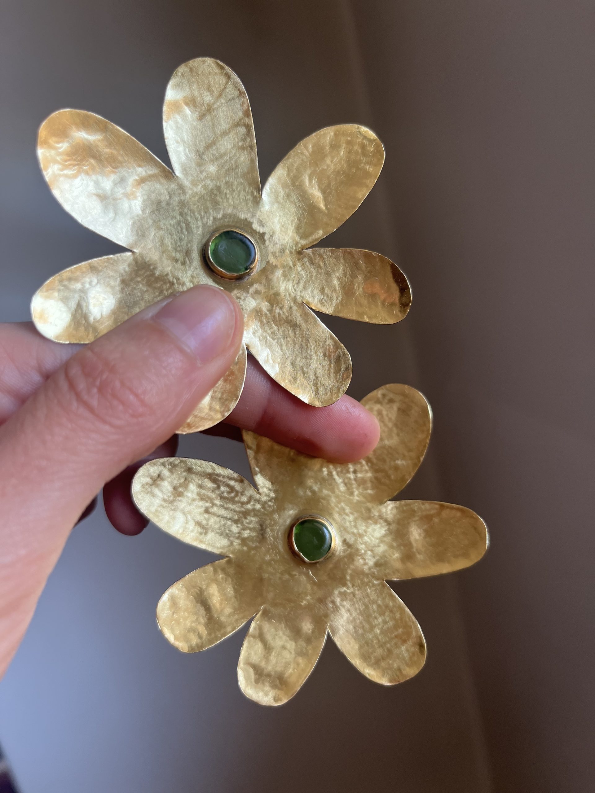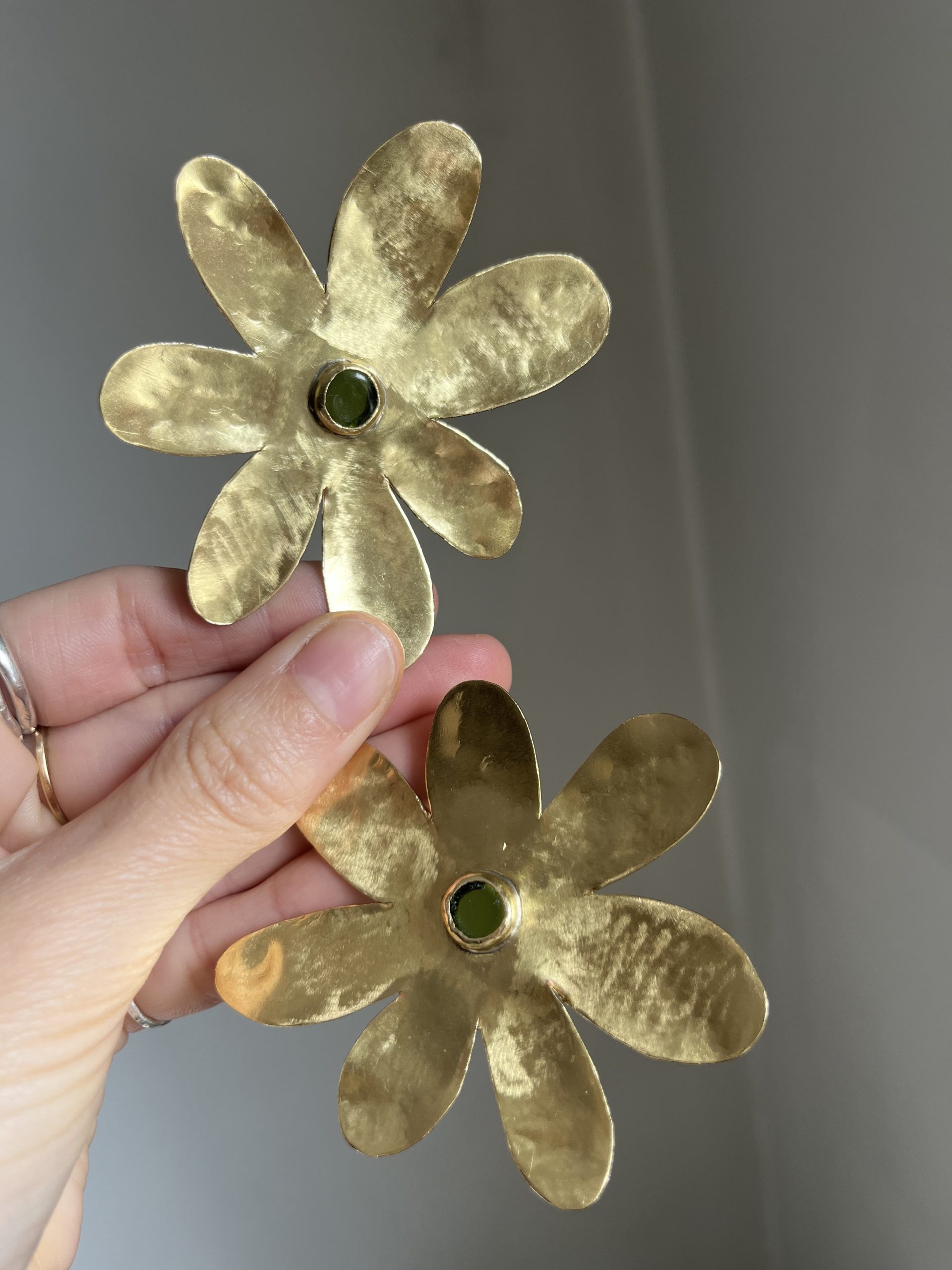 Pendientes pendientes con forma de flor y con vidrio reciclado, tallado y pulido artesanalmente. Longitud 7 cm, con el palito y la tuerca de plata.