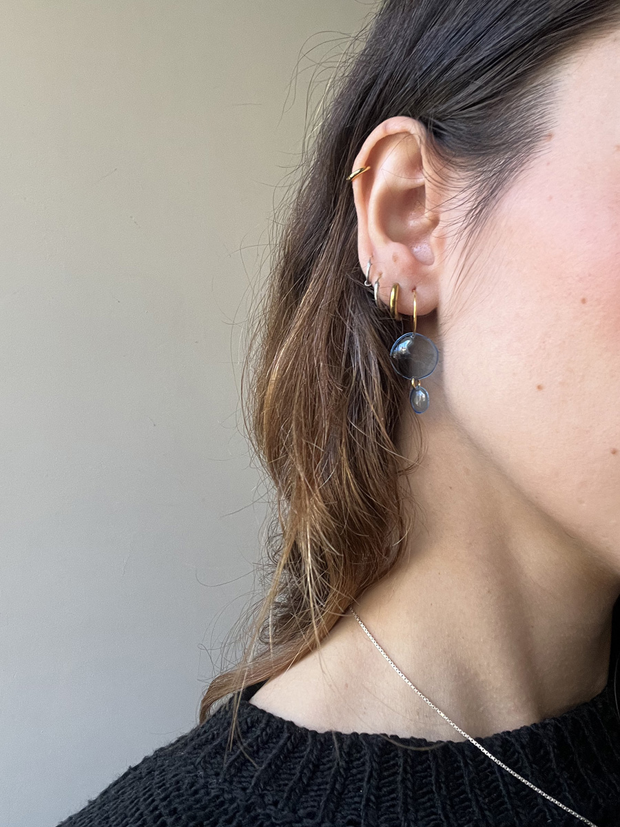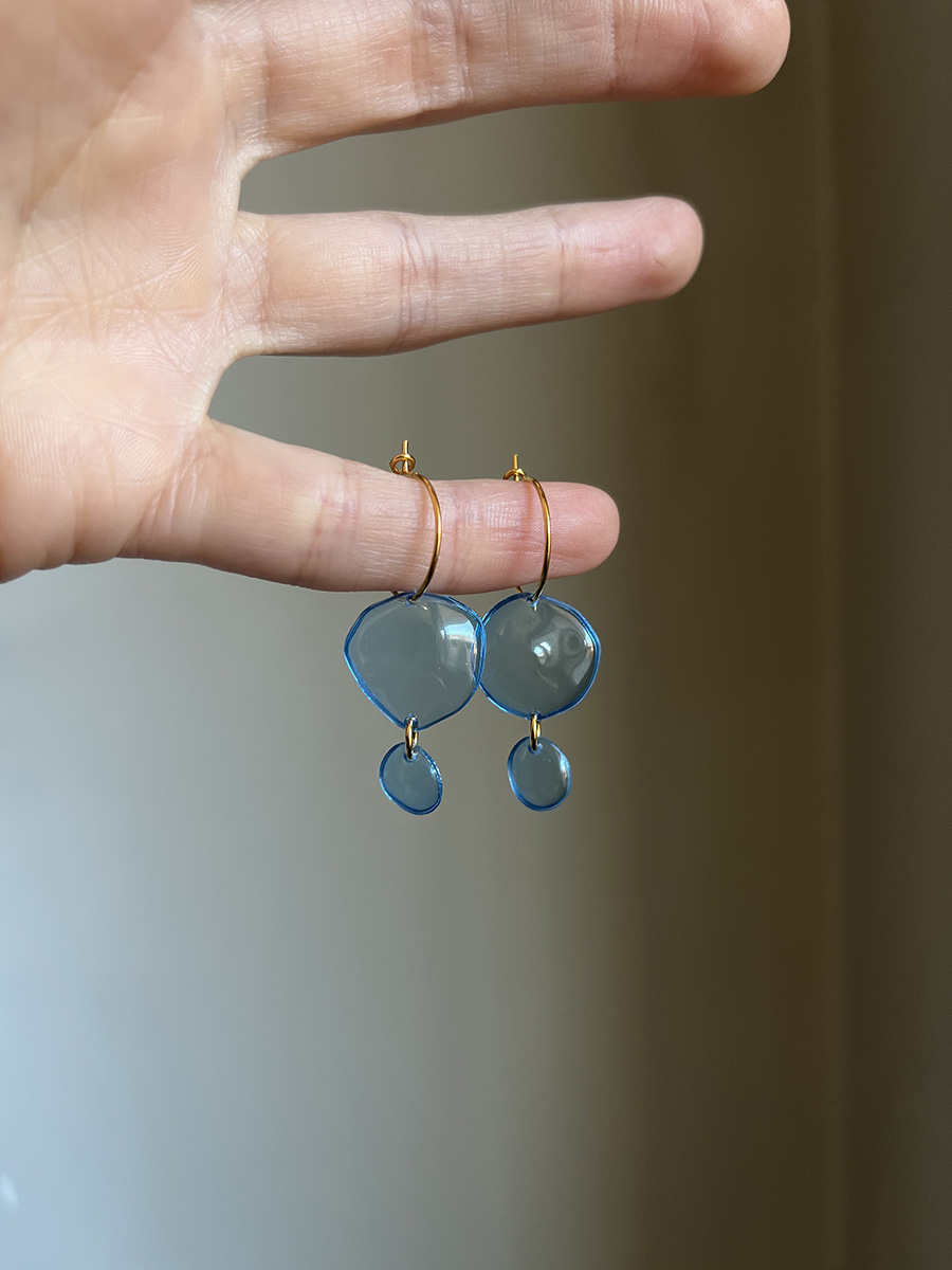 Pendientes de plástico PET reciclado con aritos de 15 mm y longitud total de 4 cm. Cada pieza está hecha de forma artesanal, por lo que puede haber pequeñas diferencias entre ellas.