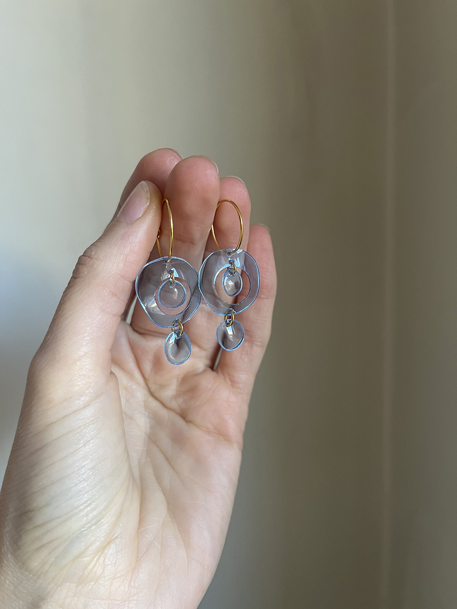 Pendientes de plástico PET reciclado, longitud de 4 cm. Cada pieza está hecha de forma artesanal, por lo que puede haber pequeñas diferencias entre ellas.