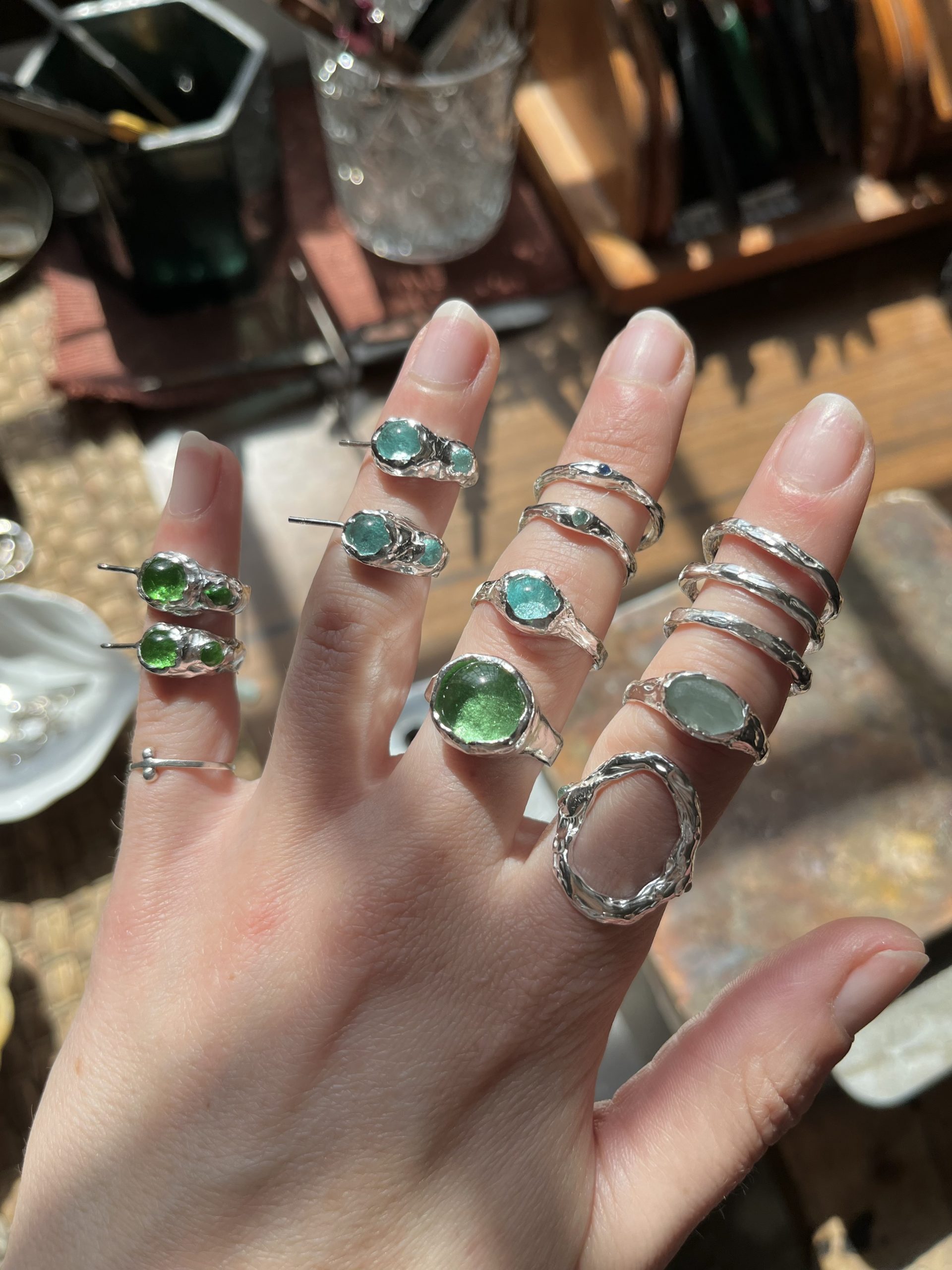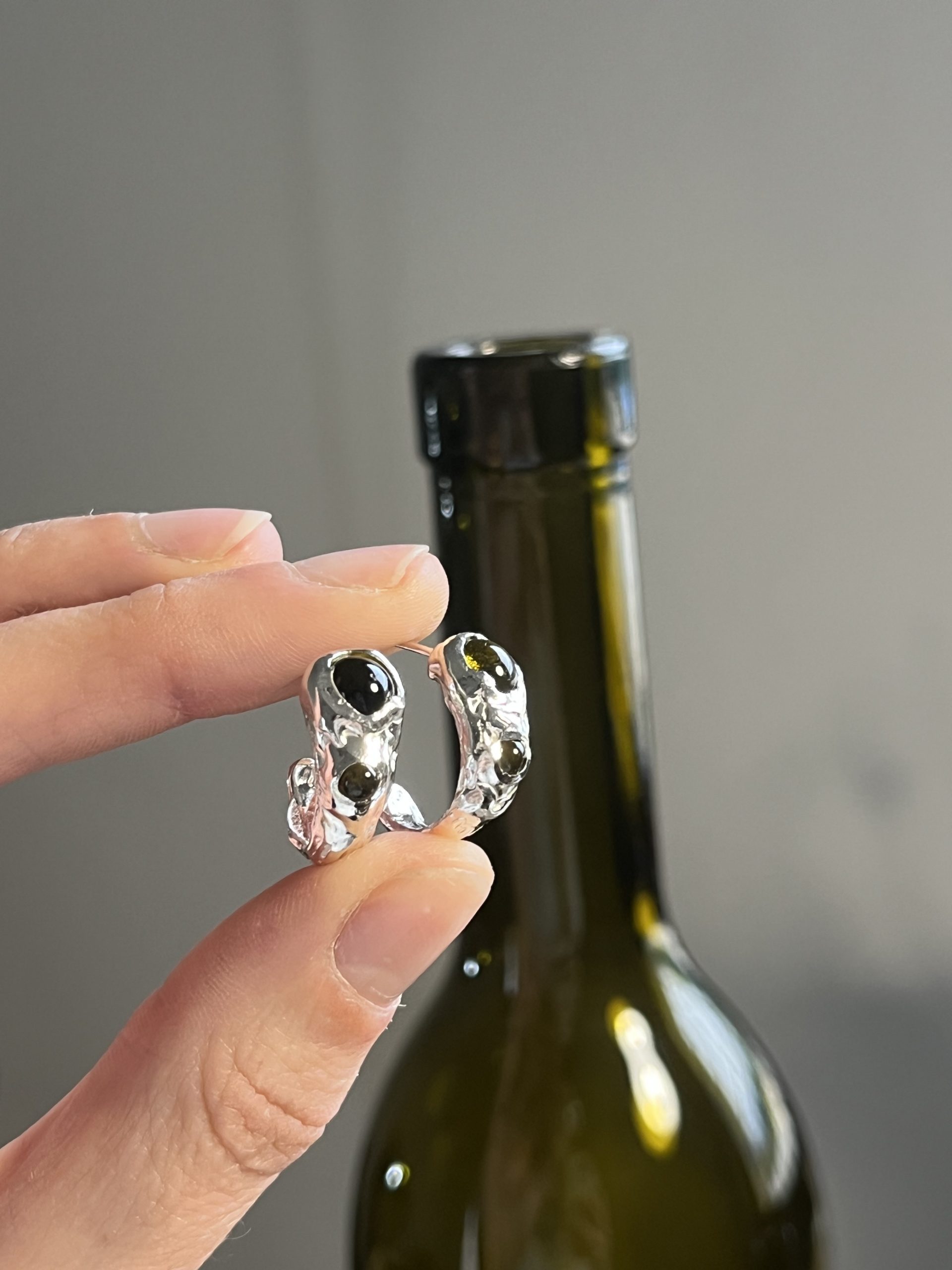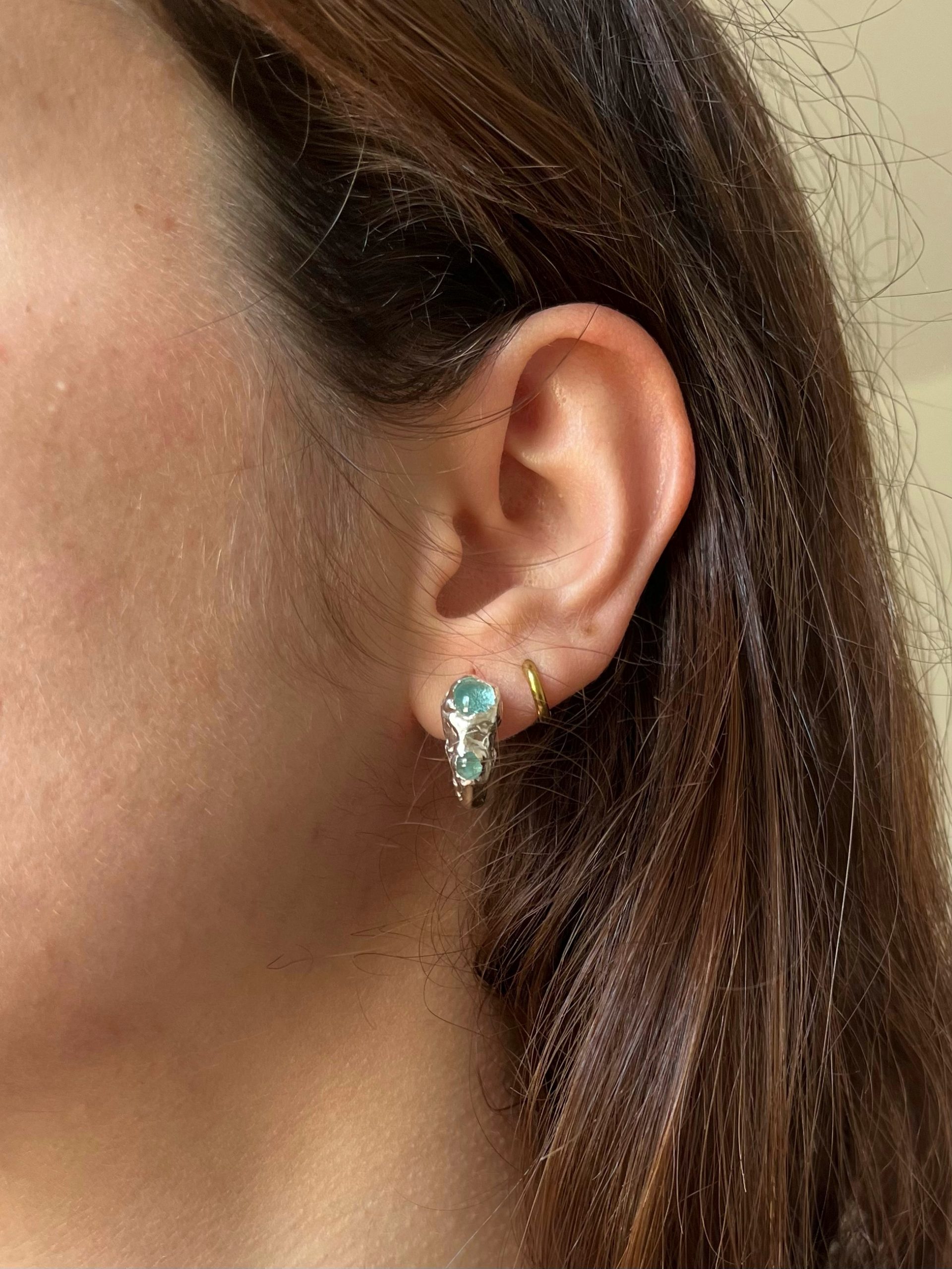 Pendientes de plata, con forma de aro, textura orgánica y vidrios reciclados.